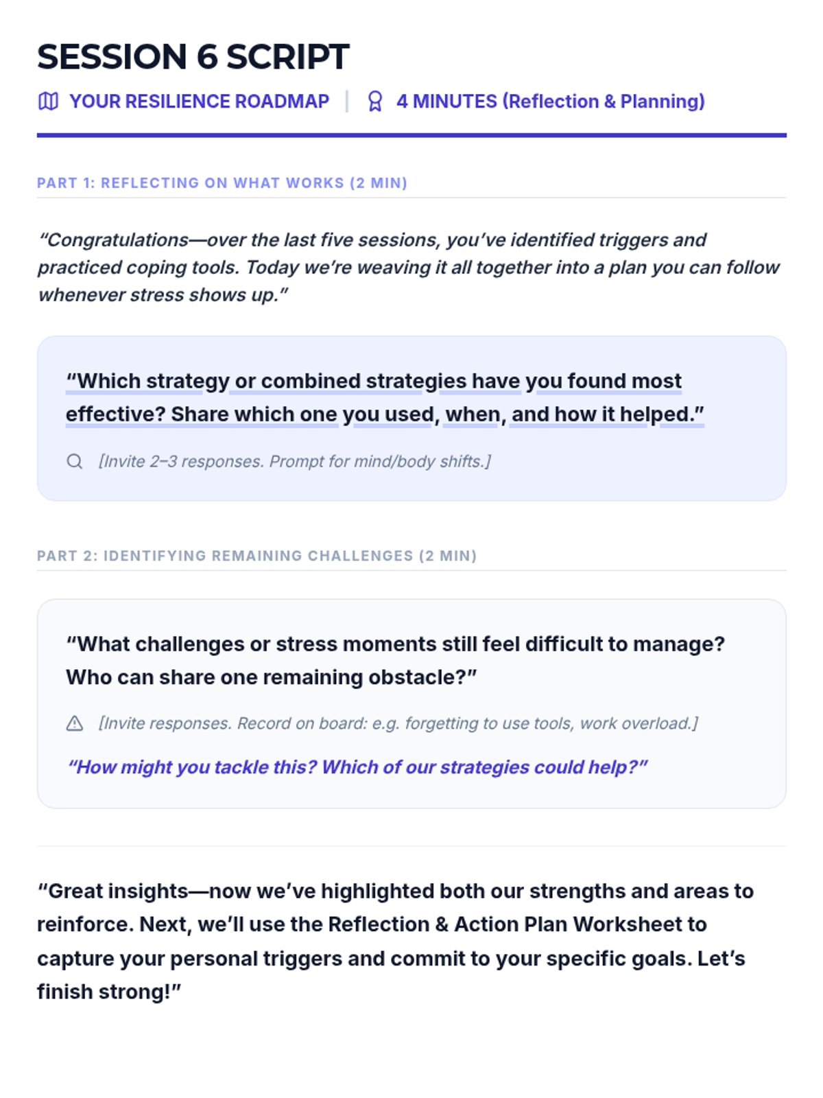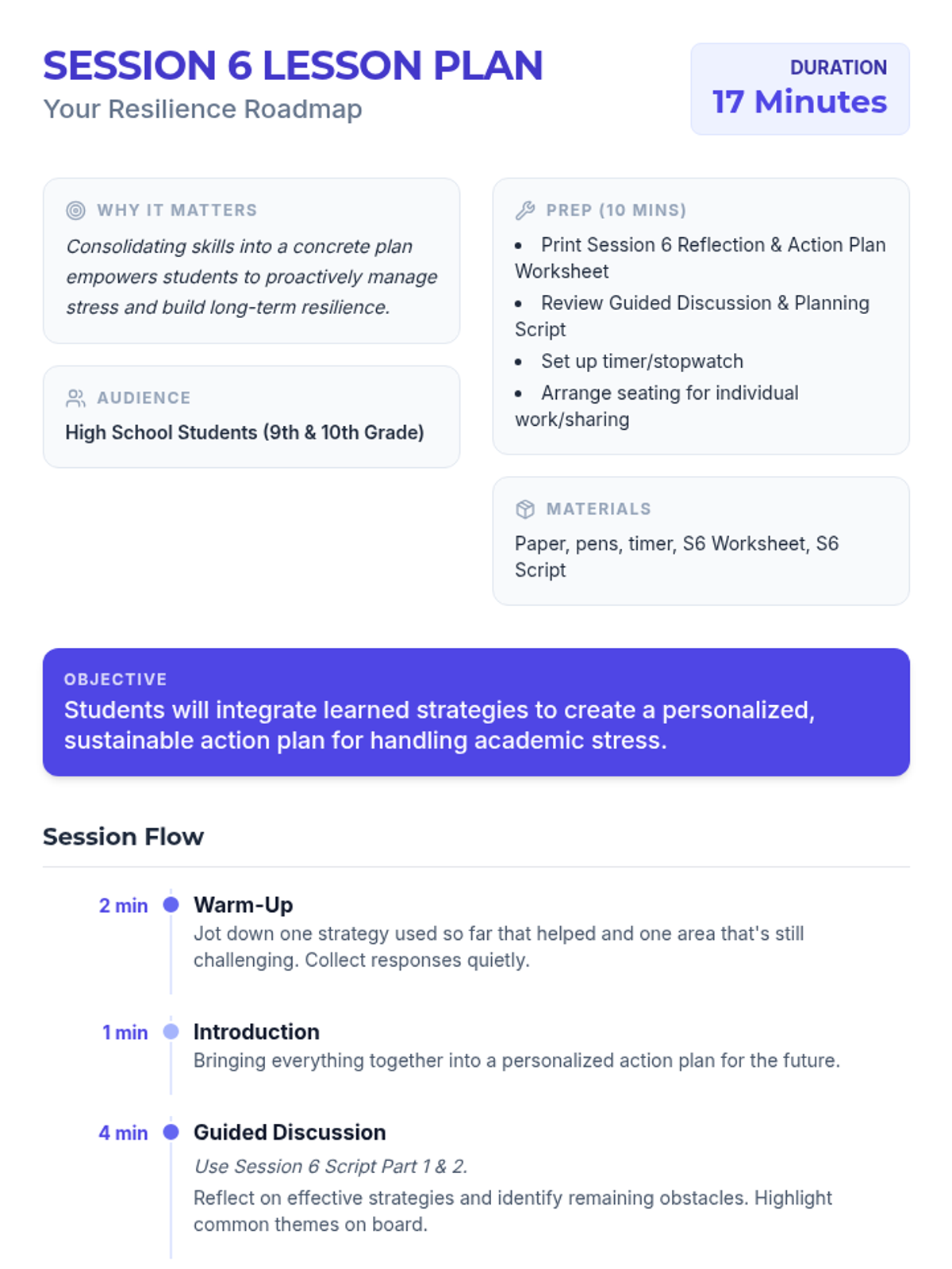Students consolidate their learning into a personalized, long-term stress management action plan.
