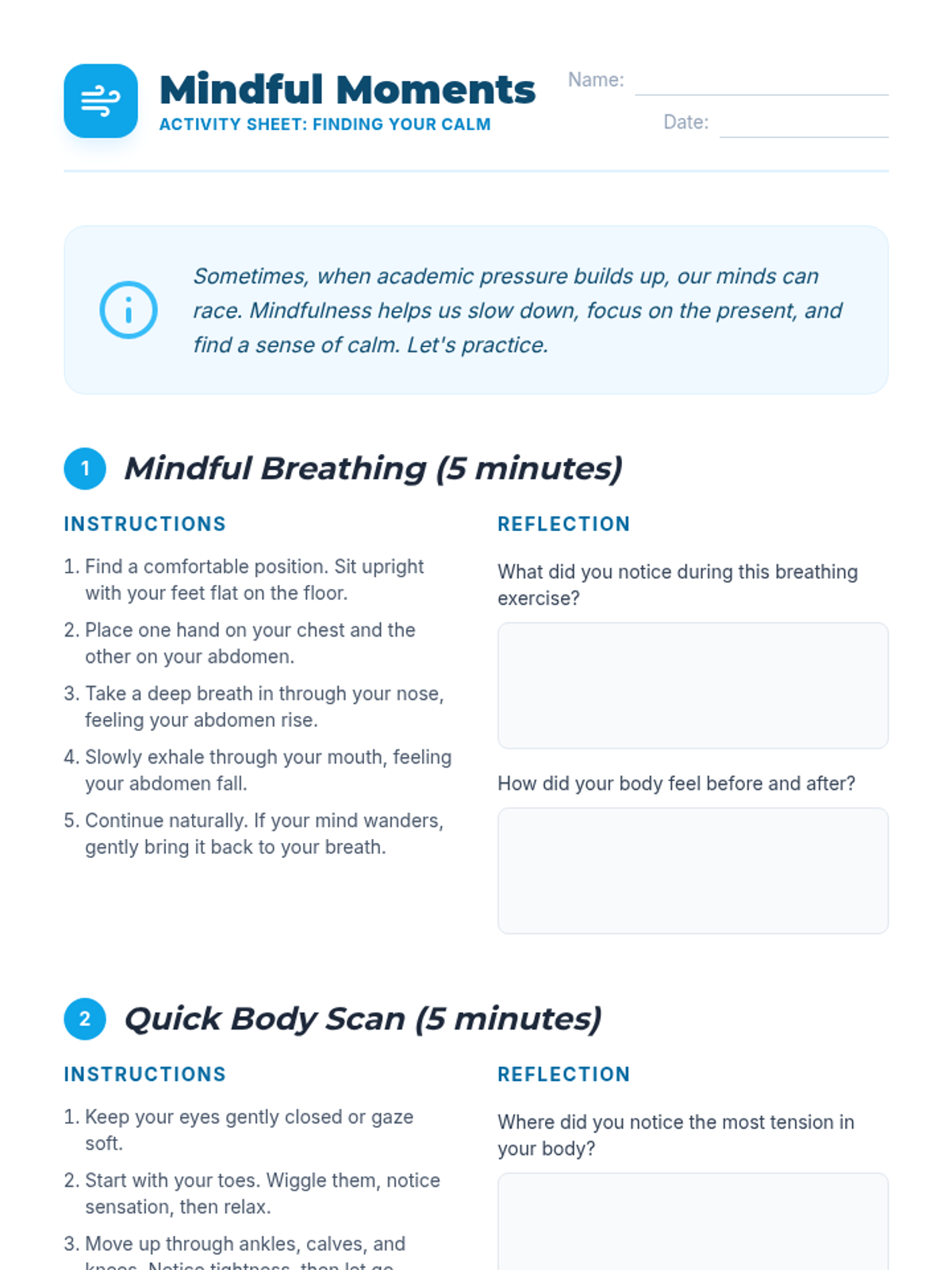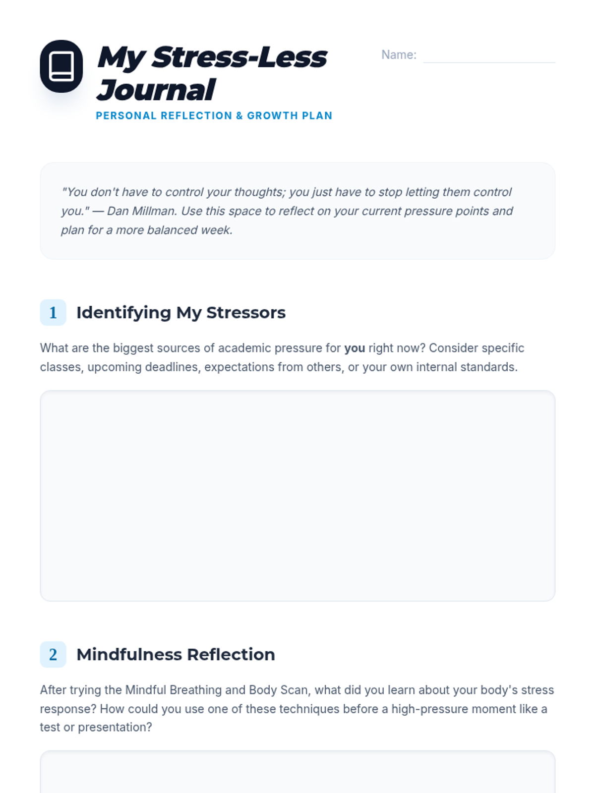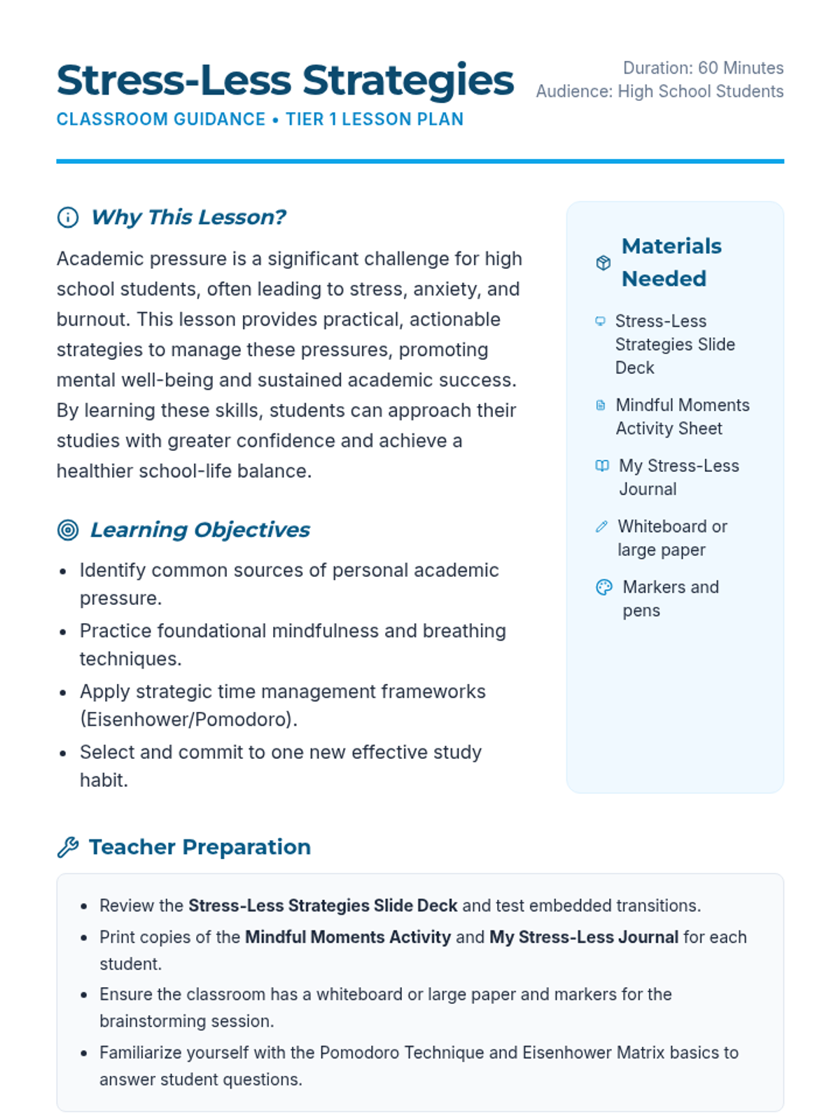 A 60-minute lesson designed to equip high school students with practical stress management techniques, including mindfulness, time management, and effective study habits.