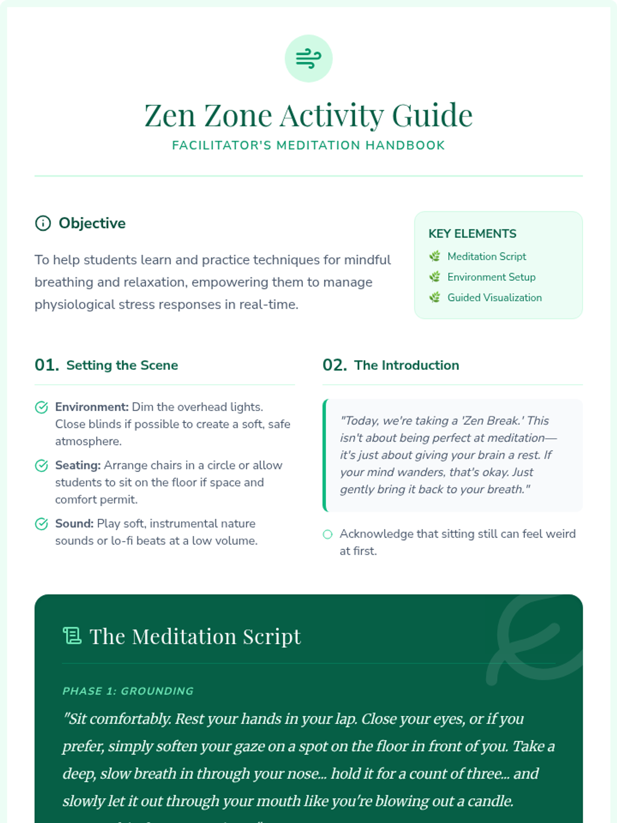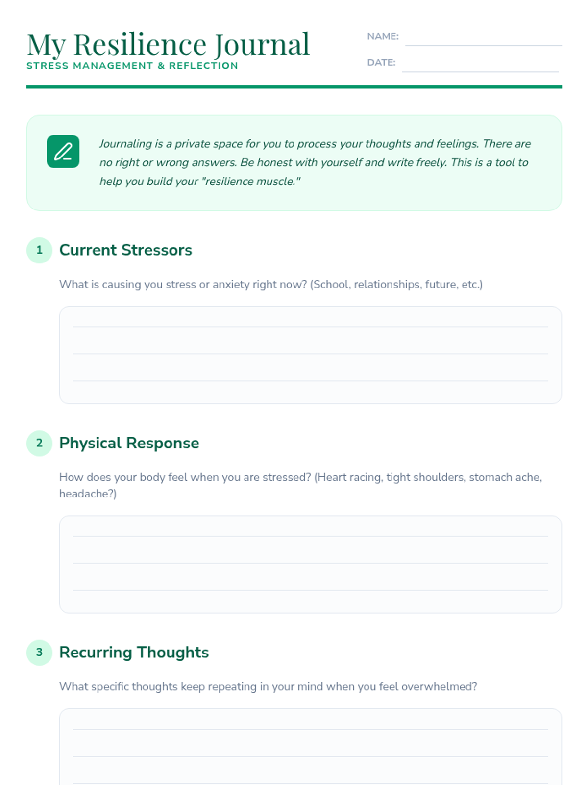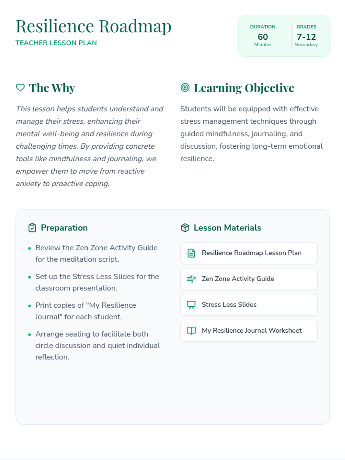 A comprehensive 60-minute lesson designed for grades 7-12 to explore stress management through mindfulness, guided meditation, and reflective journaling. Students will learn to identify stressors and build proactive resilience strategies.