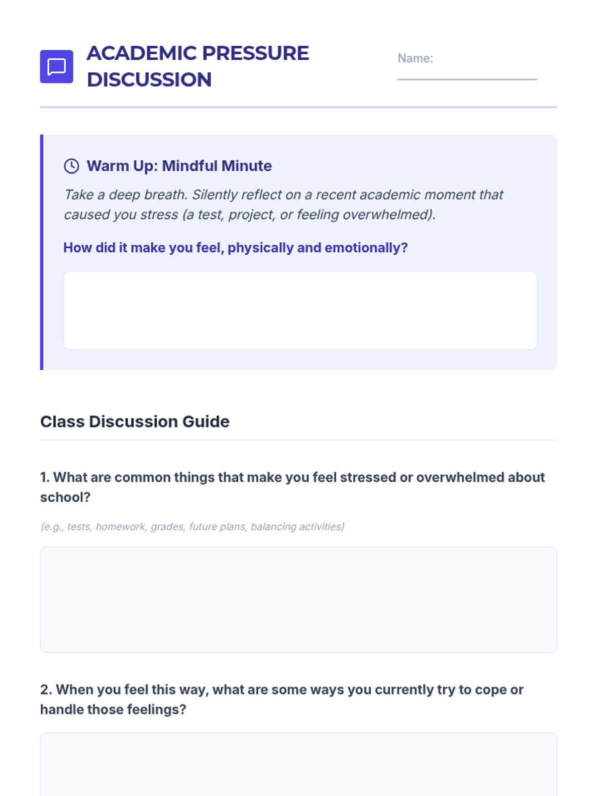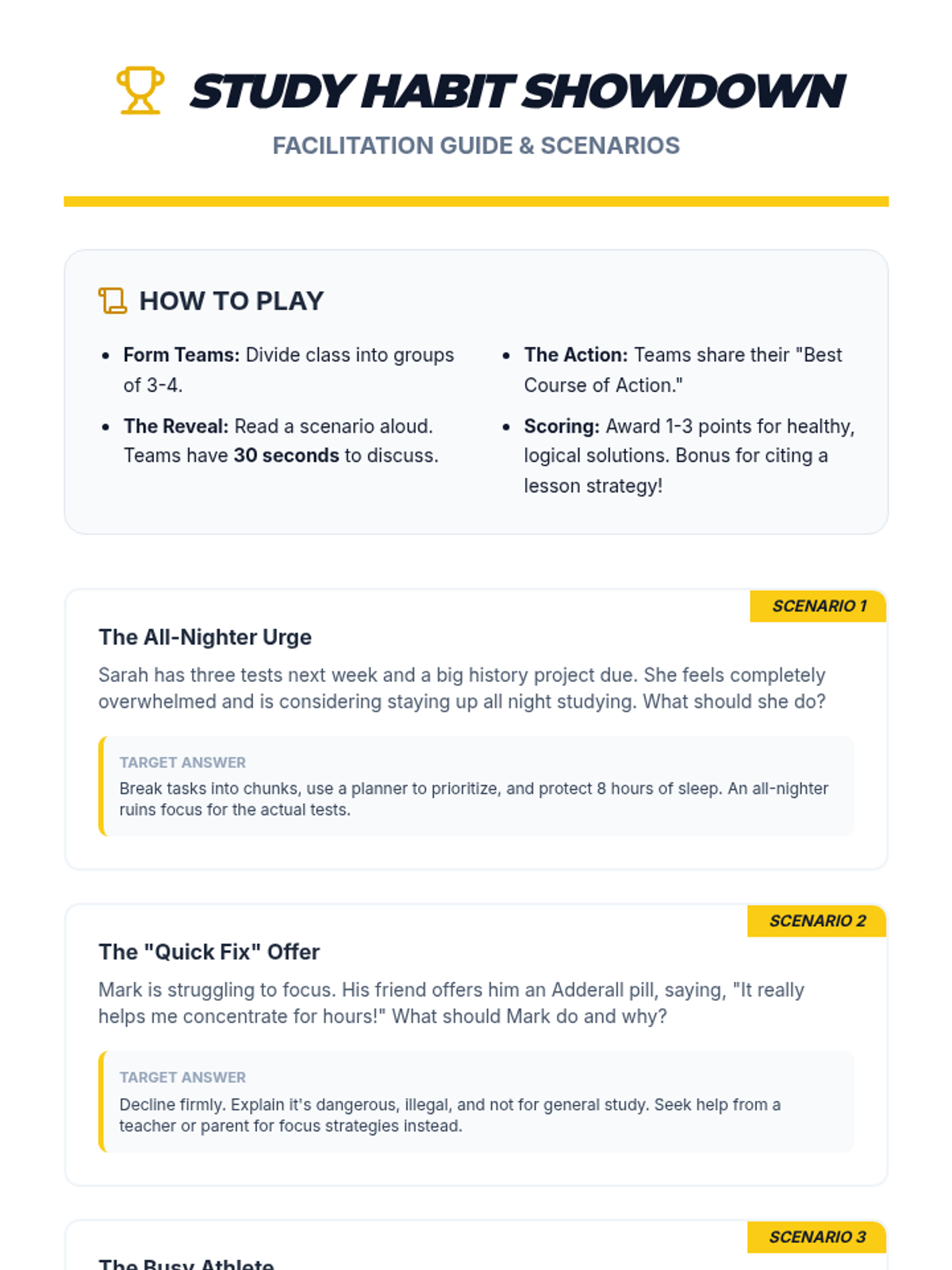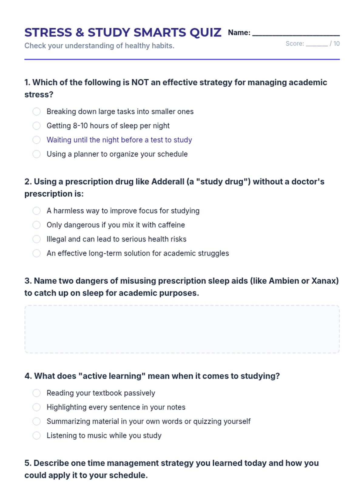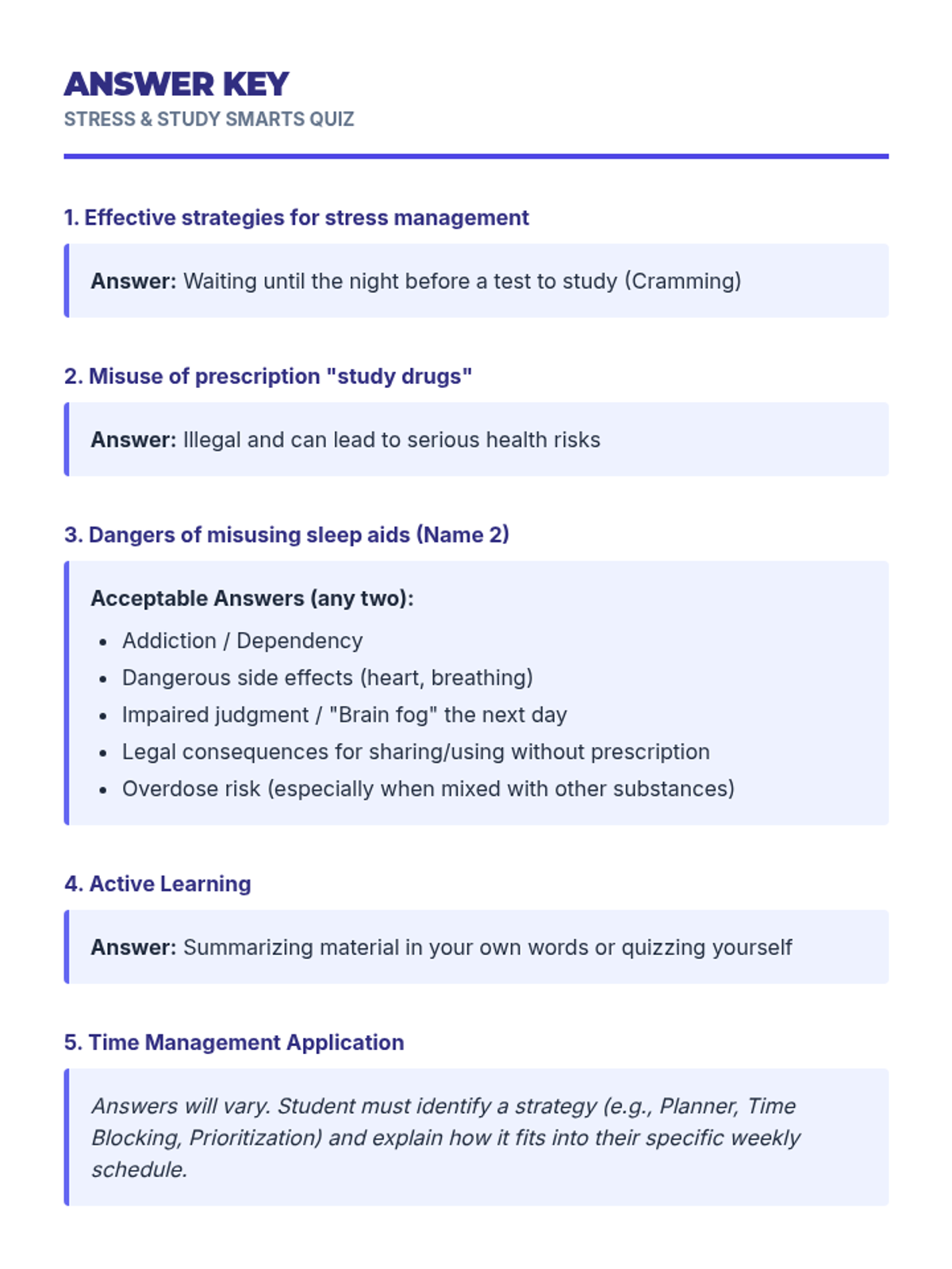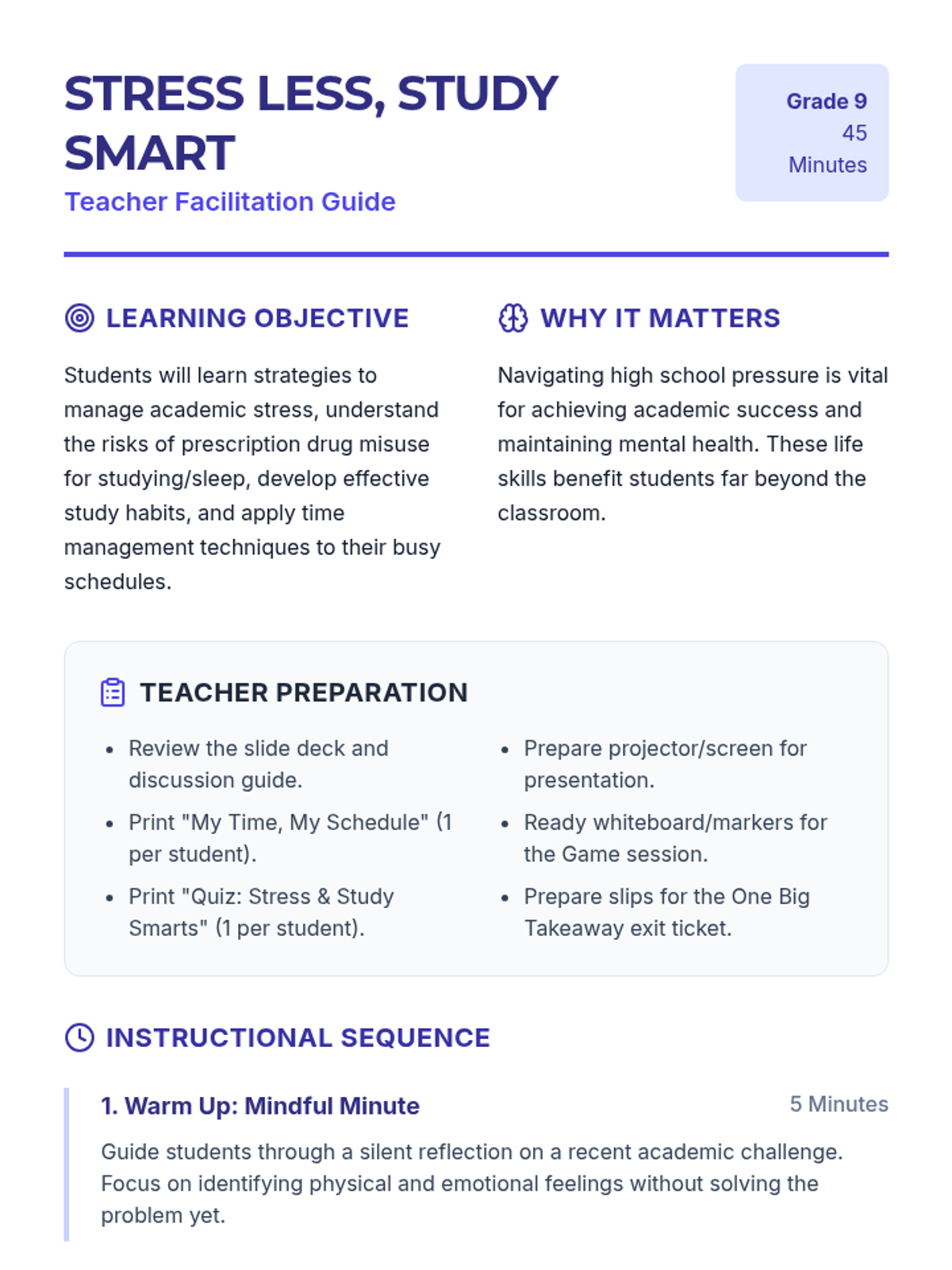 A comprehensive 45-minute lesson for 9th graders on managing academic stress, avoiding prescription drug misuse, and developing effective study and time management habits.