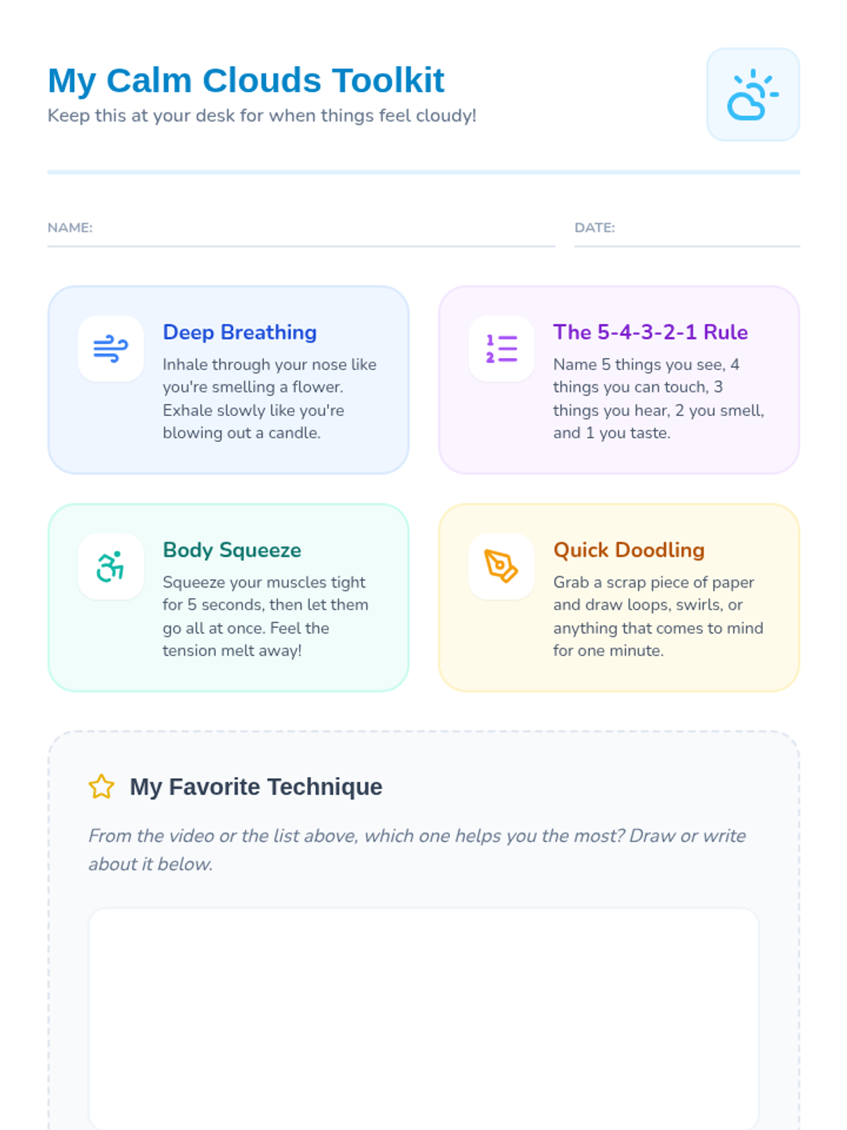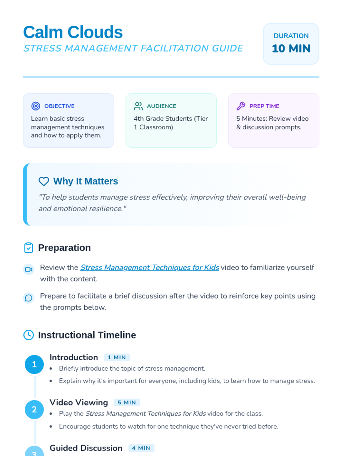 A quick, 10-minute introduction to stress management for 4th graders, featuring a video and guided discussion to help students build a toolkit of calming strategies.