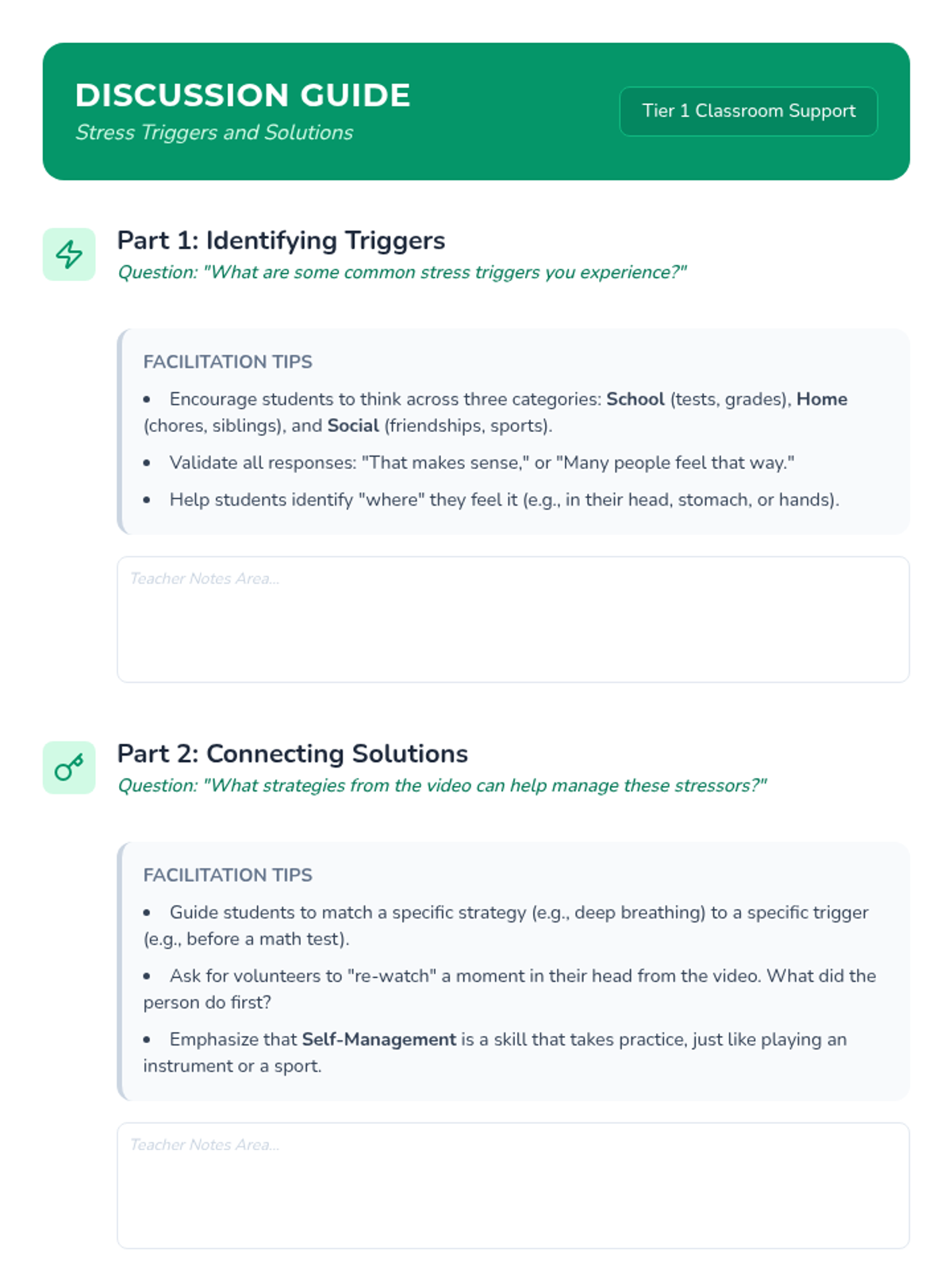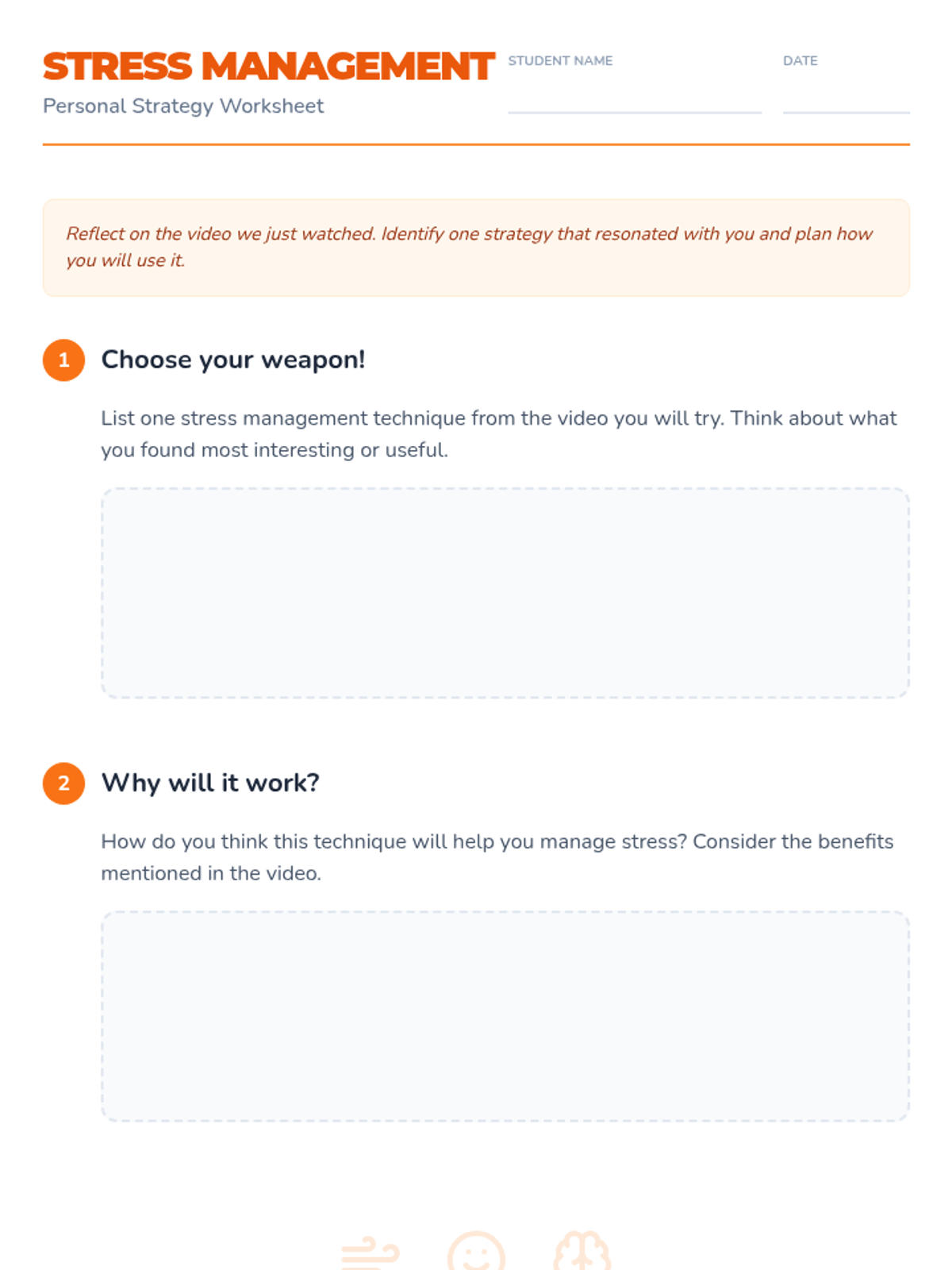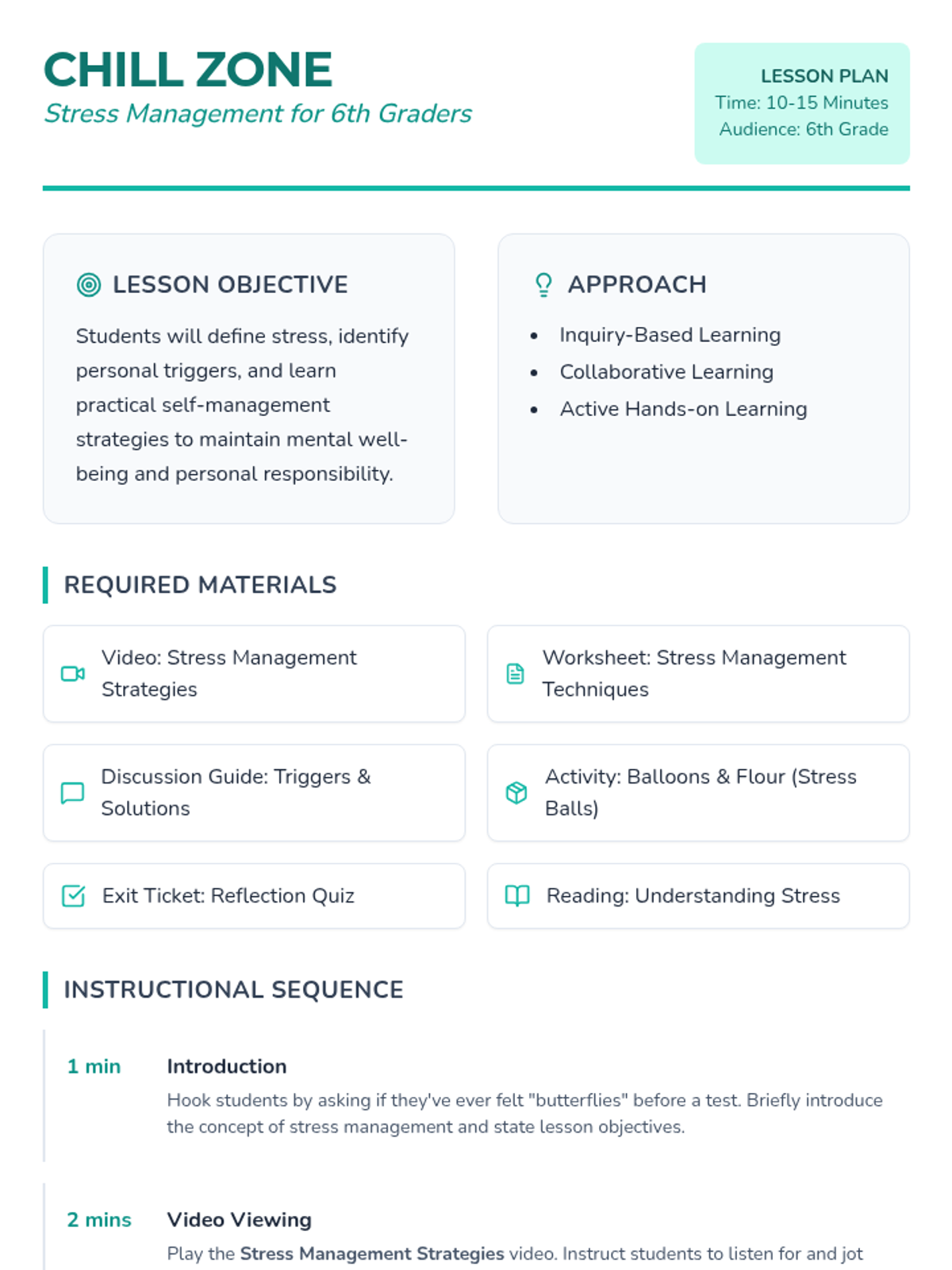 A comprehensive lesson for 6th graders introducing self-management and practical stress management techniques through video, hands-on activities, and reflection.