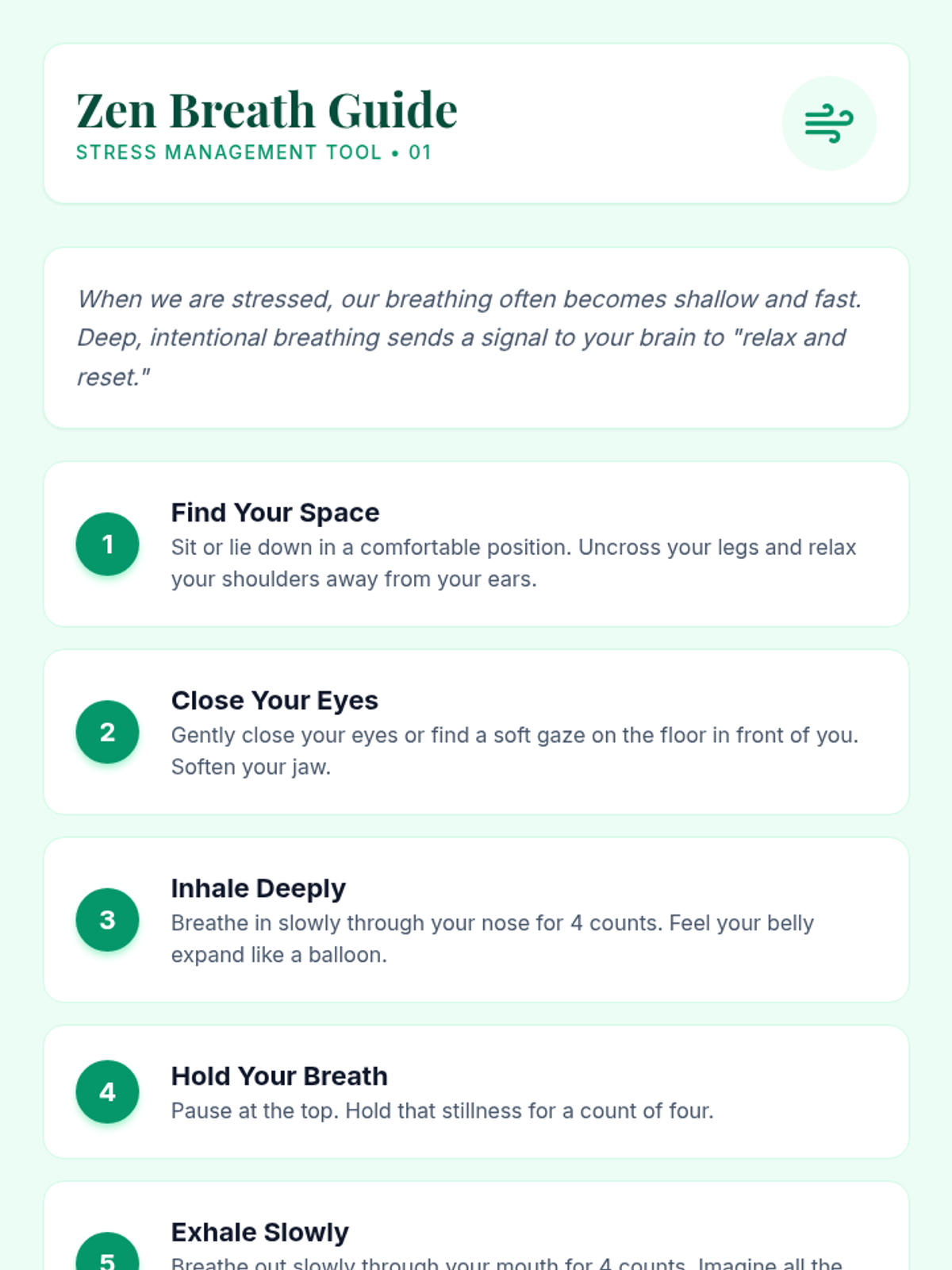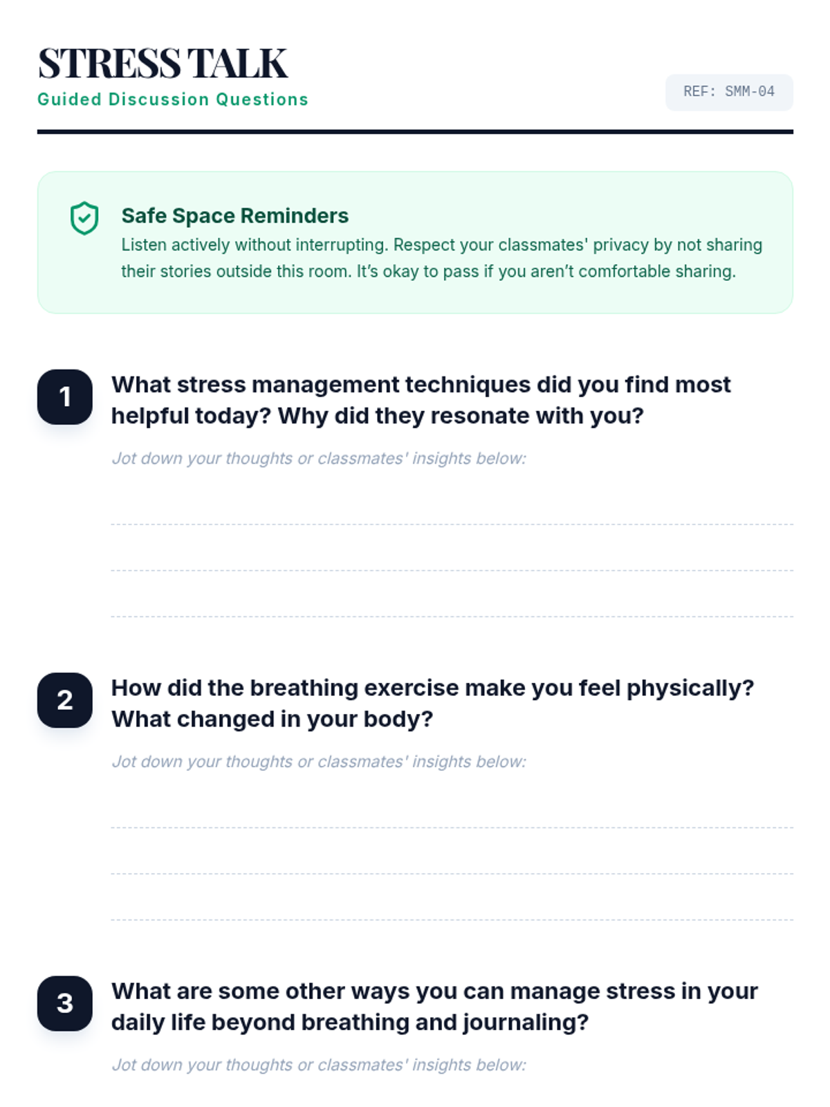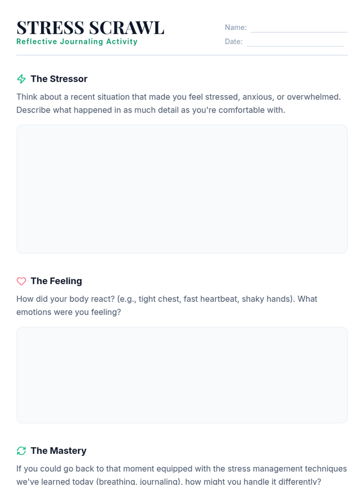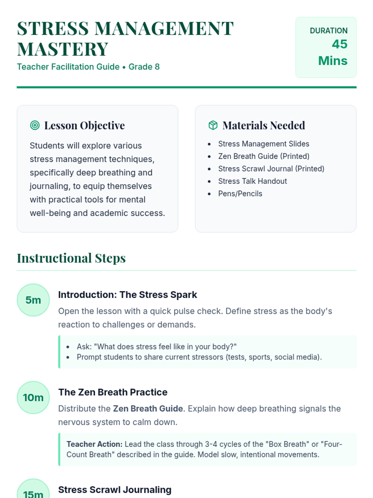 A comprehensive 45-minute lesson for 8th graders to explore and practice stress management techniques like deep breathing and reflective journaling.