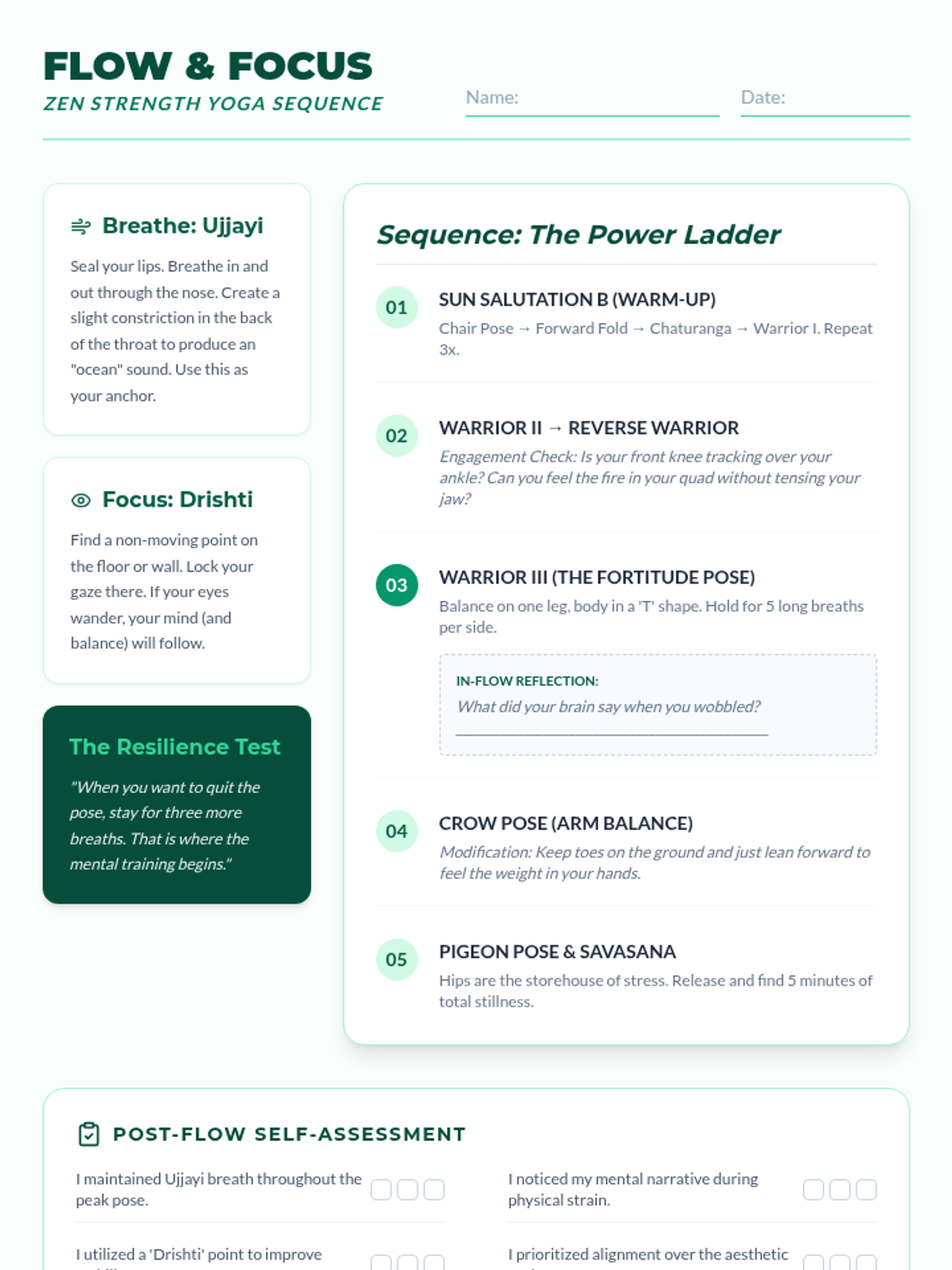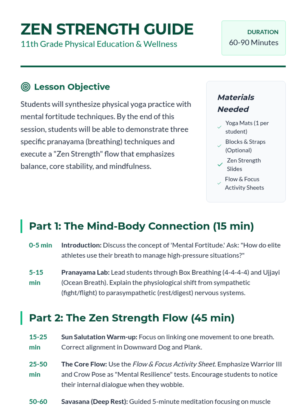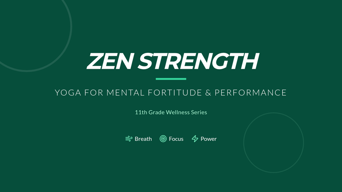 An advanced yoga lesson for 11th graders focusing on the intersection of physical posture and mental resilience. Students explore breathing techniques and a 'Zen Strength' flow designed to enhance athletic performance and stress management.