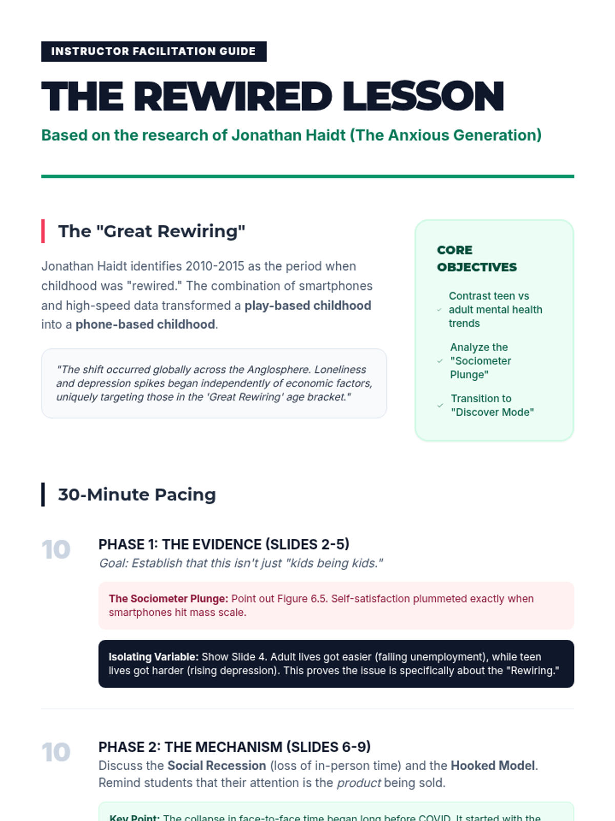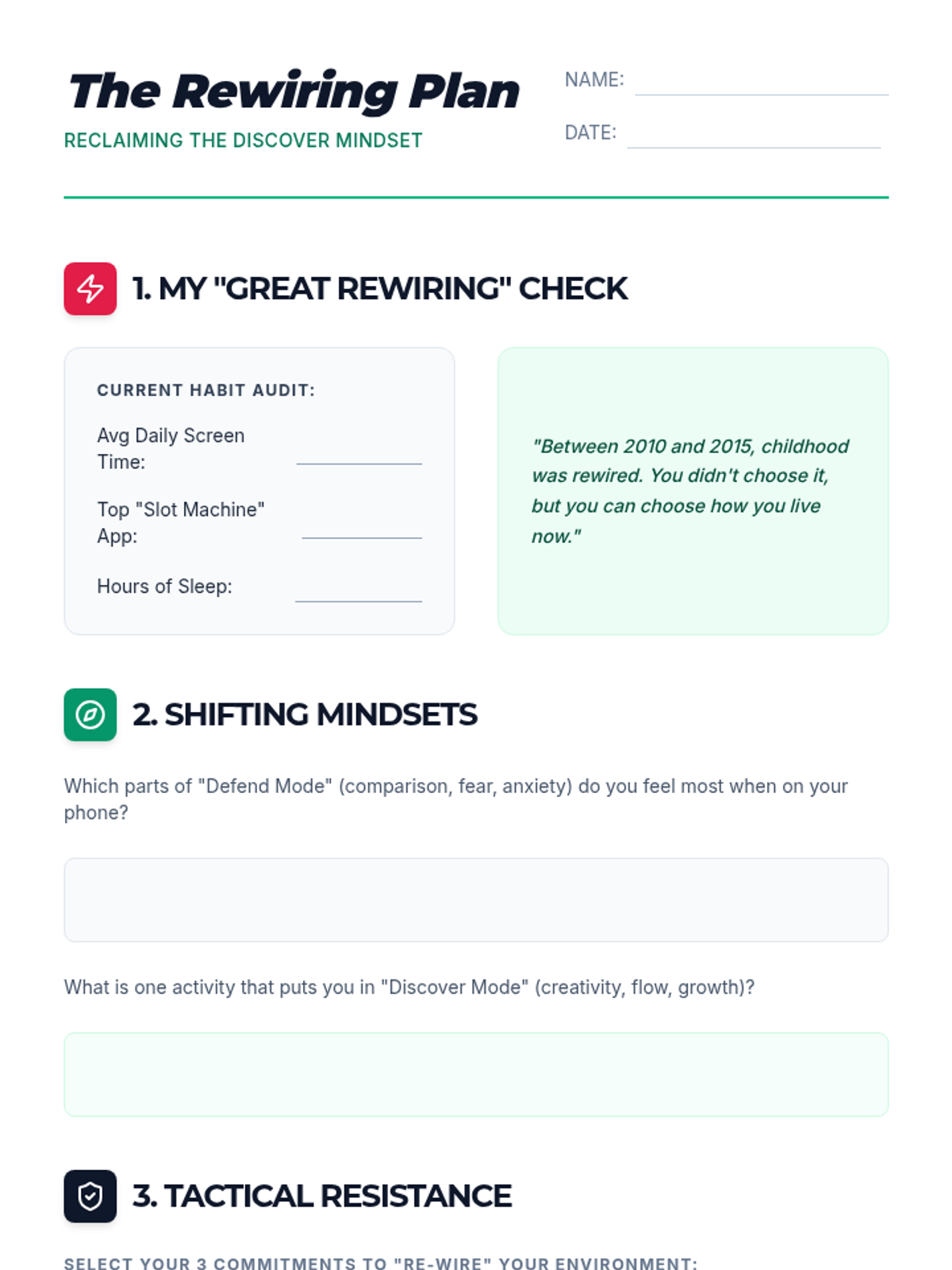 A 30-minute workshop designed for upper high school students to evaluate their digital habits and construct a personalized plan for reducing screen time in favor of real-world engagement.
