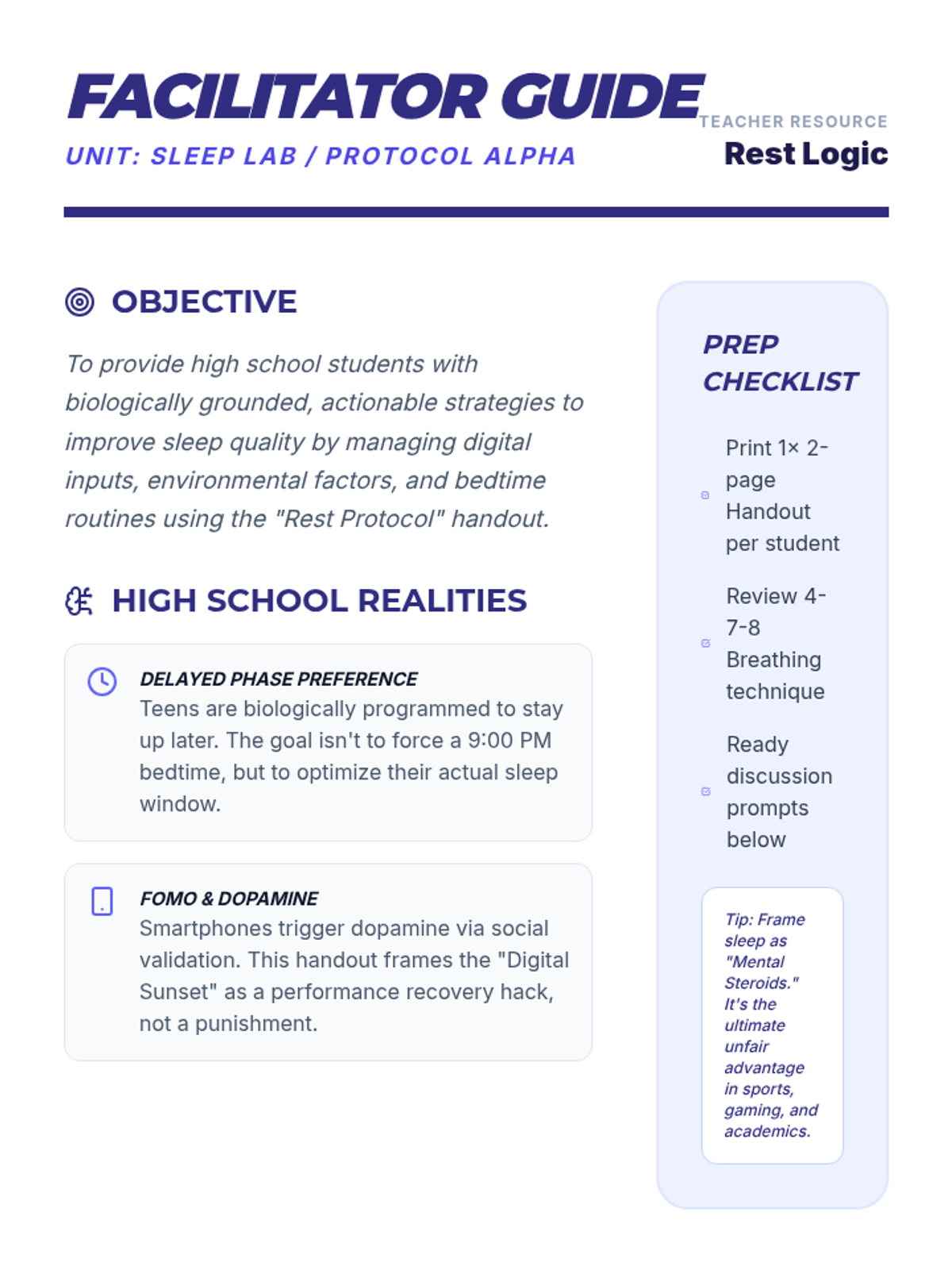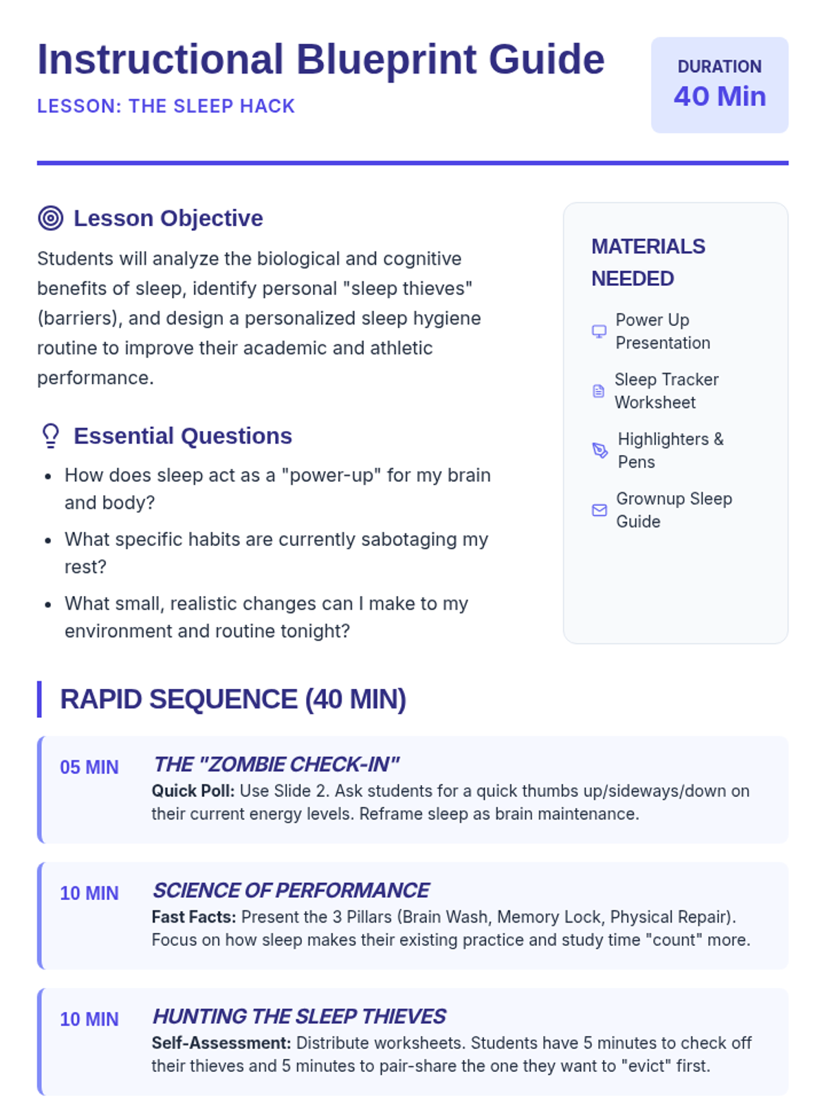 An engaging lesson that breaks down why sleep is a performance-enhancing 'hack' for students and provides practical tools for building a better bedtime routine.
