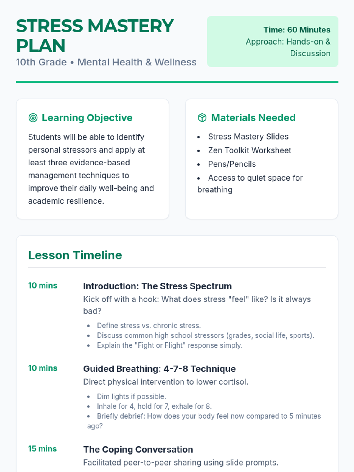 A comprehensive lesson for 10th-grade students focused on identifying stressors and implementing practical stress management techniques to improve mental well-being and academic performance.