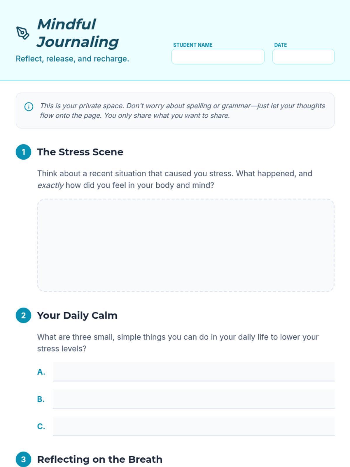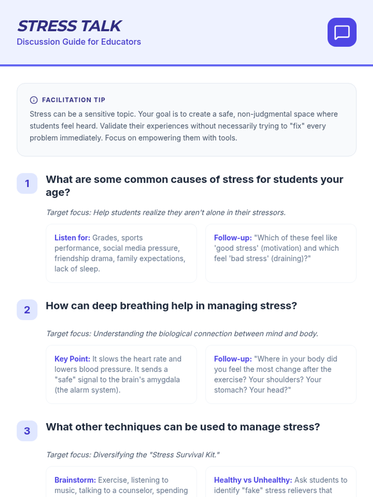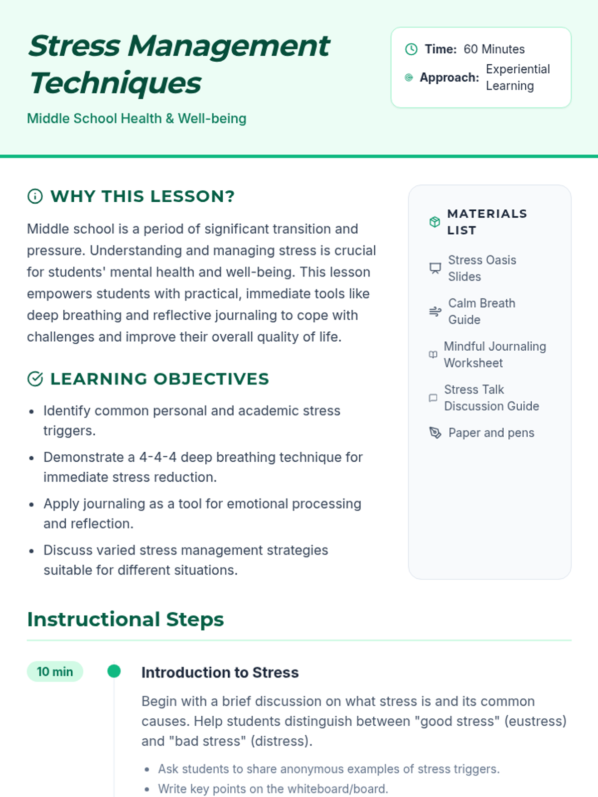 A comprehensive lesson designed for middle school students to understand stress triggers and practice effective management techniques like deep breathing and journaling.