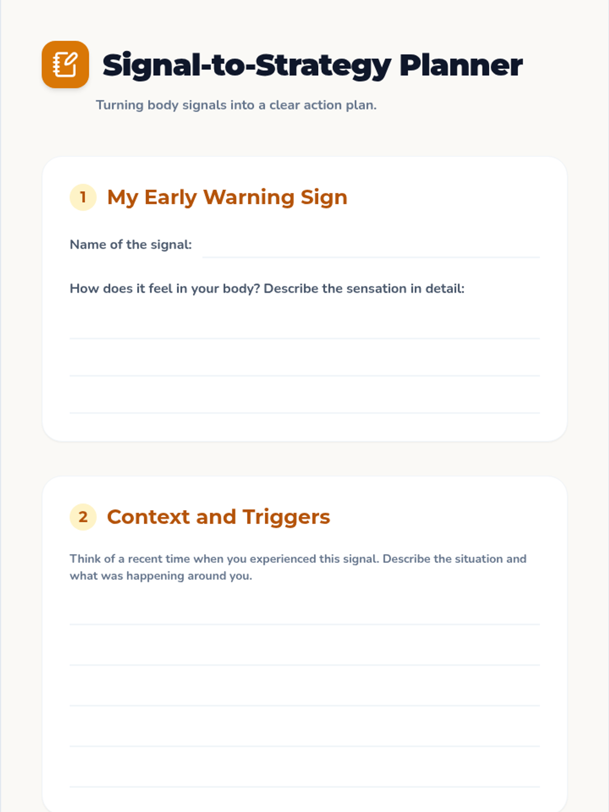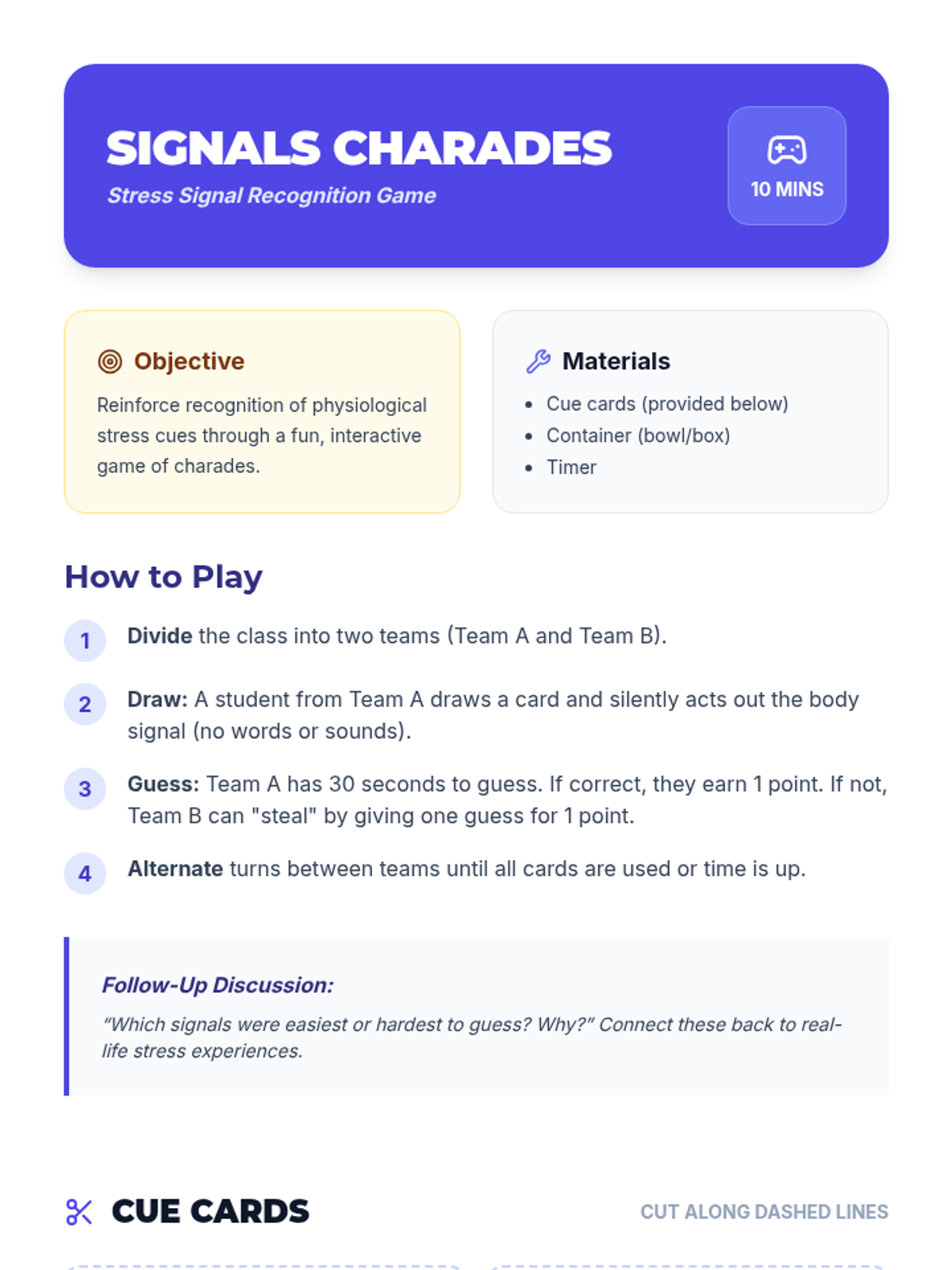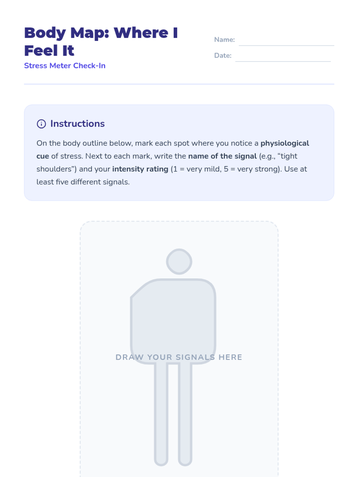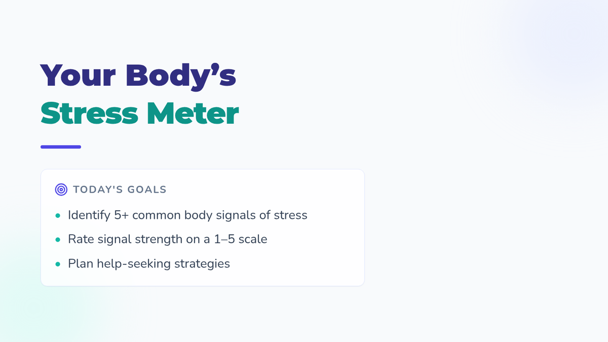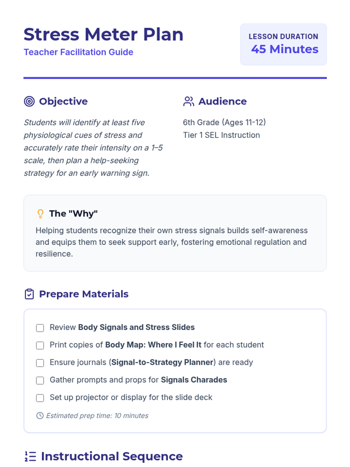 In this 45-minute 6th grade lesson, students explore and identify at least five physiological cues of stress and learn to rate their intensity on a 1–5 scale. This foundational SEL lesson empowers students to recognize early warning signs and plan help-seeking strategies, promoting self-awareness and emotional regulation.