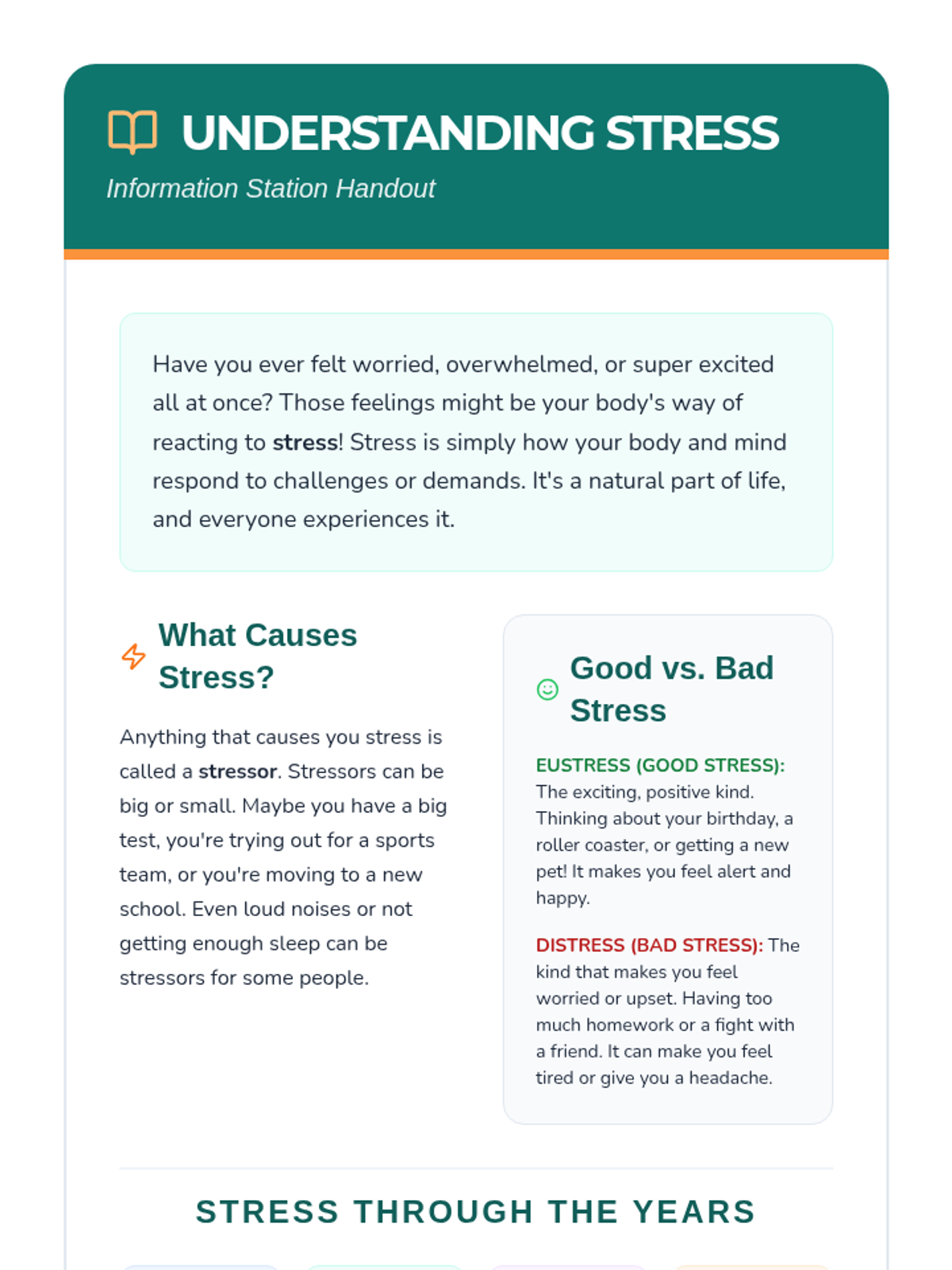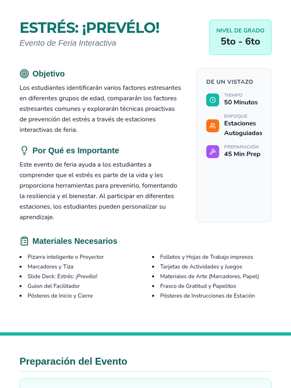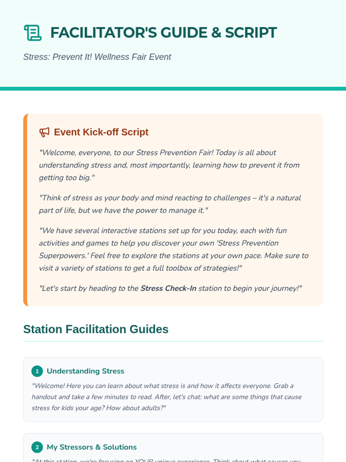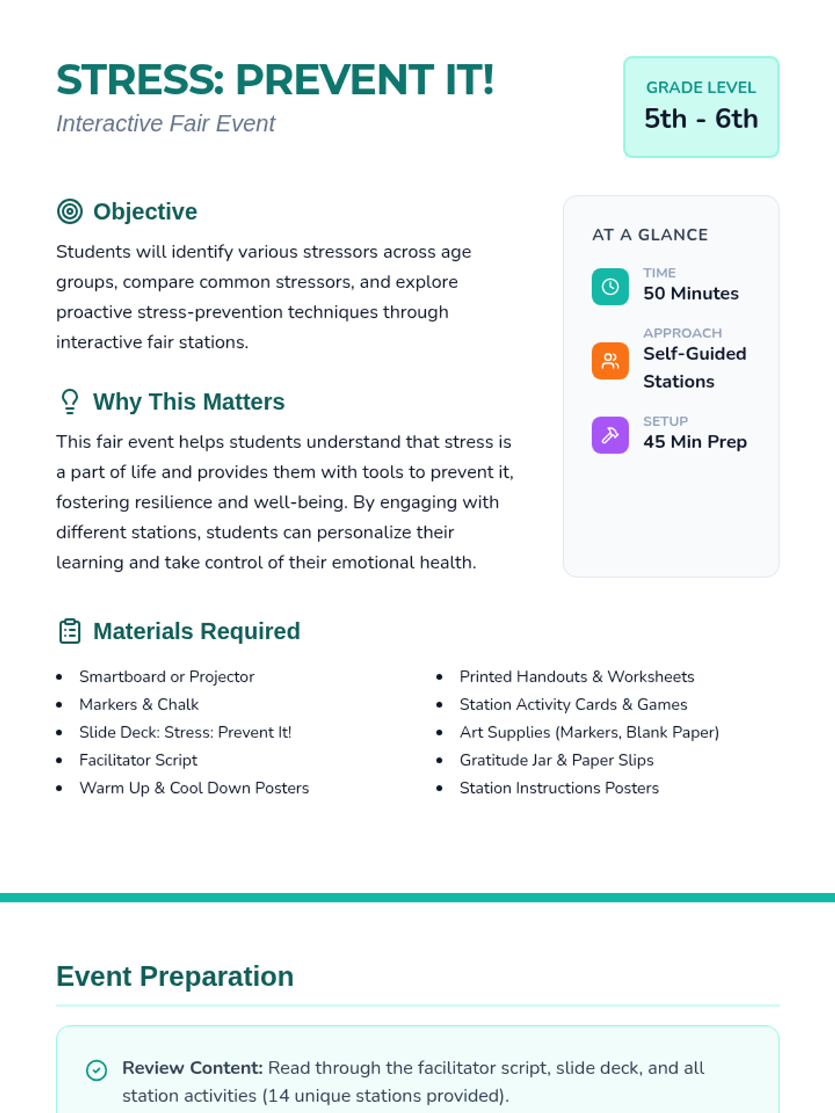 An interactive wellness fair event for 5th and 6th graders to identify stressors and learn proactive prevention strategies through self-guided stations.