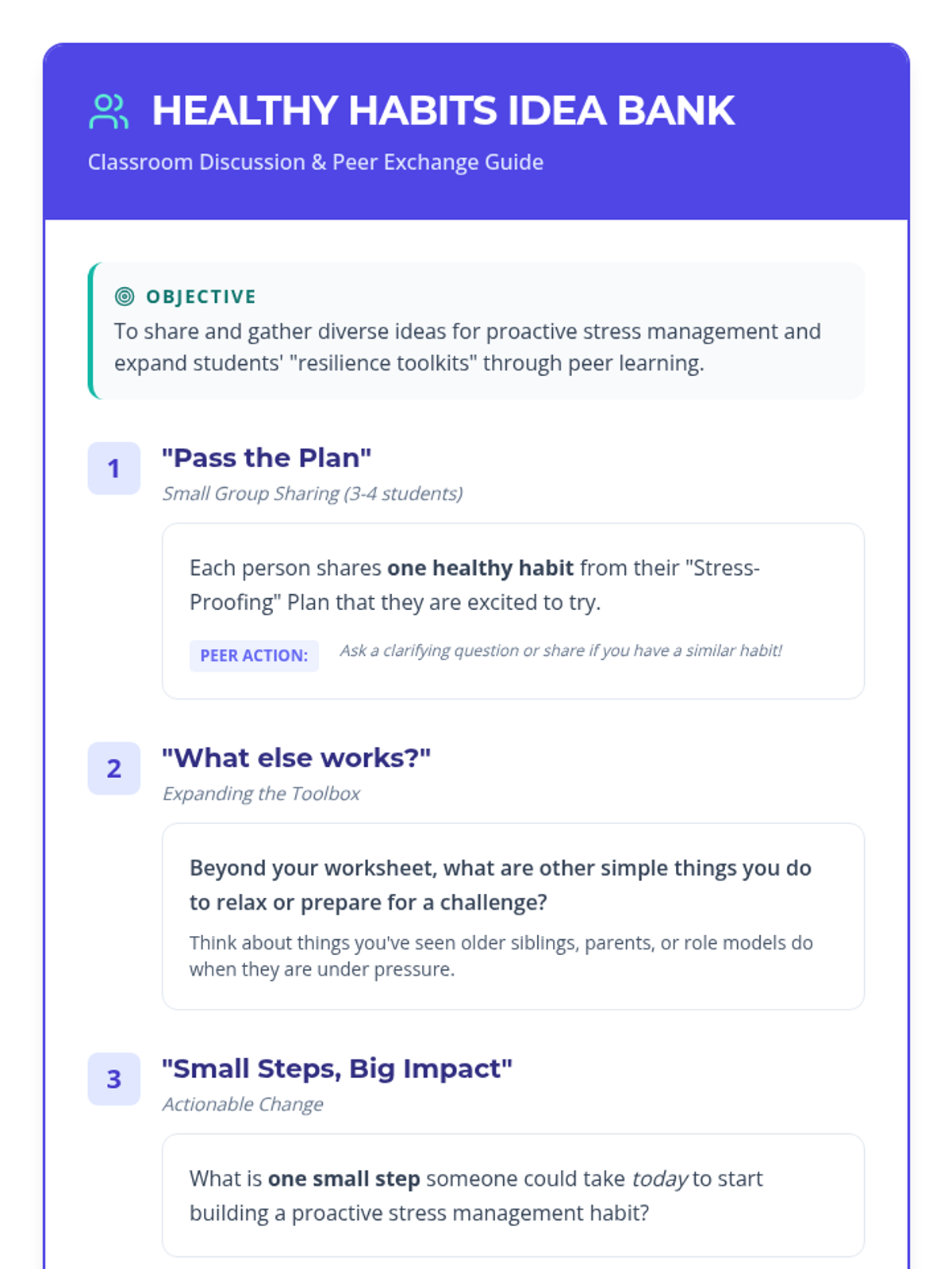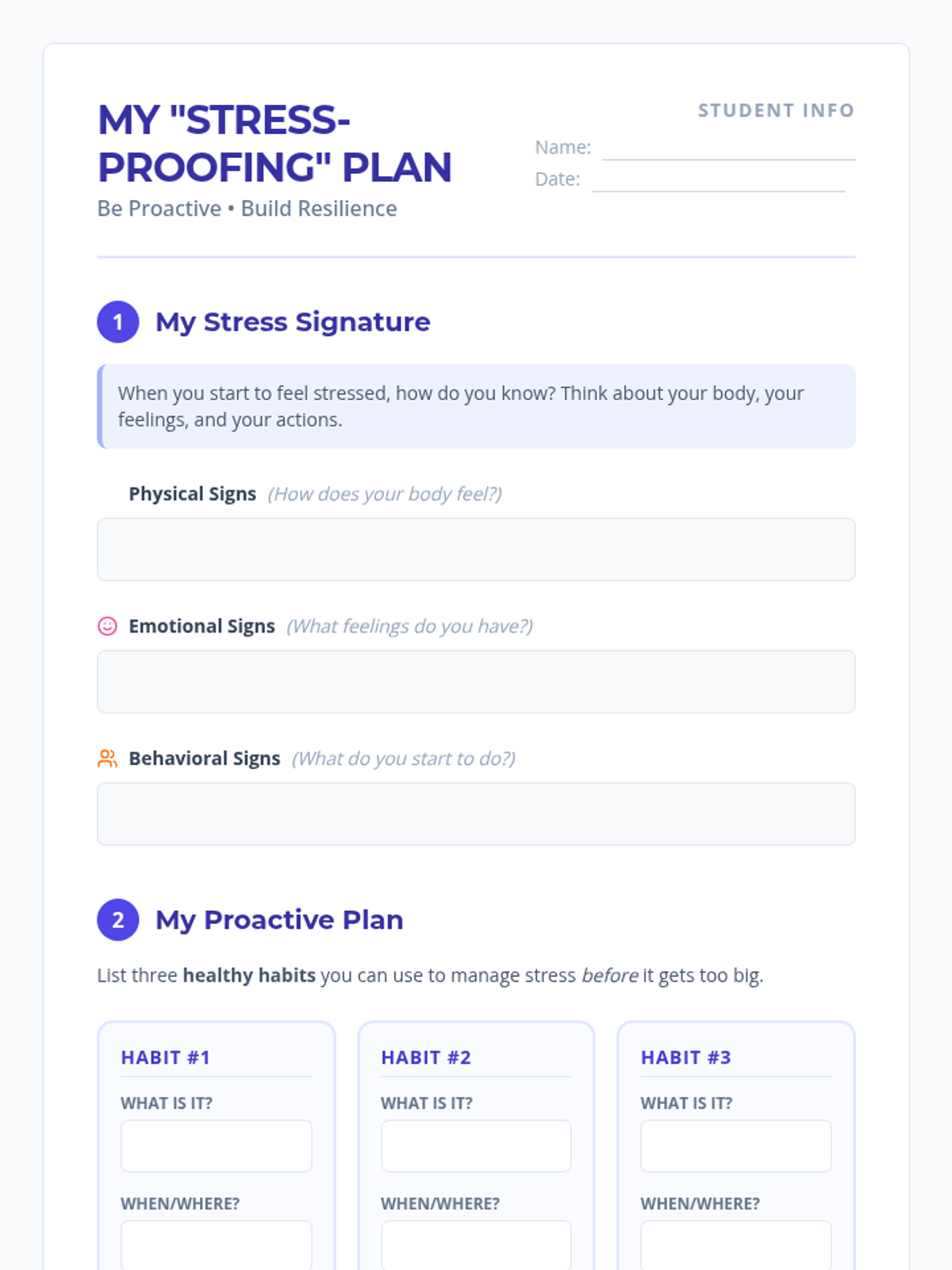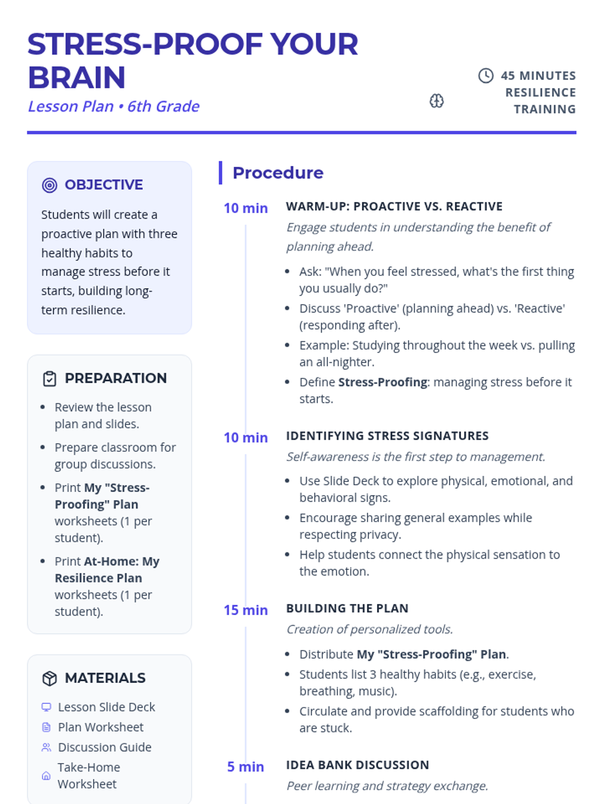 A 45-minute lesson for 6th graders focusing on proactive stress management and building resilience through personalized healthy habits.