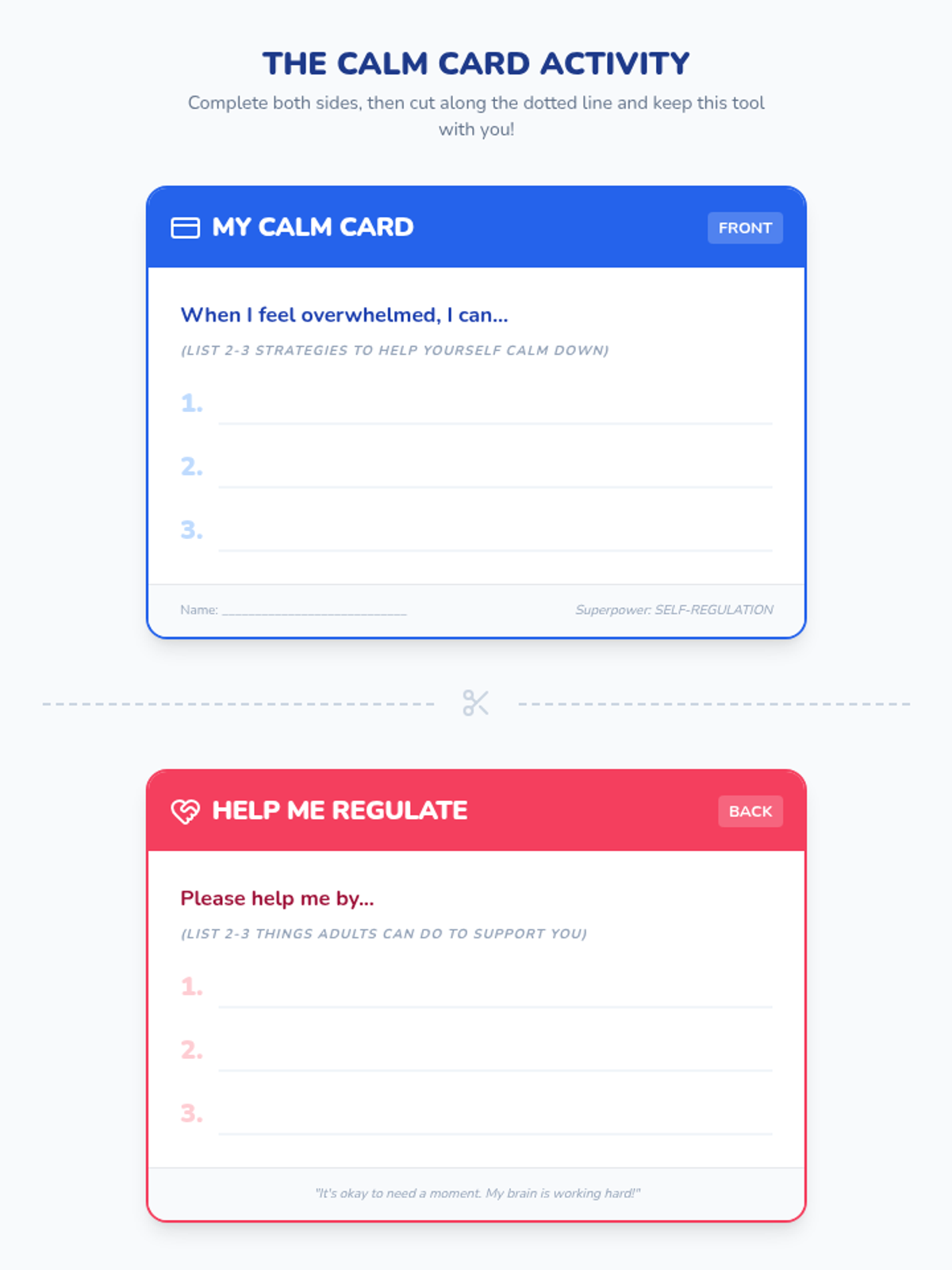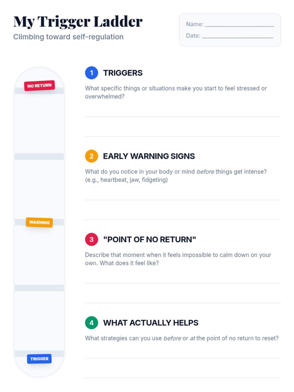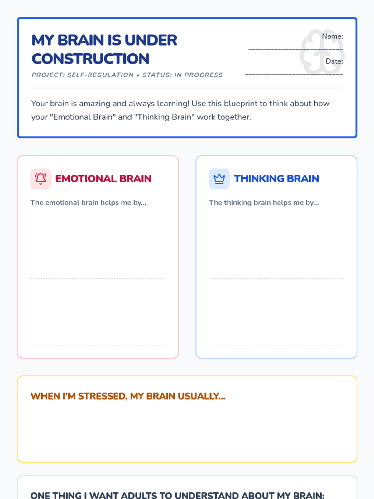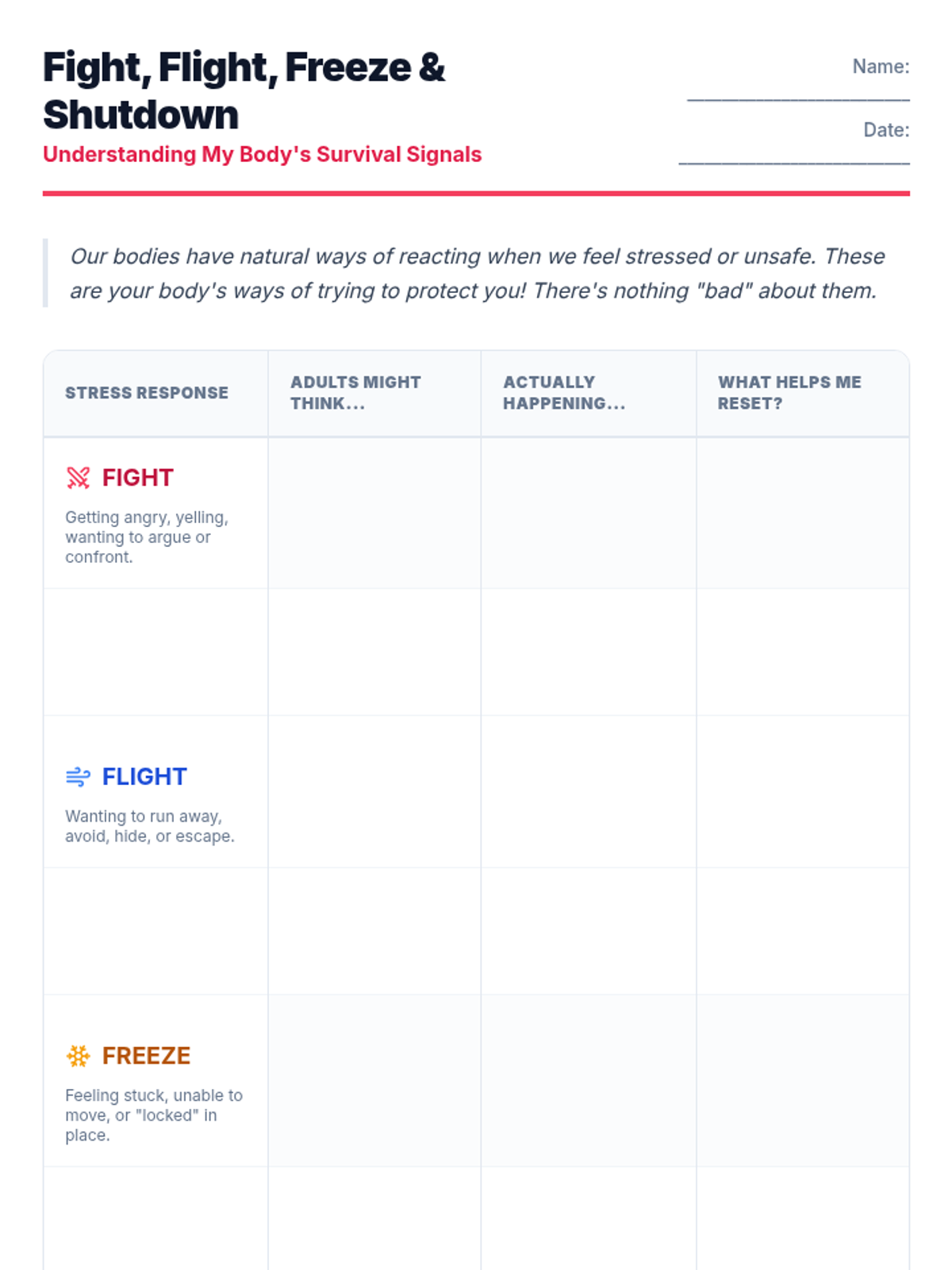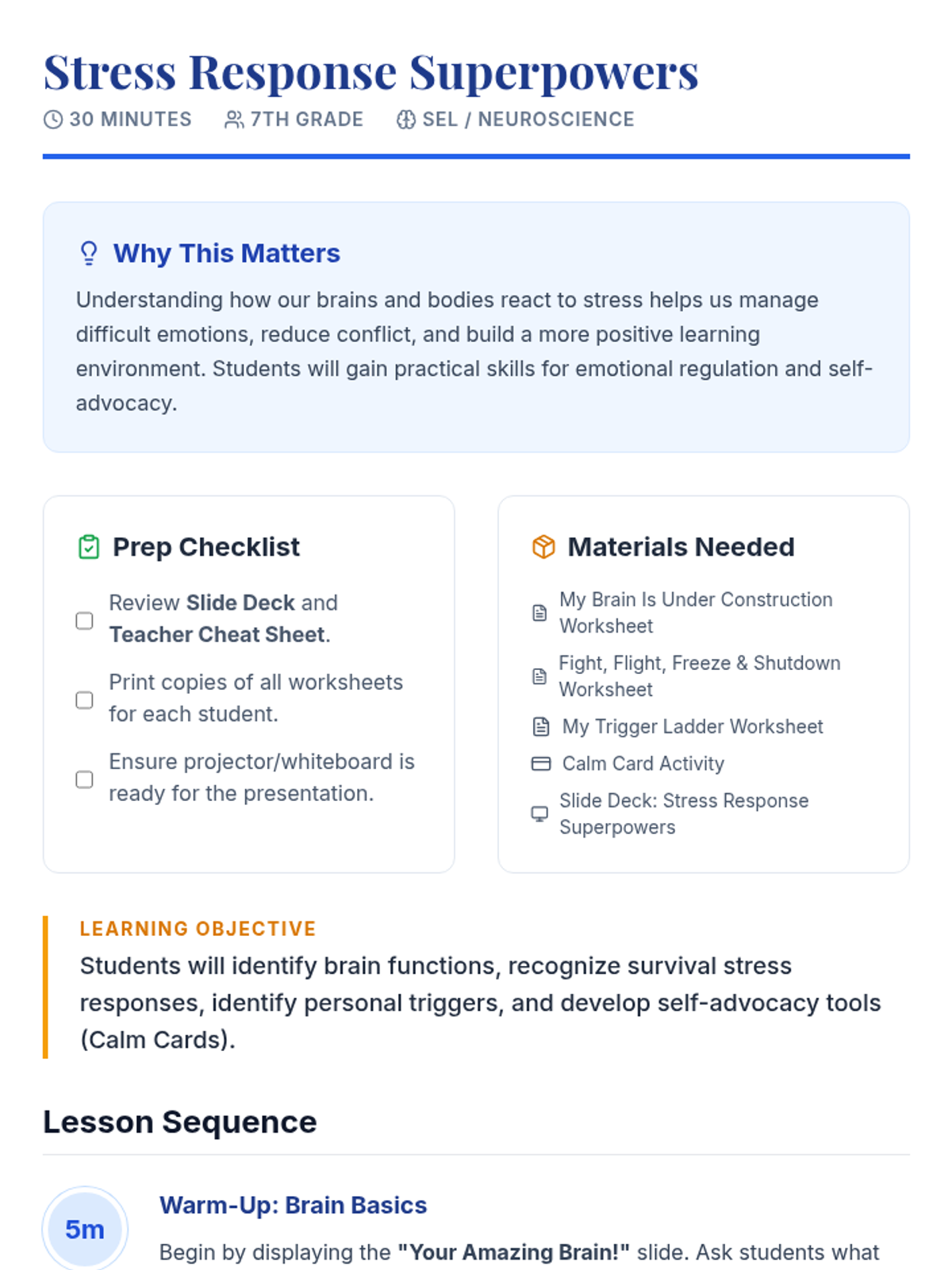 A 30-minute session for 7th graders to understand their brain's stress responses (fight, flight, freeze, shutdown) and develop self-regulation strategies using the 'Calm Card' and 'Trigger Ladder'.
