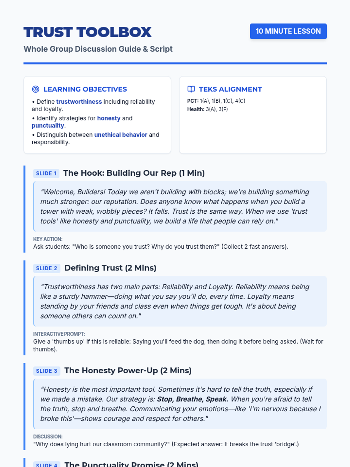 A fast-paced 10-minute lesson teaching 3rd graders the pillars of trustworthiness through honesty, reliability, and punctuality. Students will learn practical strategies to build character and make responsible decisions for their community.