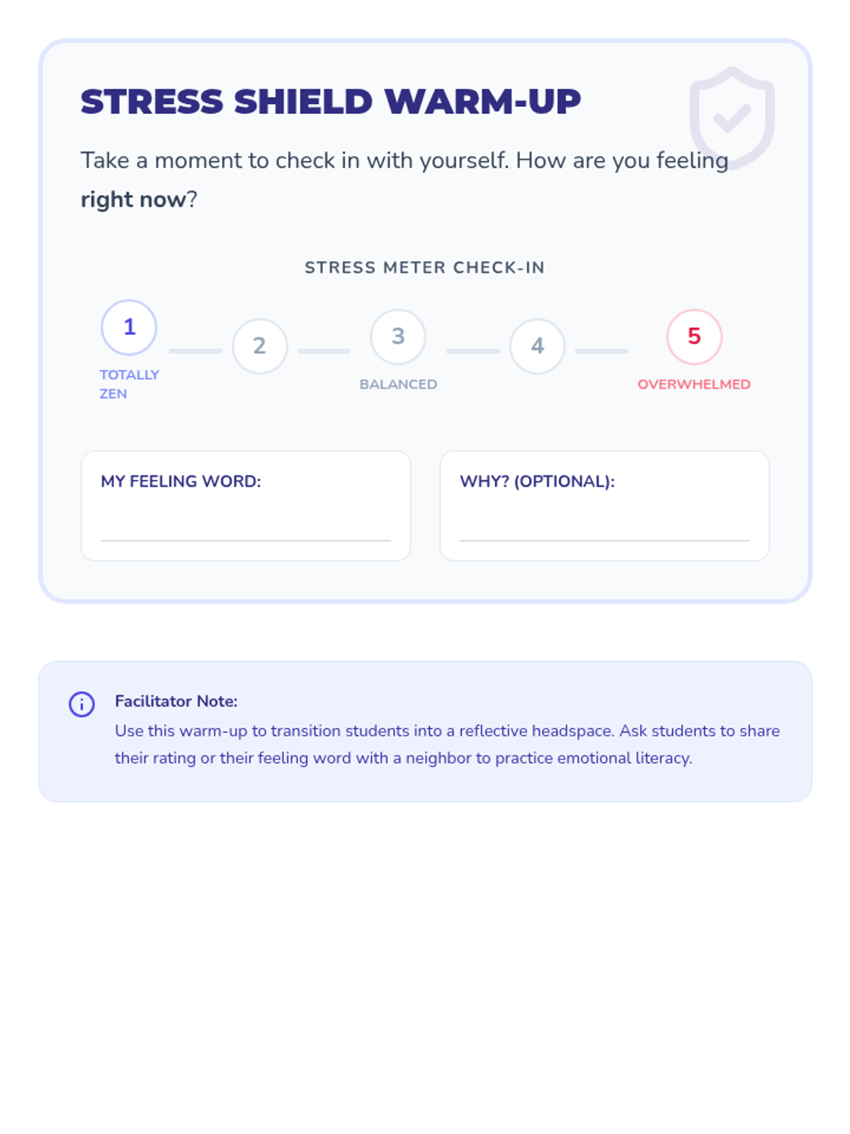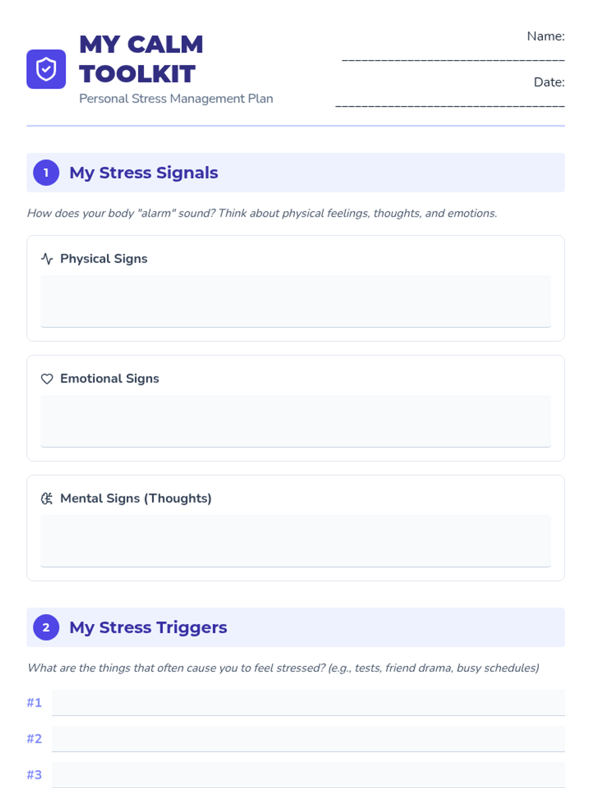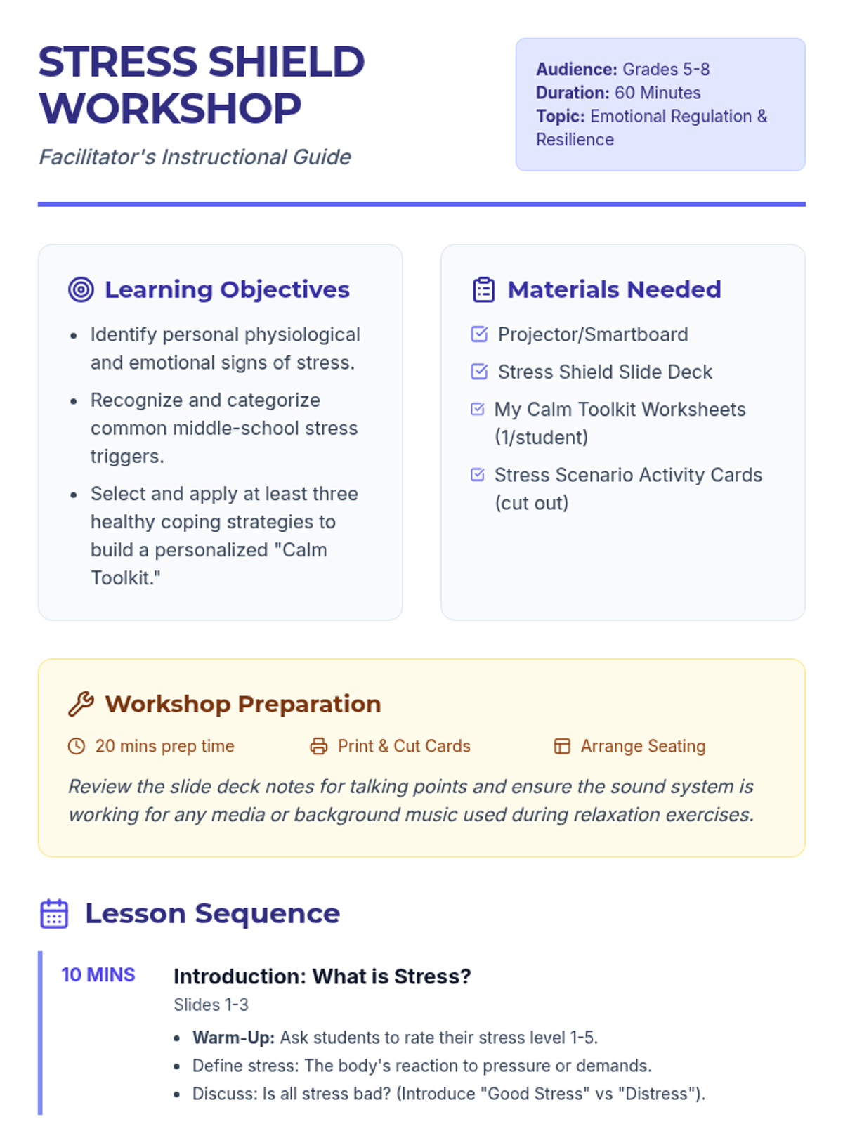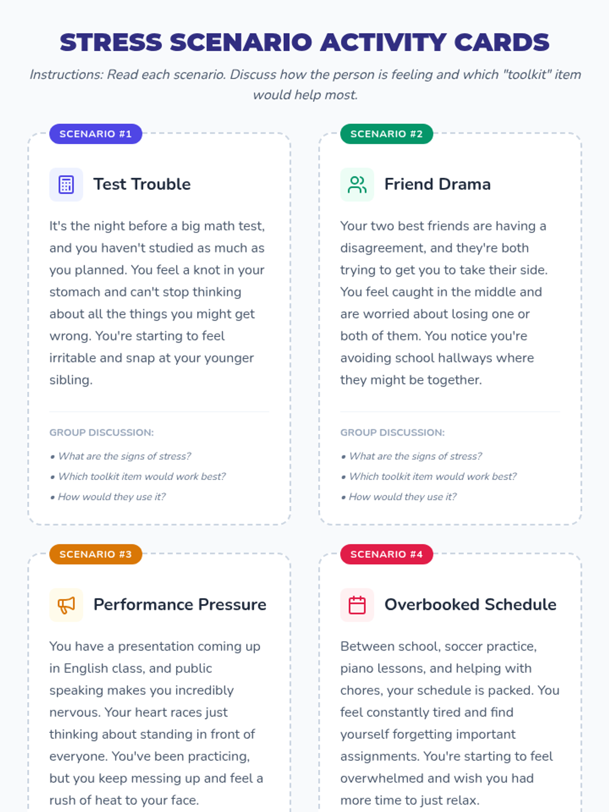 A 60-minute interactive workshop for grades 5-8 designed to help students identify personal stress triggers and build a customized 'Calm Toolkit' of healthy coping strategies. Students will practice these techniques through guided exercises and real-world scenarios to build emotional resilience.
