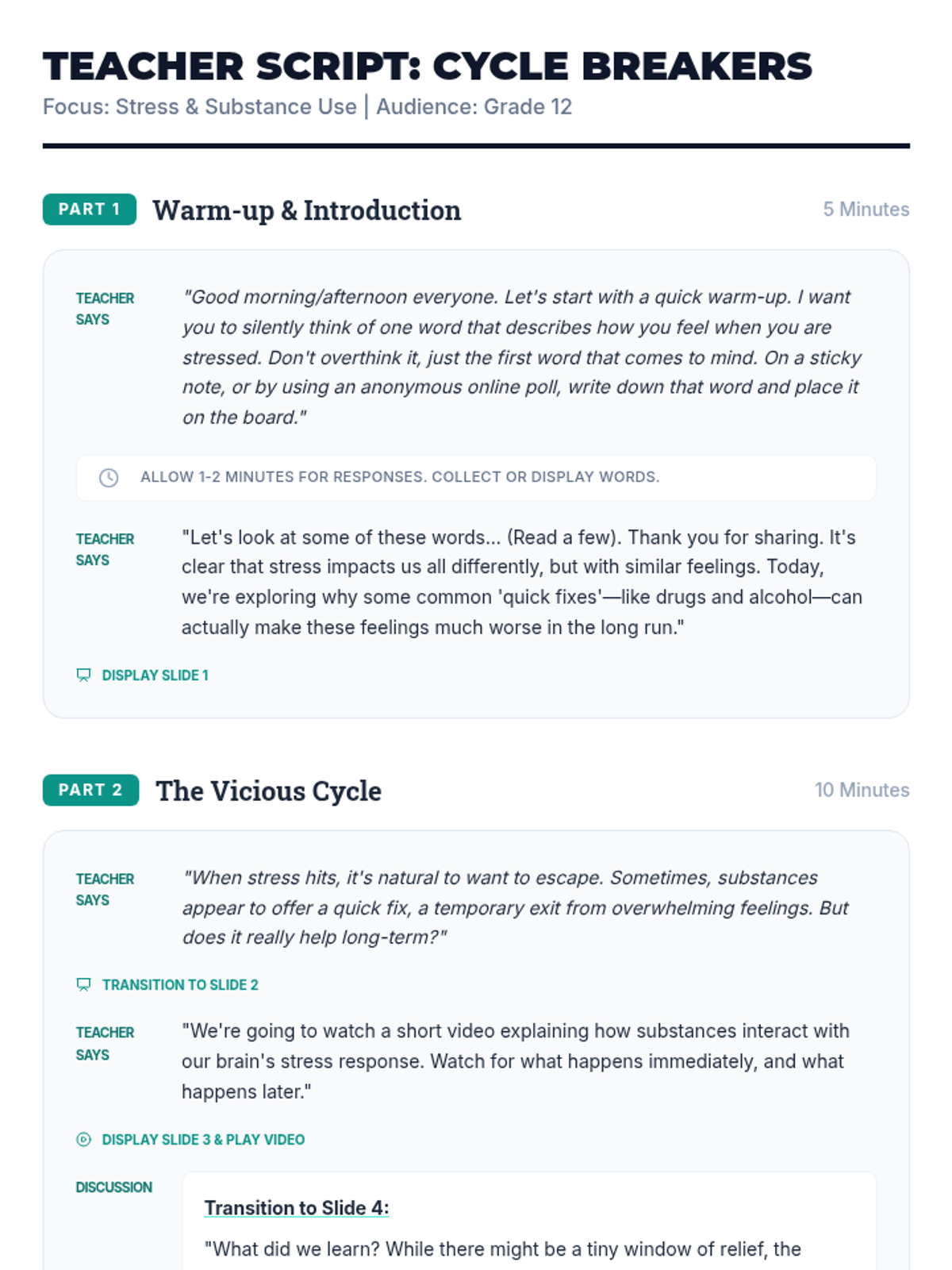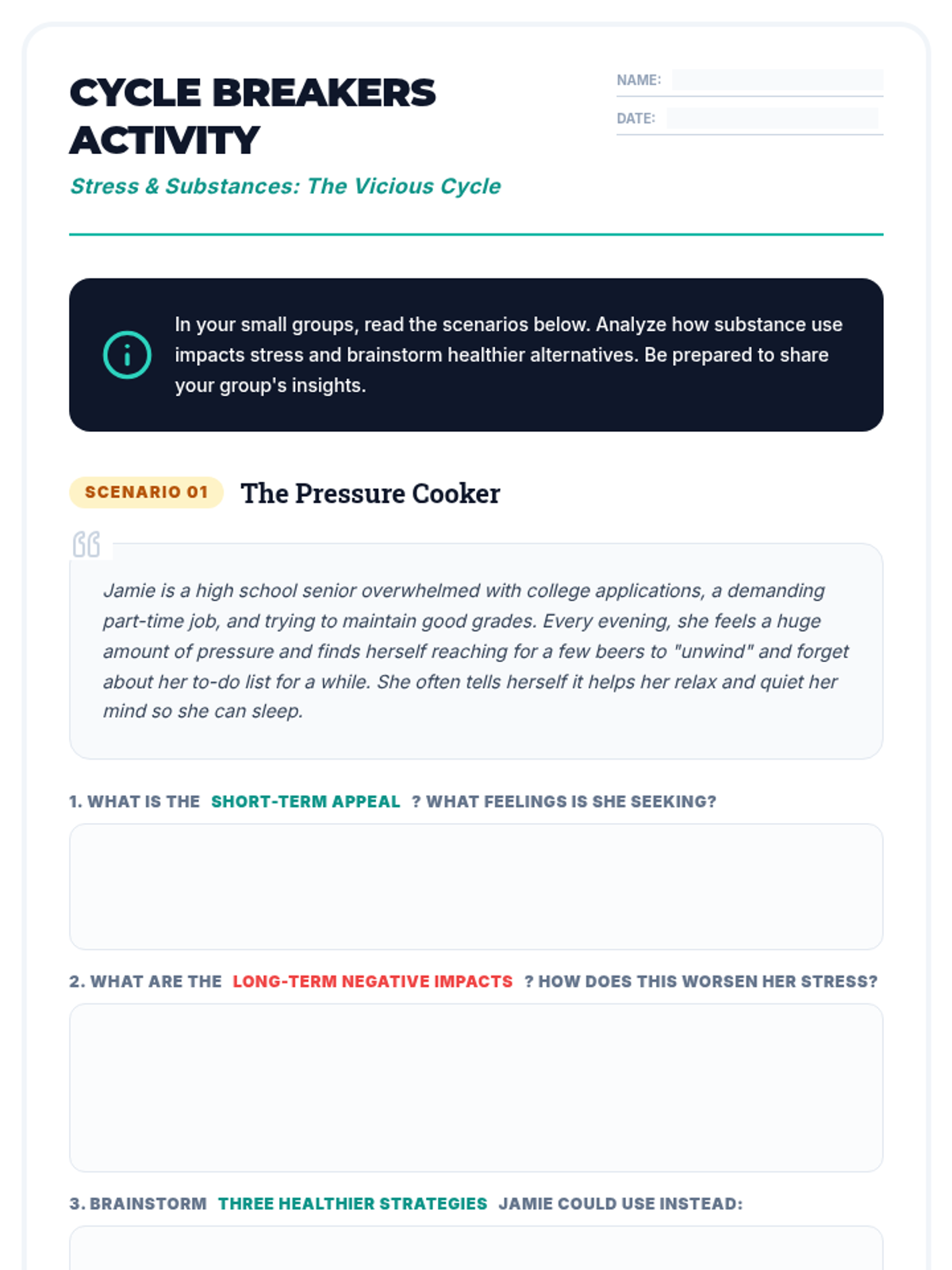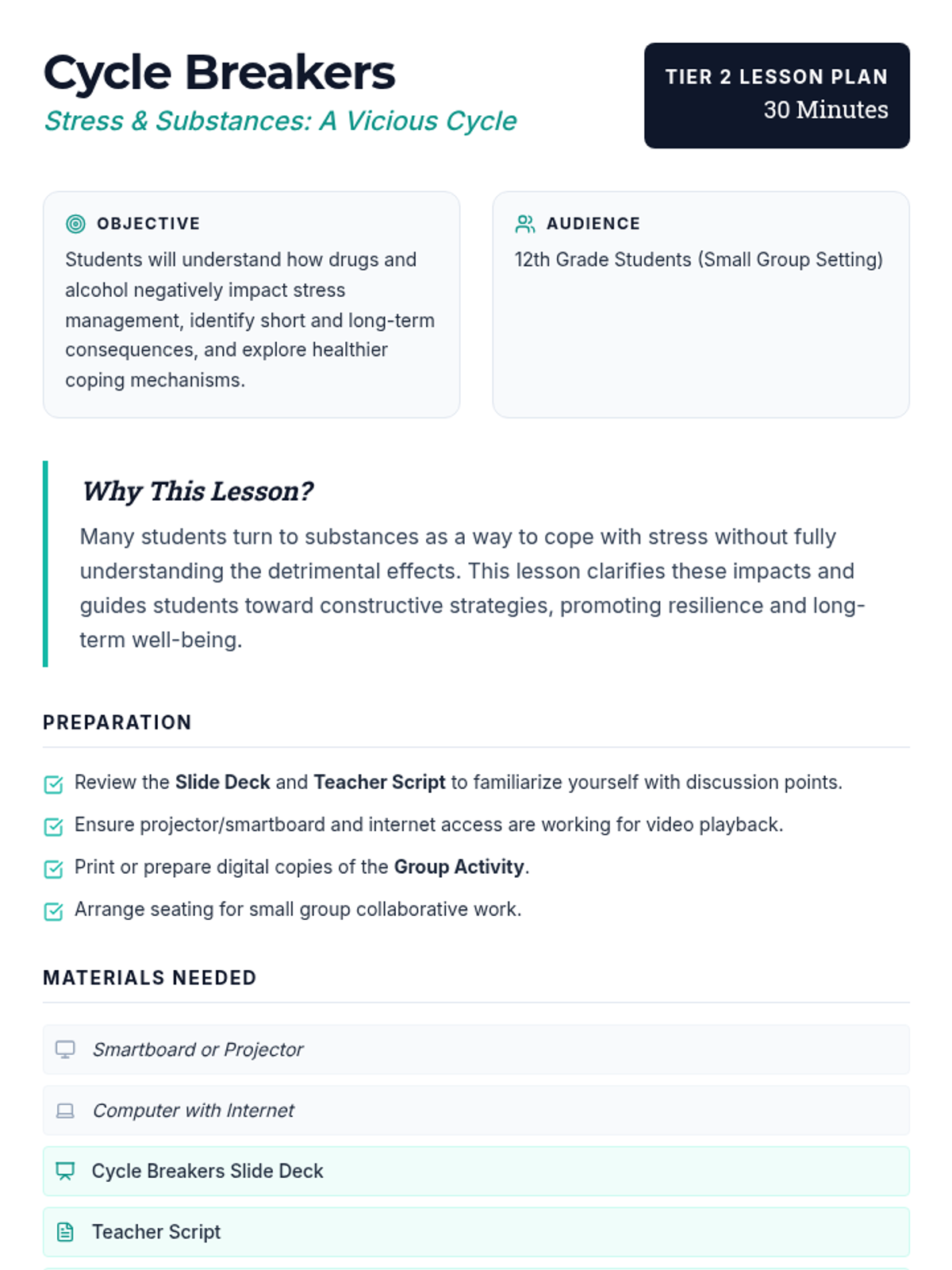 This lesson explores how drugs and alcohol, often perceived as stress relievers, actually worsen stress. Students will learn to identify the negative impacts of substance use on stress management and engage in activities to promote healthier coping mechanisms.