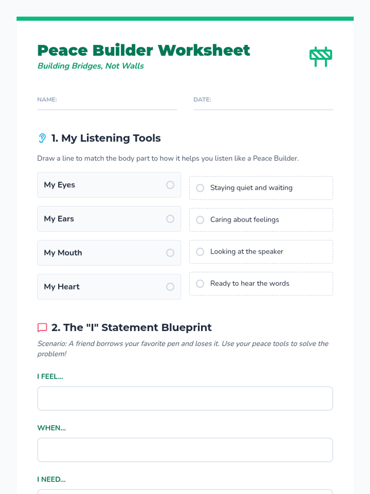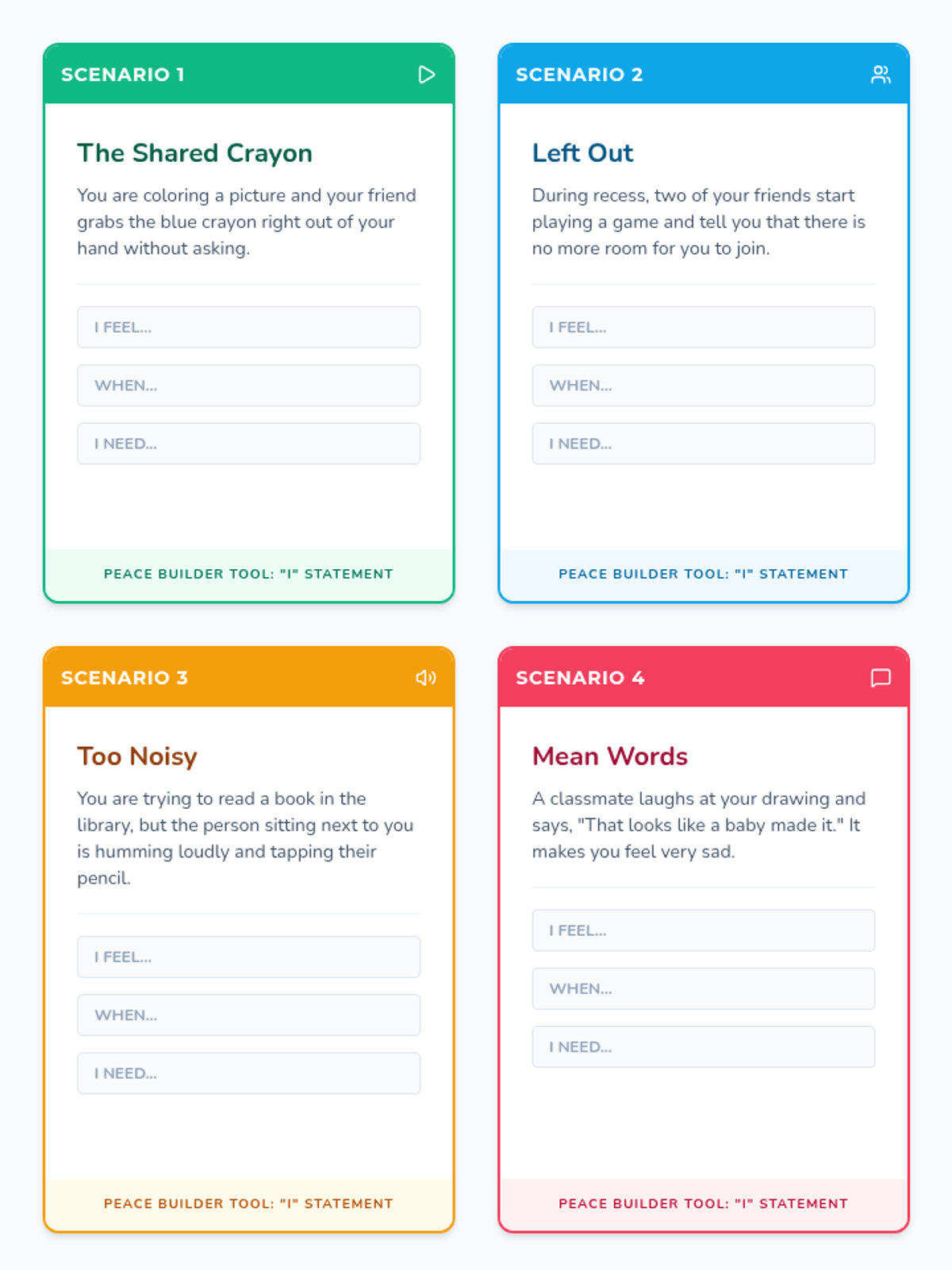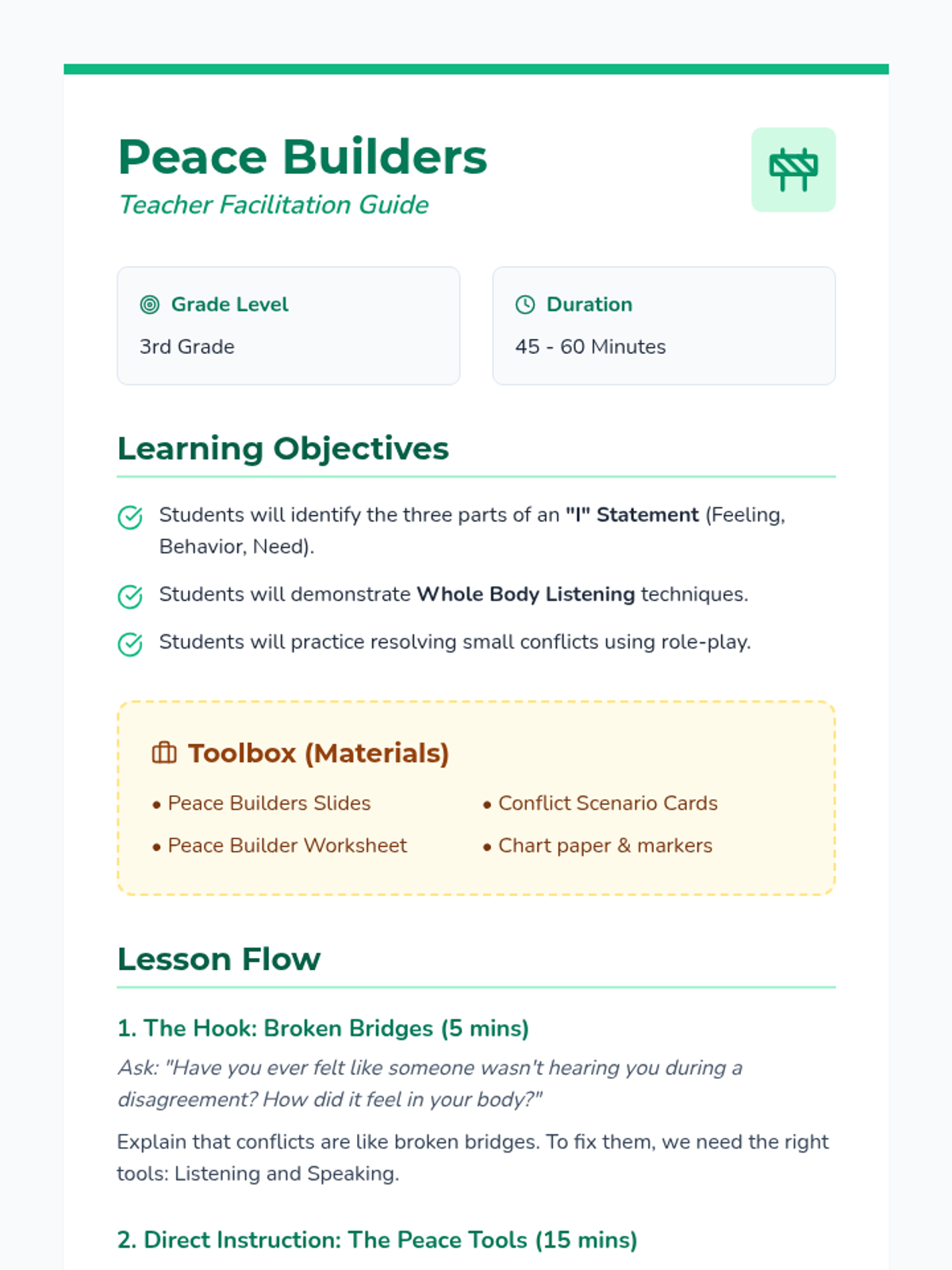 A 3rd-grade lesson focused on building conflict resolution skills through active listening and the use of 'I' statements. Students will learn to express their feelings constructively and listen empathetically to others.