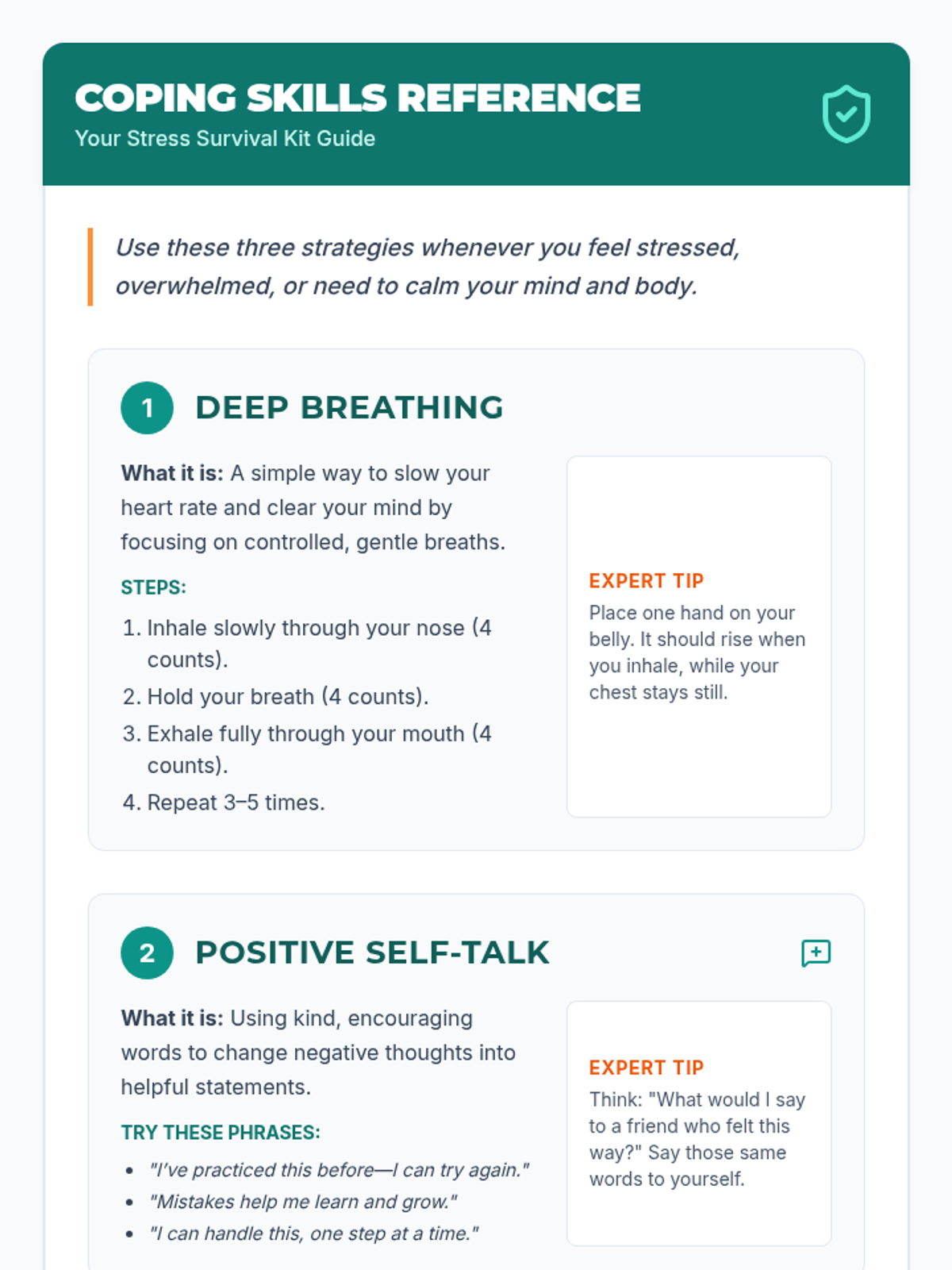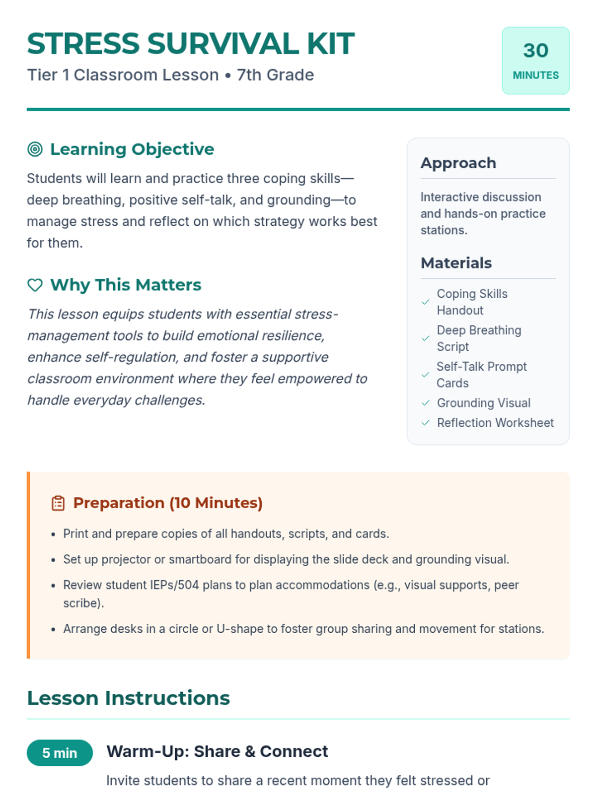 A 30-minute 7th grade Tier 1 lesson where students learn and practice essential coping skills—deep breathing, positive self-talk, and grounding—to build emotional resilience and manage stress.