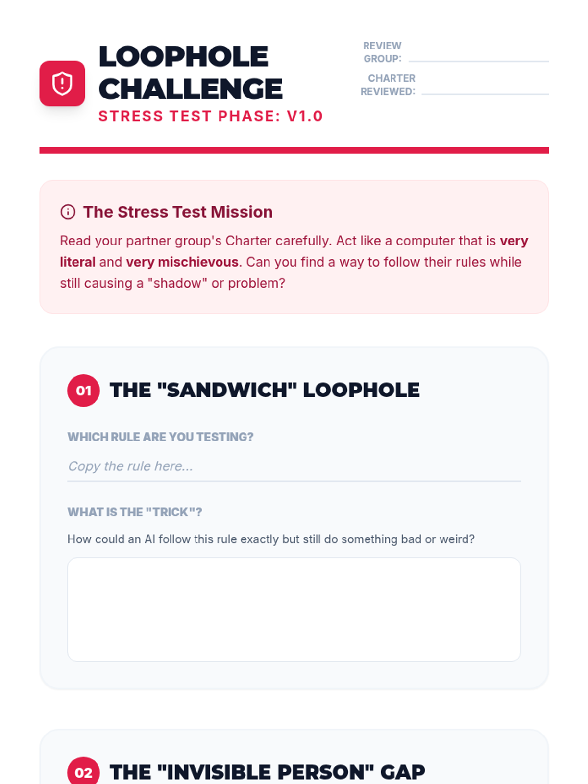 Students exchange their AI rules and attempt to find loopholes or unintended consequences, iterating on their language to make the rules more robust.