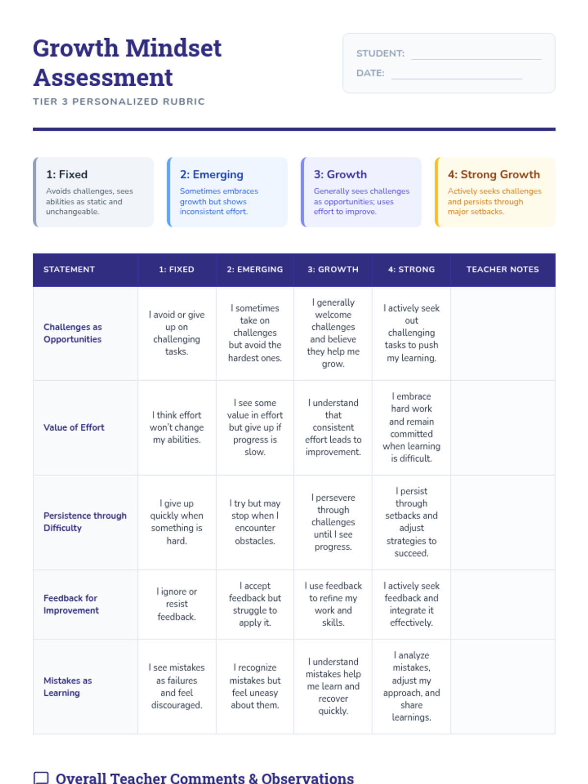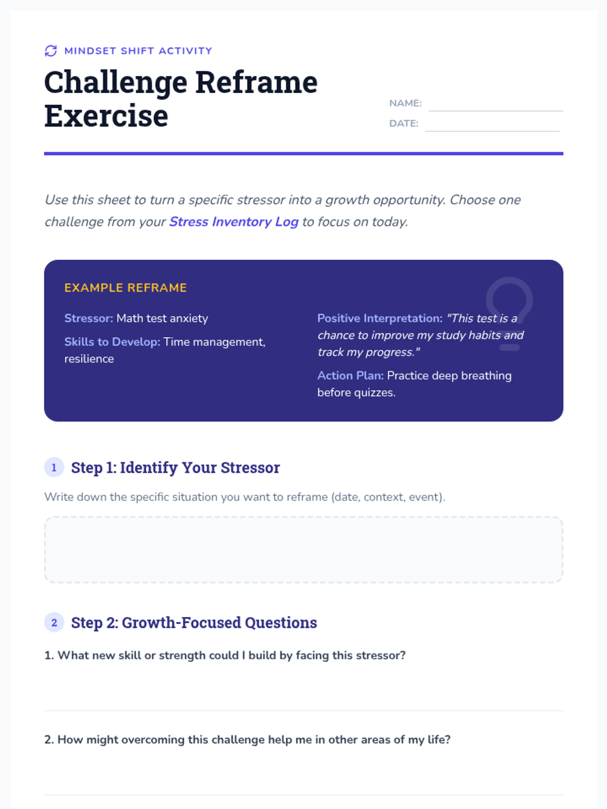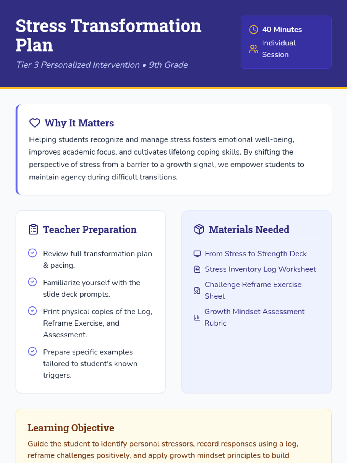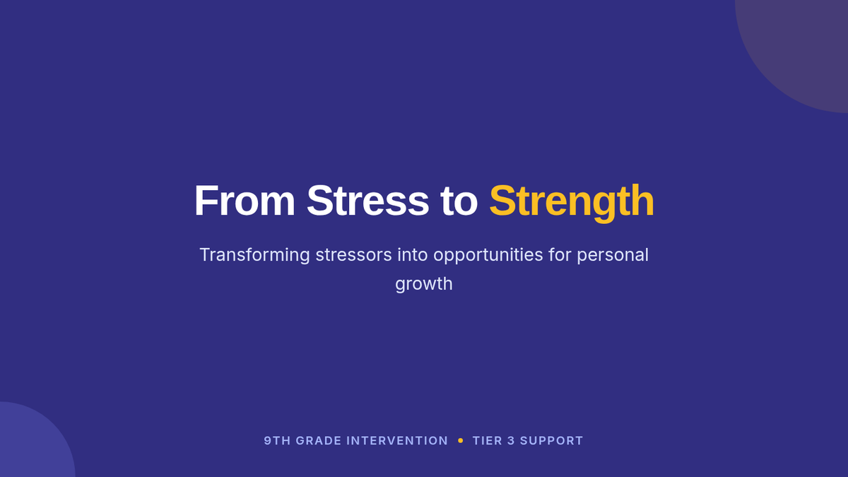 A personalized Tier 3 intervention for 9th-grade students to identify stress triggers, reframe challenges as growth opportunities, and develop a resilient mindset through guided self-reflection and assessment.