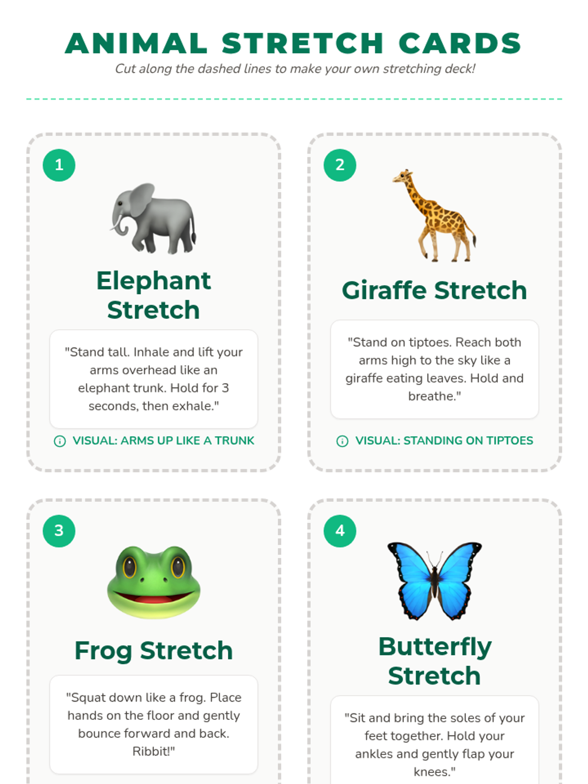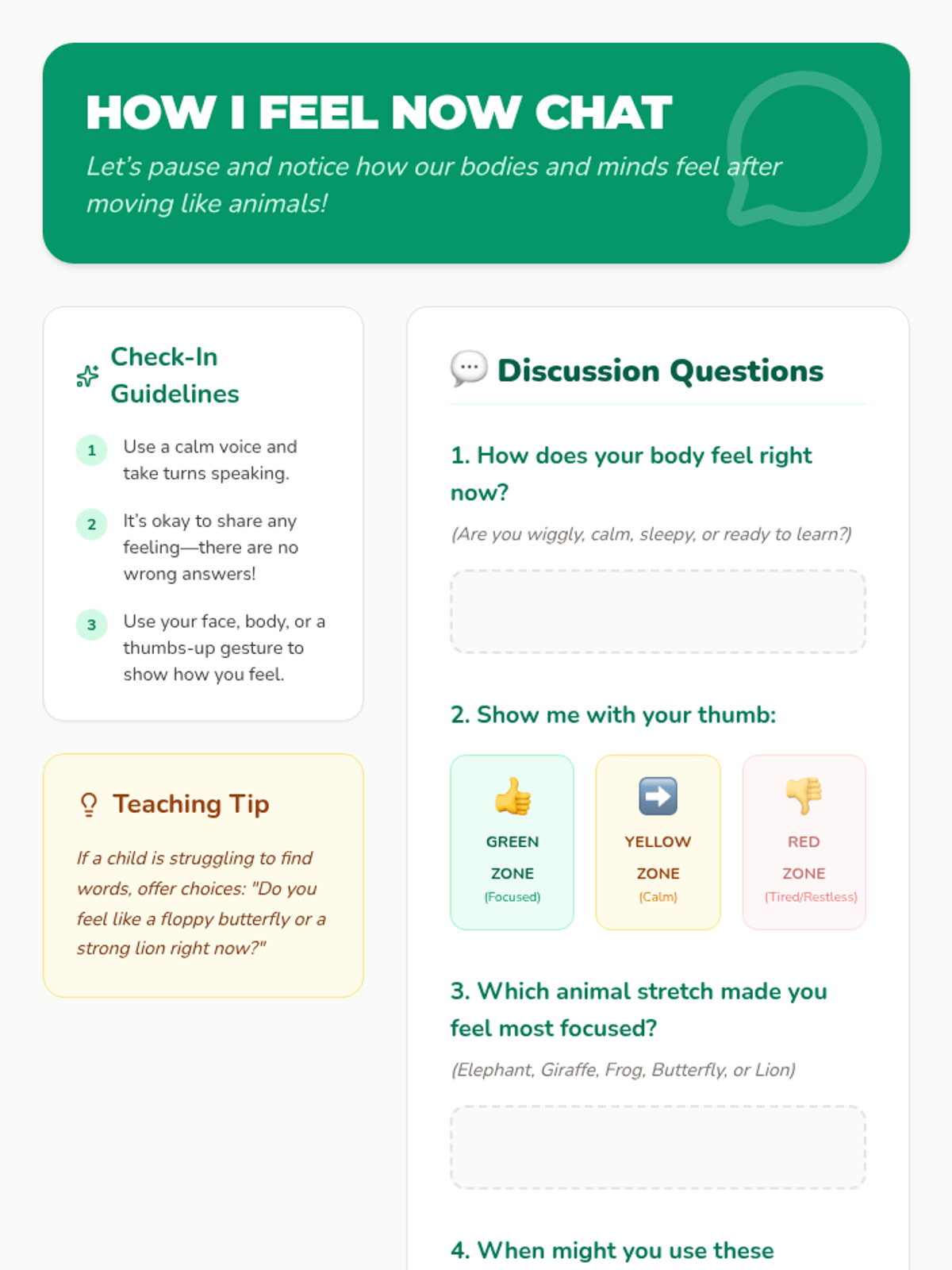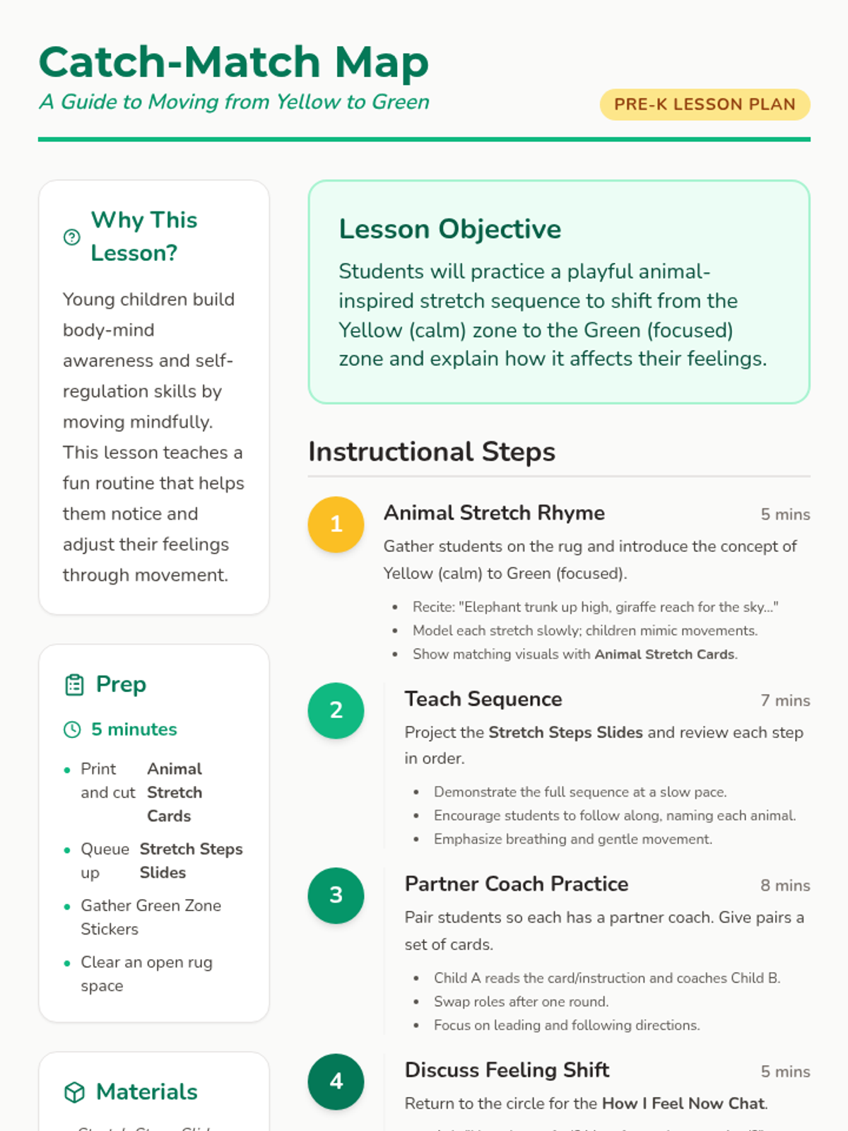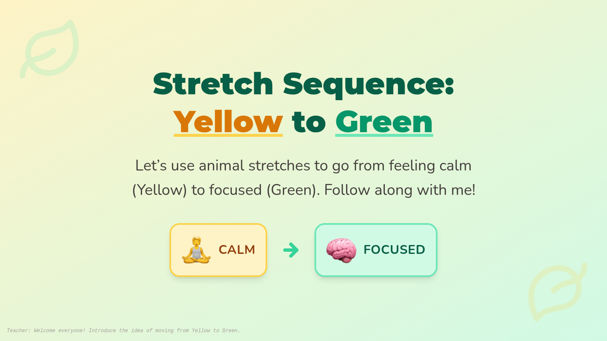 In this playful Pre-K lesson, students learn a fun stretch sequence inspired by animals to move from the Yellow (calm) zone to the Green (focused) zone. Through rhyme, partner practice, and reflection, children build body-mind awareness and learn how mindful movement can change how they feel.