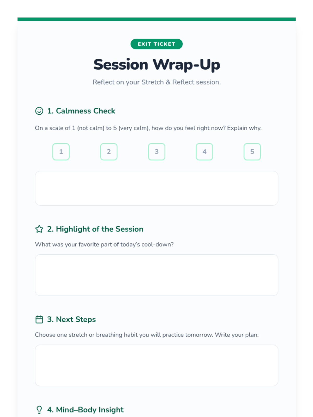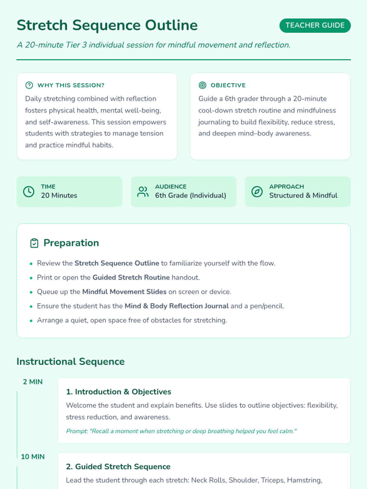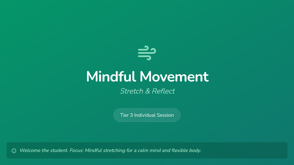 A Tier 3 individual 20-minute session for 6th graders focusing on a cool-down stretching routine and mindfulness journaling to improve flexibility and mental well-being.