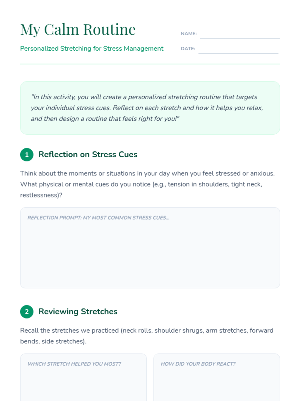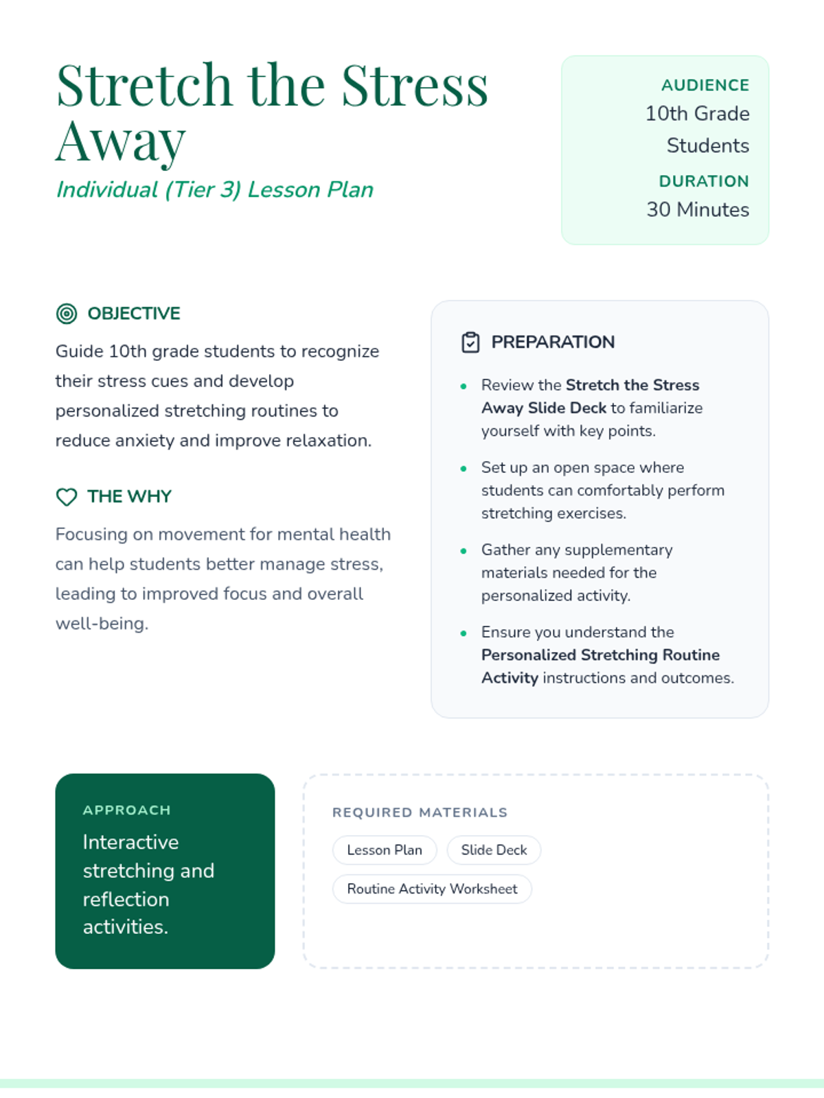 A Tier 3 intervention focused on individualized stretching routines to manage stress cues, reduce anxiety, and promote mental well-being in 10th-grade students.