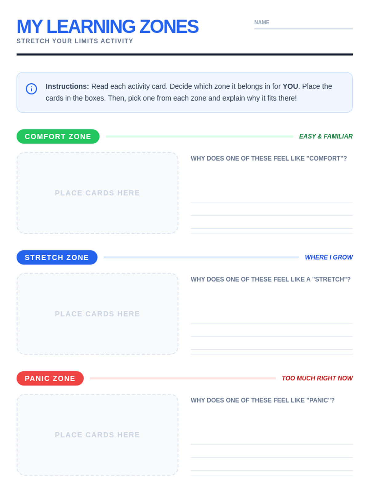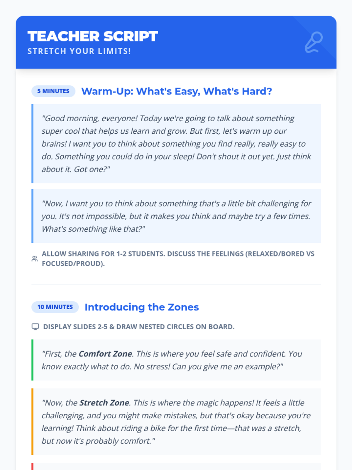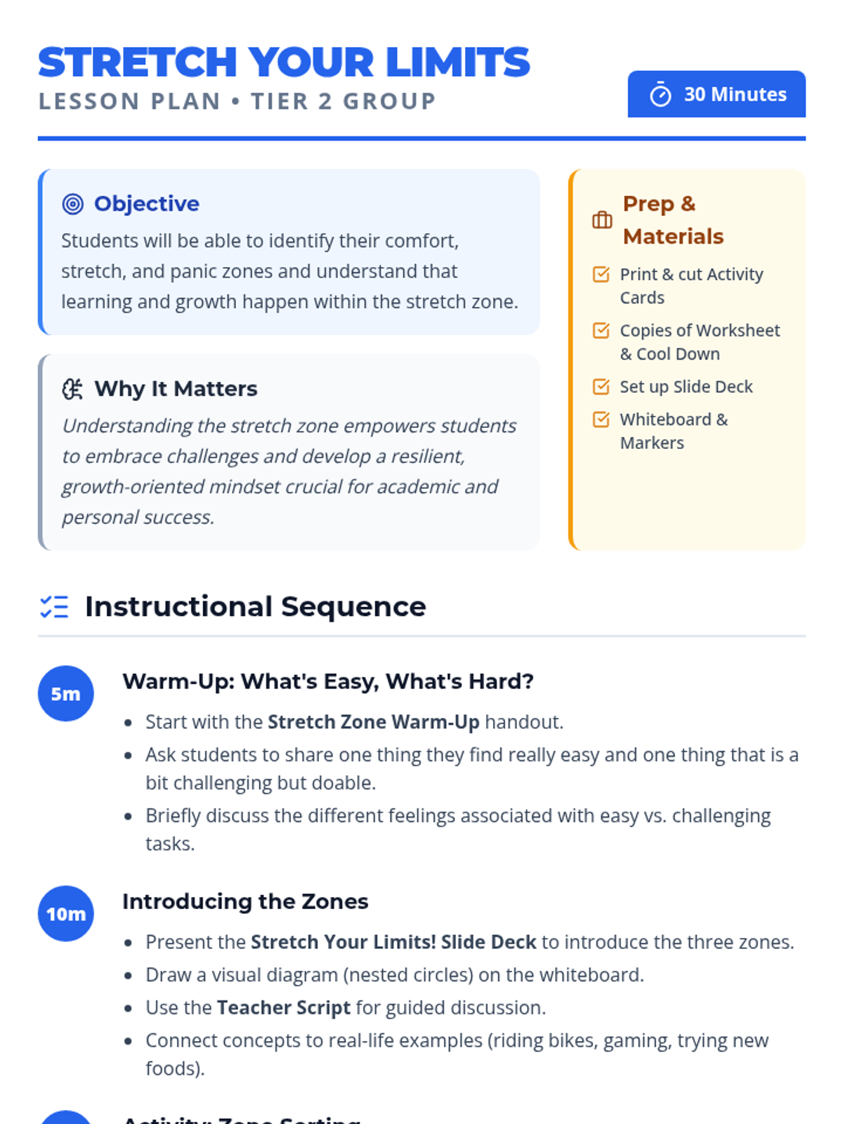 A 30-minute growth mindset lesson for 3rd-grade boys focused on identifying and embracing the 'stretch zone' where learning happens. Students explore comfort, stretch, and panic zones through interactive sorting and reflection.