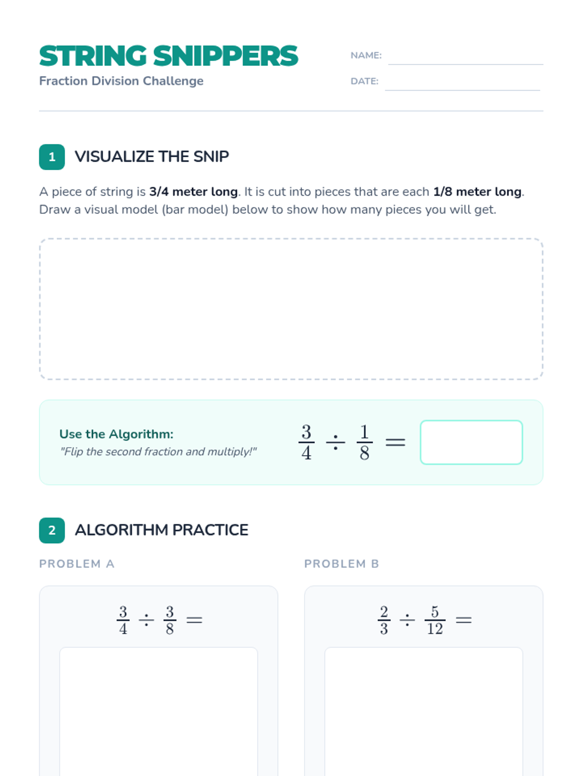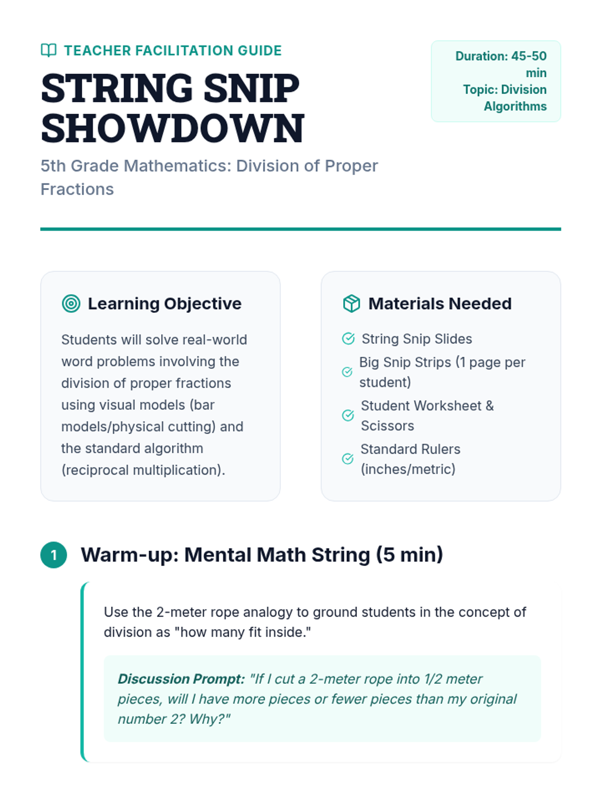 A 5th-grade math lesson that uses a 'string-cutting' analogy to help students visualize and master the division of proper fractions, moving from concrete physical models to the abstract 'flip and multiply' algorithm.