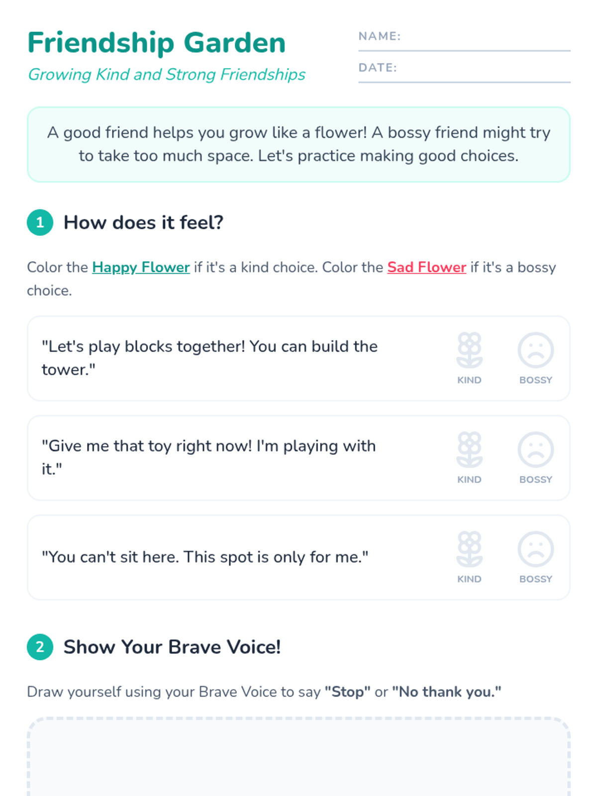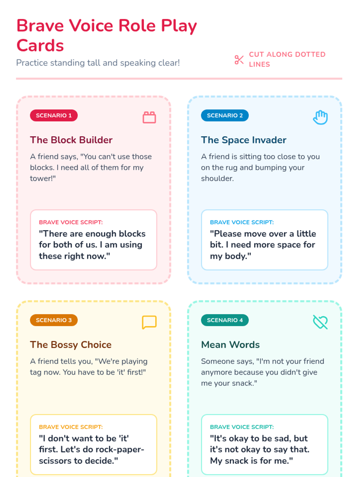 A supportive lesson designed to help sensitive kindergarteners develop assertive communication skills, set healthy boundaries, and gain confidence in social interactions.