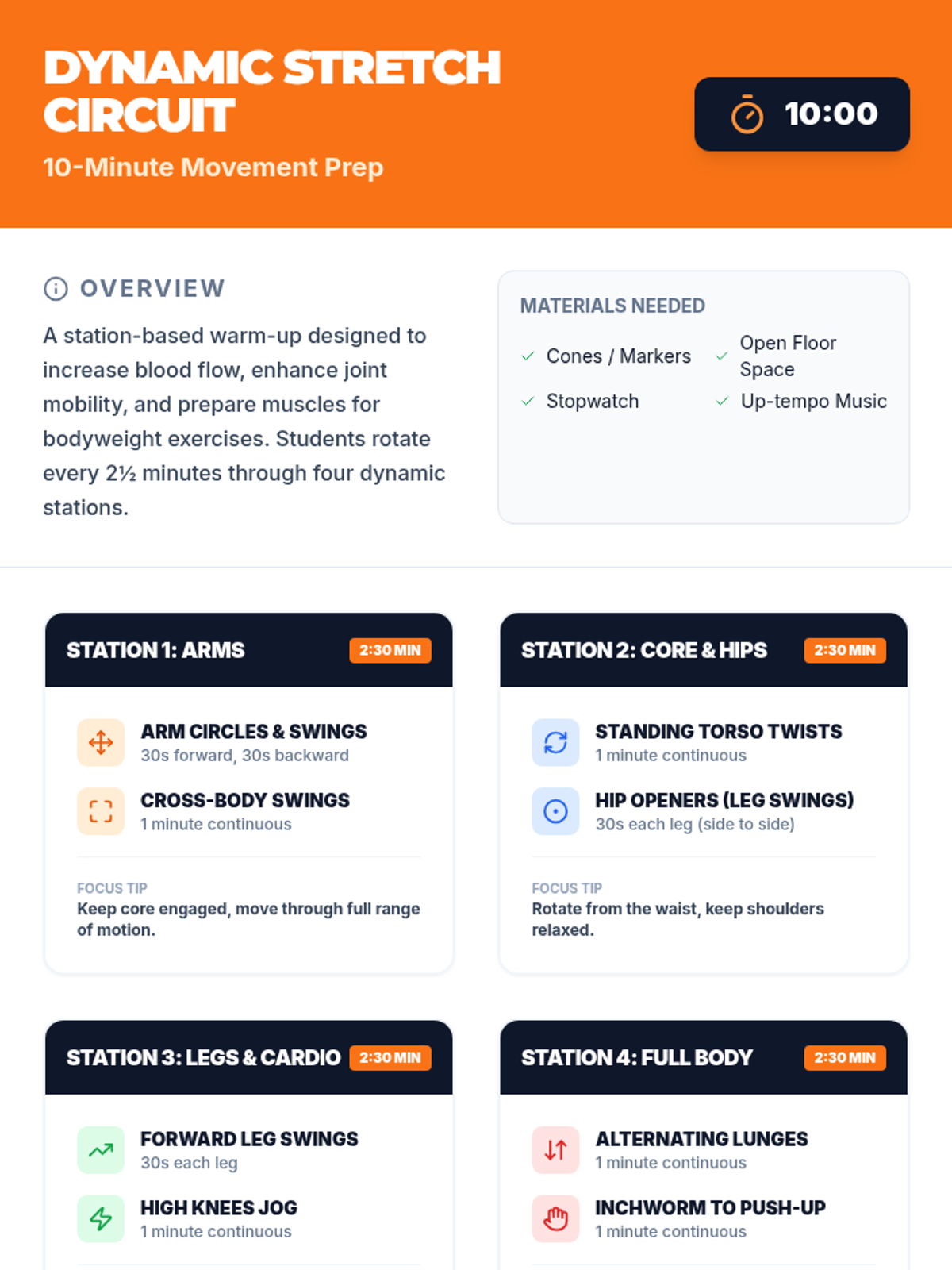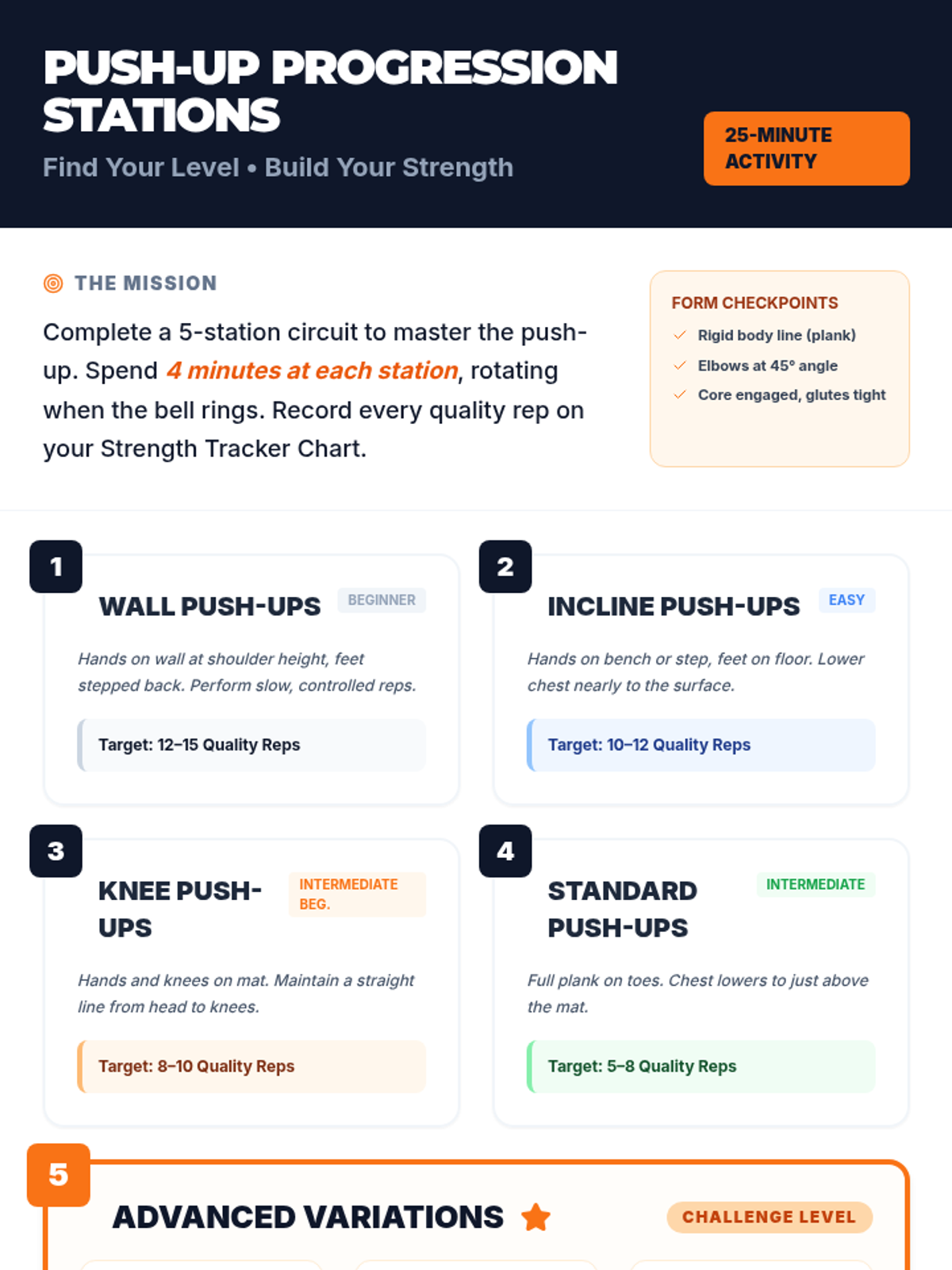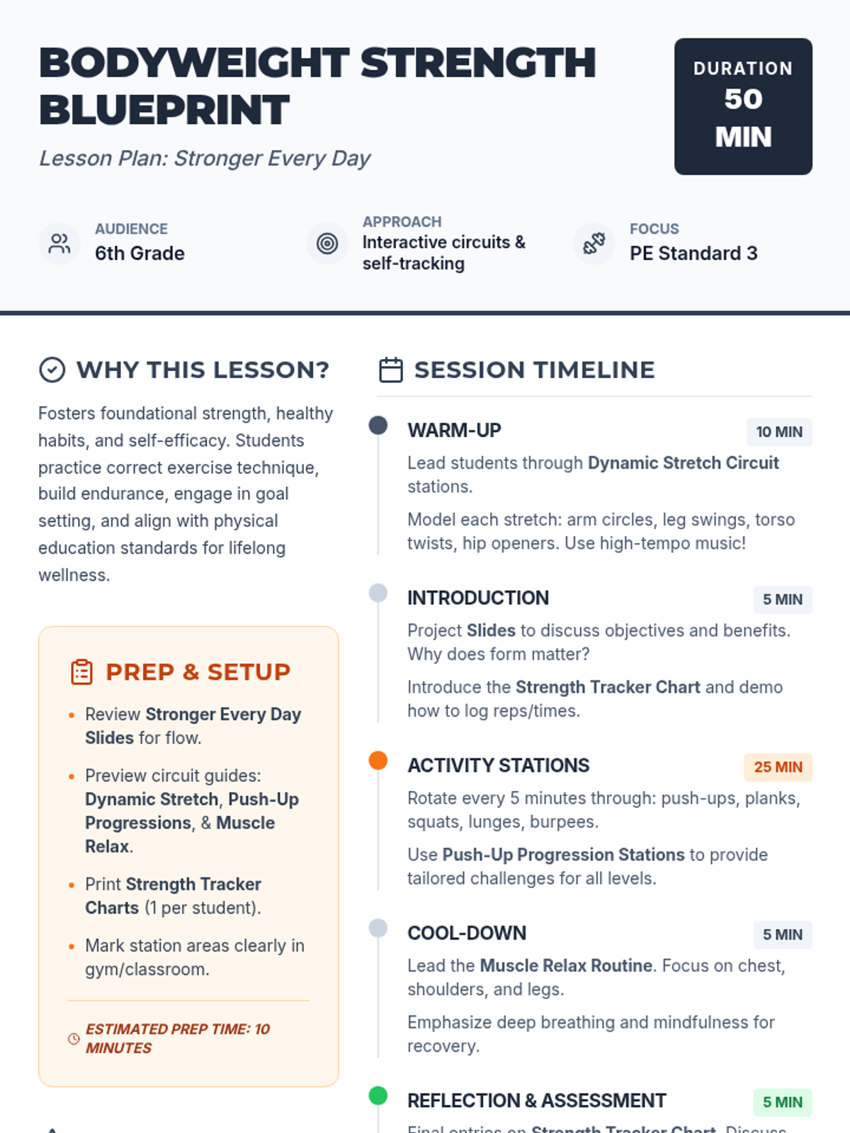 A structured bodyweight exercise program for 6th graders focusing on foundational strength, proper technique, and incremental progress tracking. Students rotate through dynamic warm-ups, progressive push-up stations, and mindful cool-downs while documenting their growth.