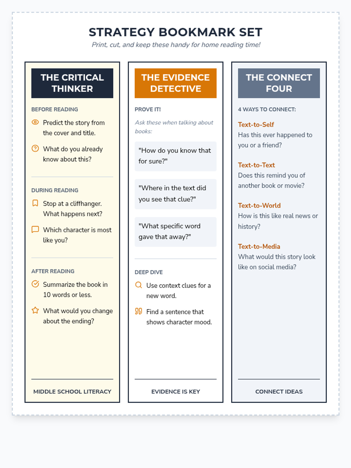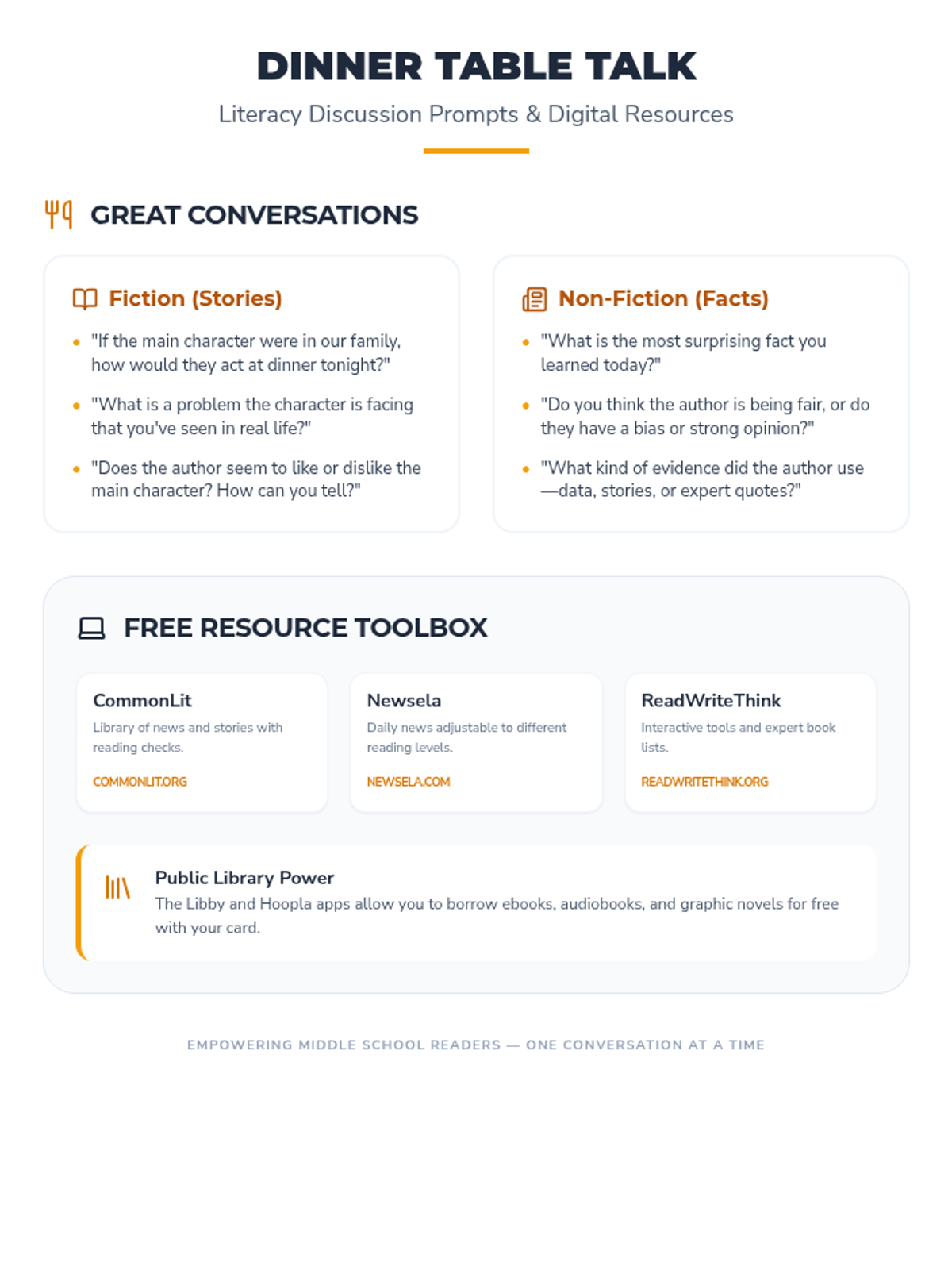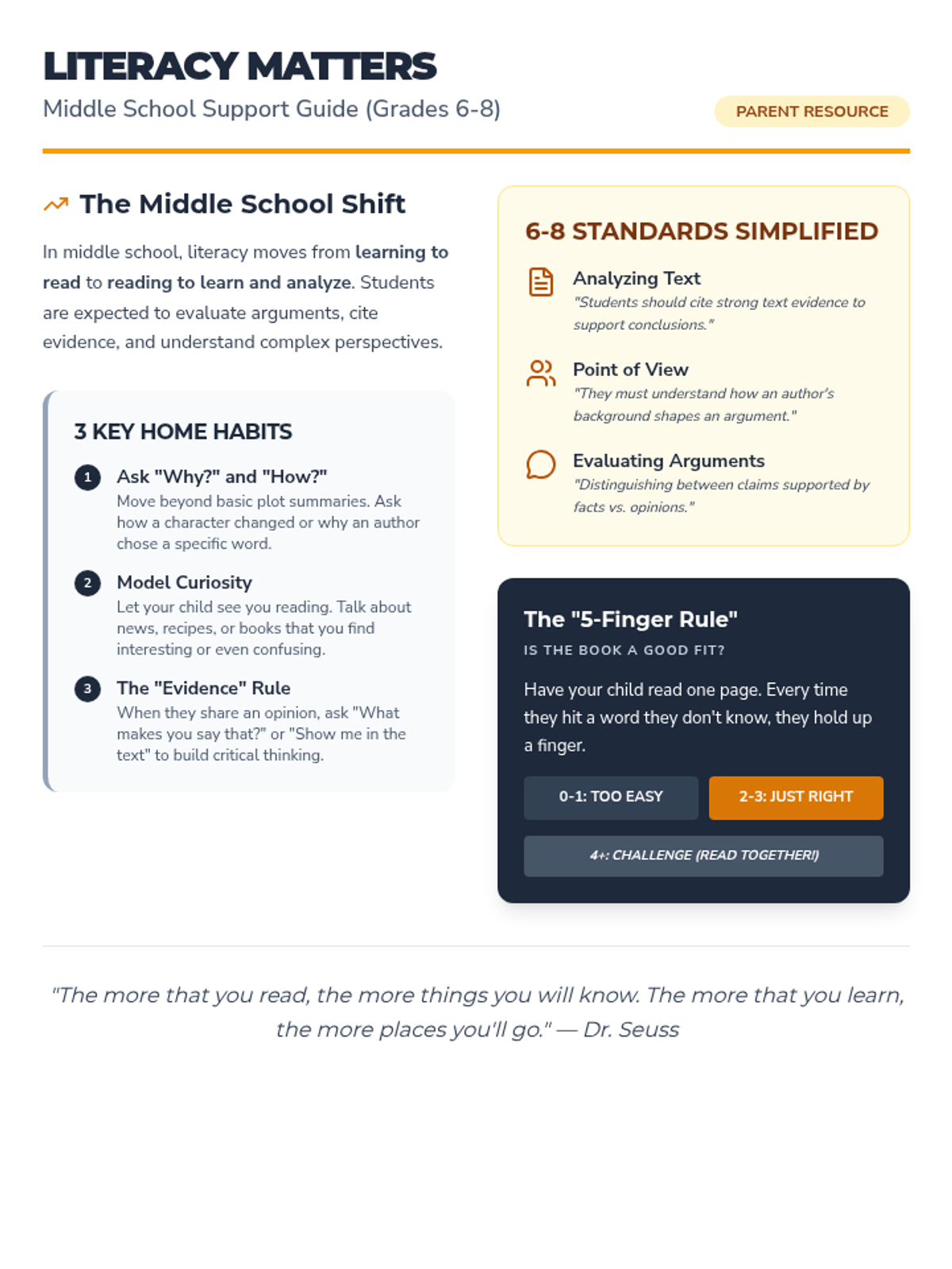 A comprehensive set of resources for middle school parents to support literacy development at home, covering reading comprehension, critical thinking, and discussion strategies aligned with 6-8 standards.