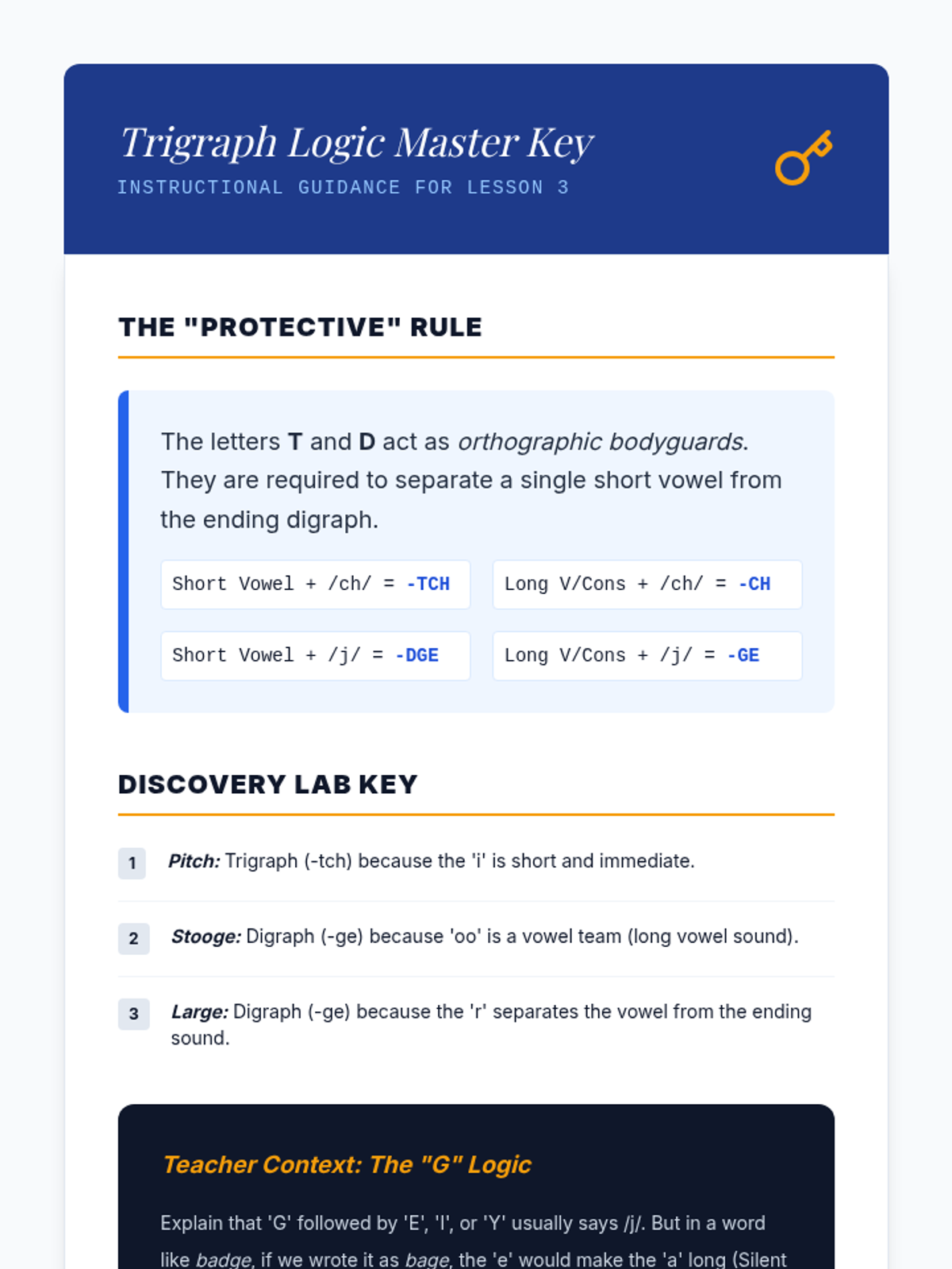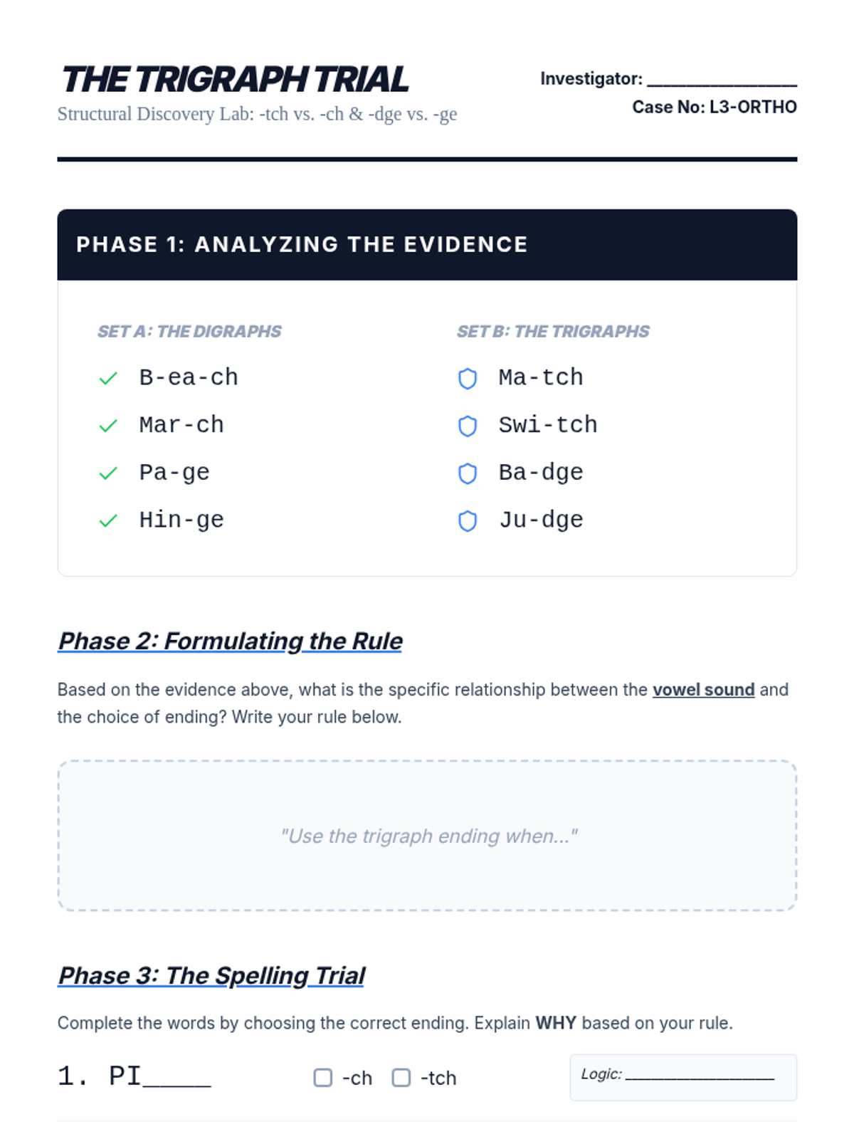 Students analyze the complex consonant trigraphs -tch and -dge, discovering the orthographic rules that govern their usage following short vowels.