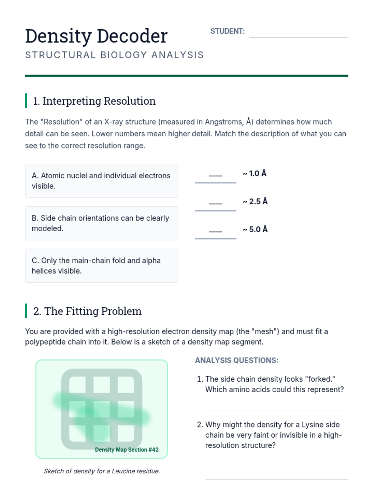 Explores the physics and methodology behind X-ray crystallography and NMR spectroscopy. Students learn to interpret diffraction patterns, electron density maps, and chemical shifts to solve for 3D protein structures.