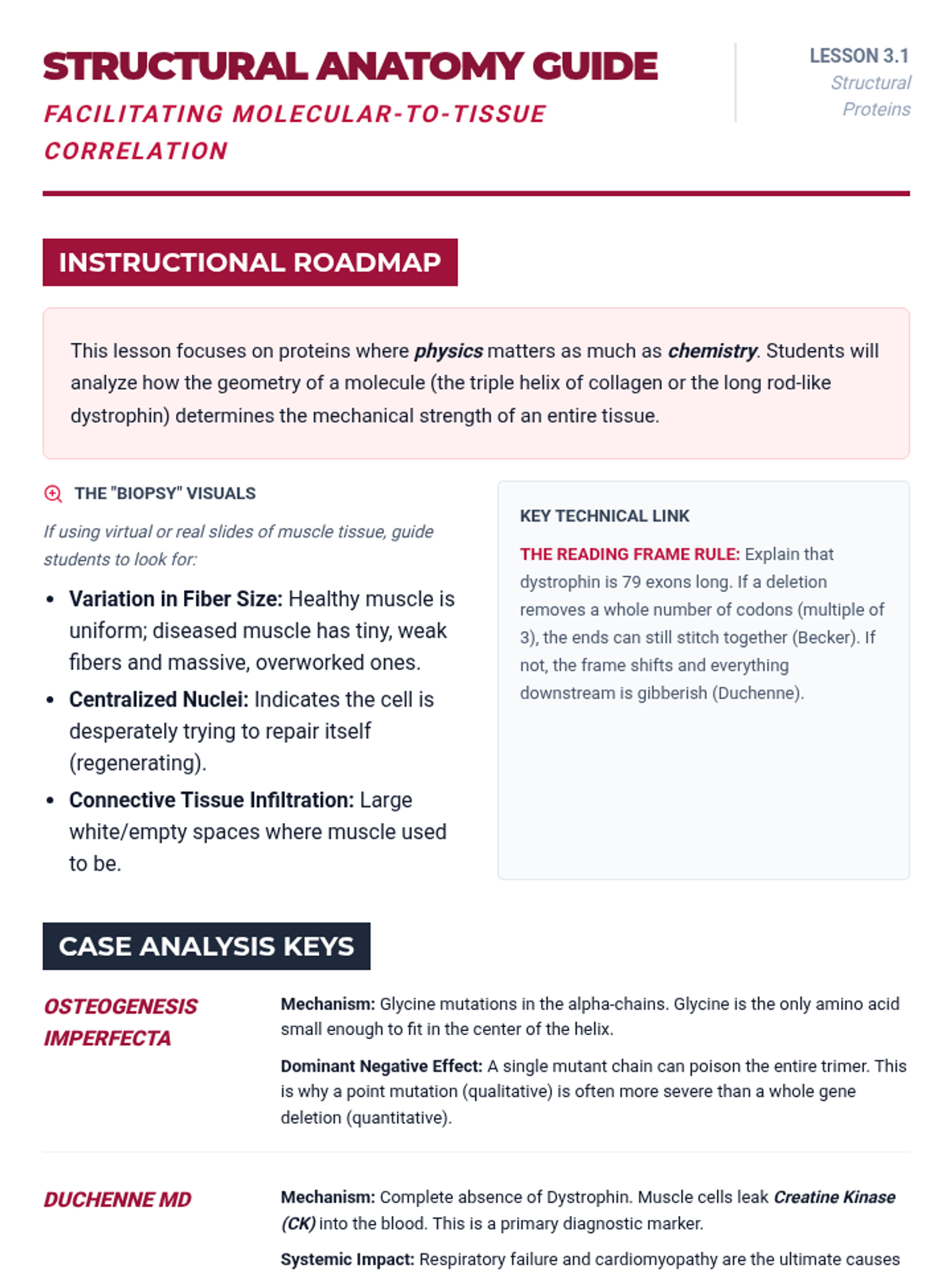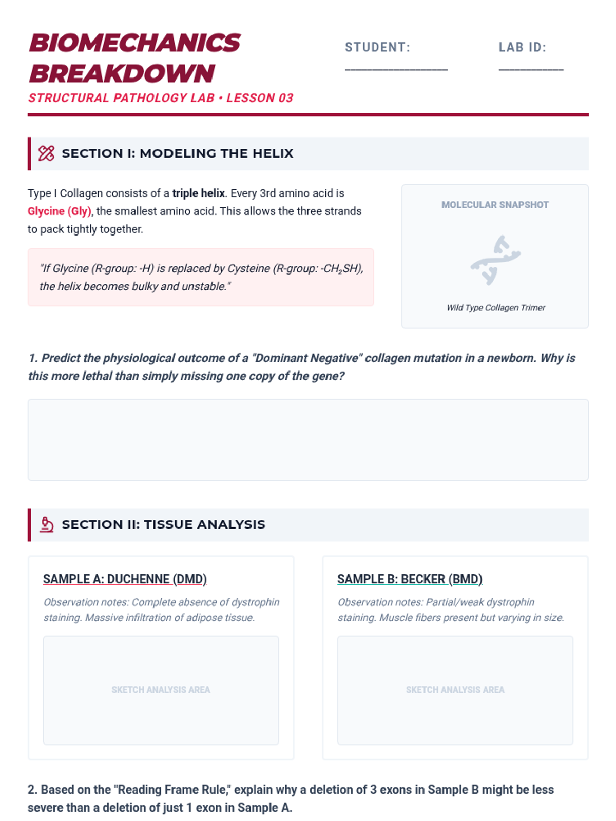 Students investigate diseases affecting structural proteins, focusing on Collagen in Osteogenesis Imperfecta and Dystrophin in Muscular Dystrophy to relate molecular-level mechanical failure to clinical tissue pathology.