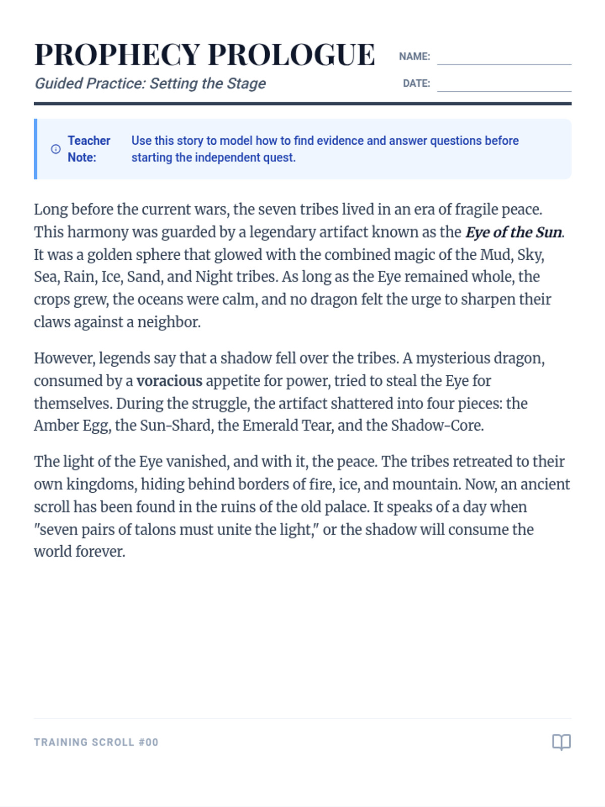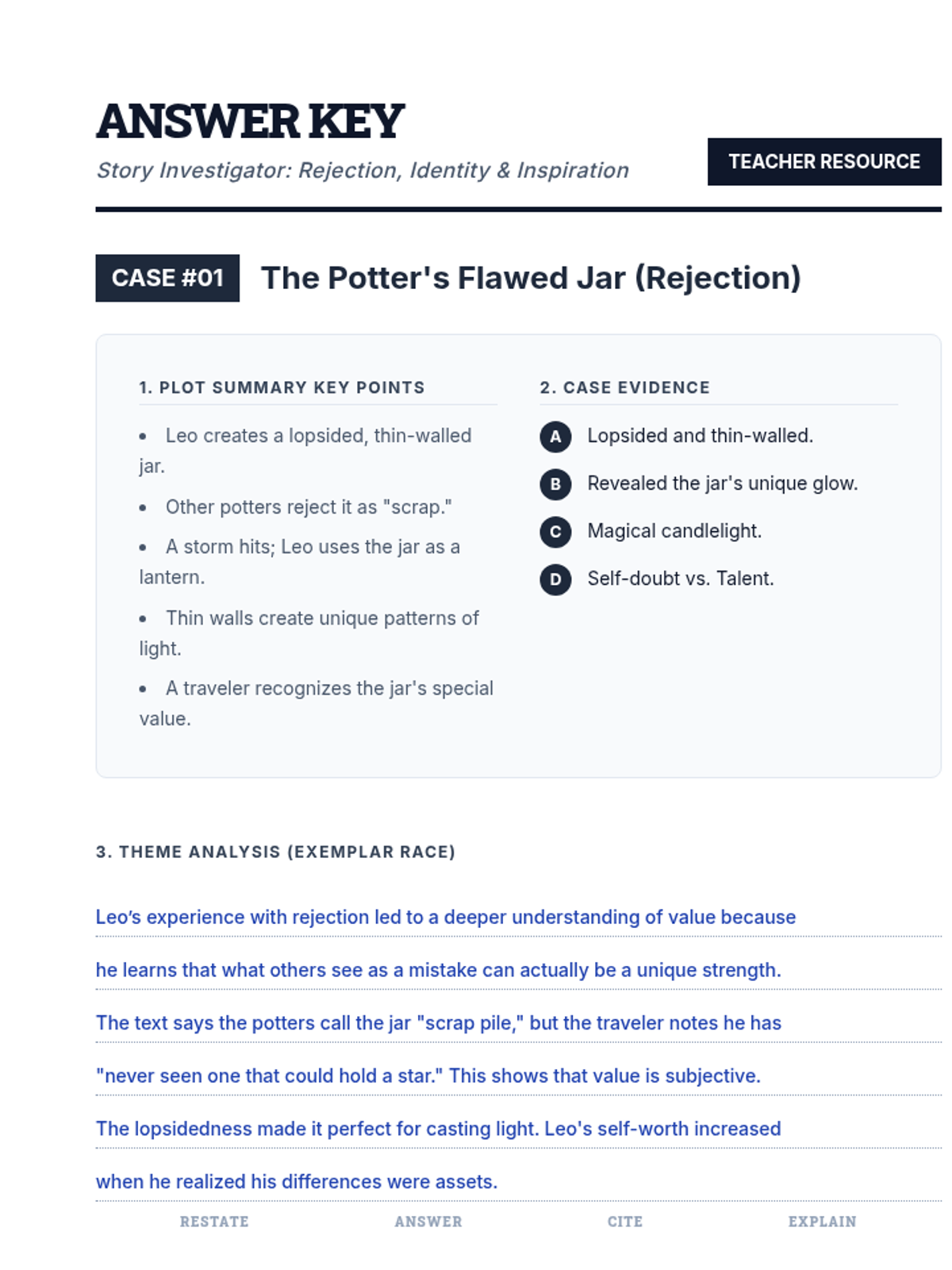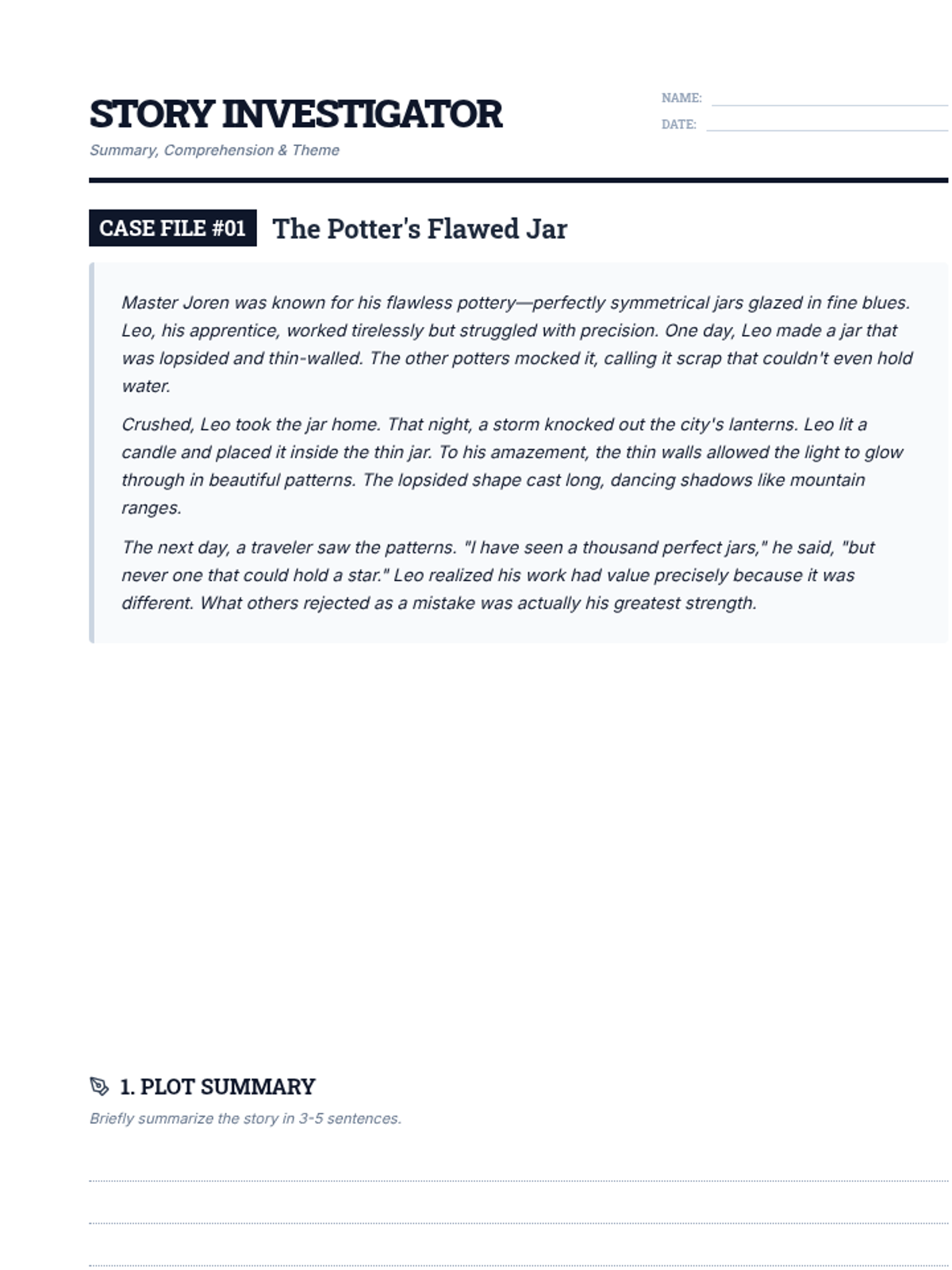 Students analyze short stories through the lens of a "Story Investigator," focusing on the themes of rejection, identity, and inspiration. The lesson uses a detective-themed approach to teach plot summarization, multiple-choice comprehension, and RACE-formatted theme analysis.
