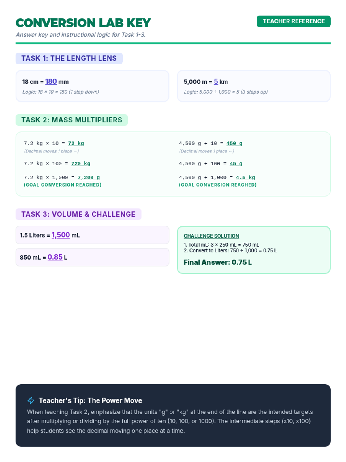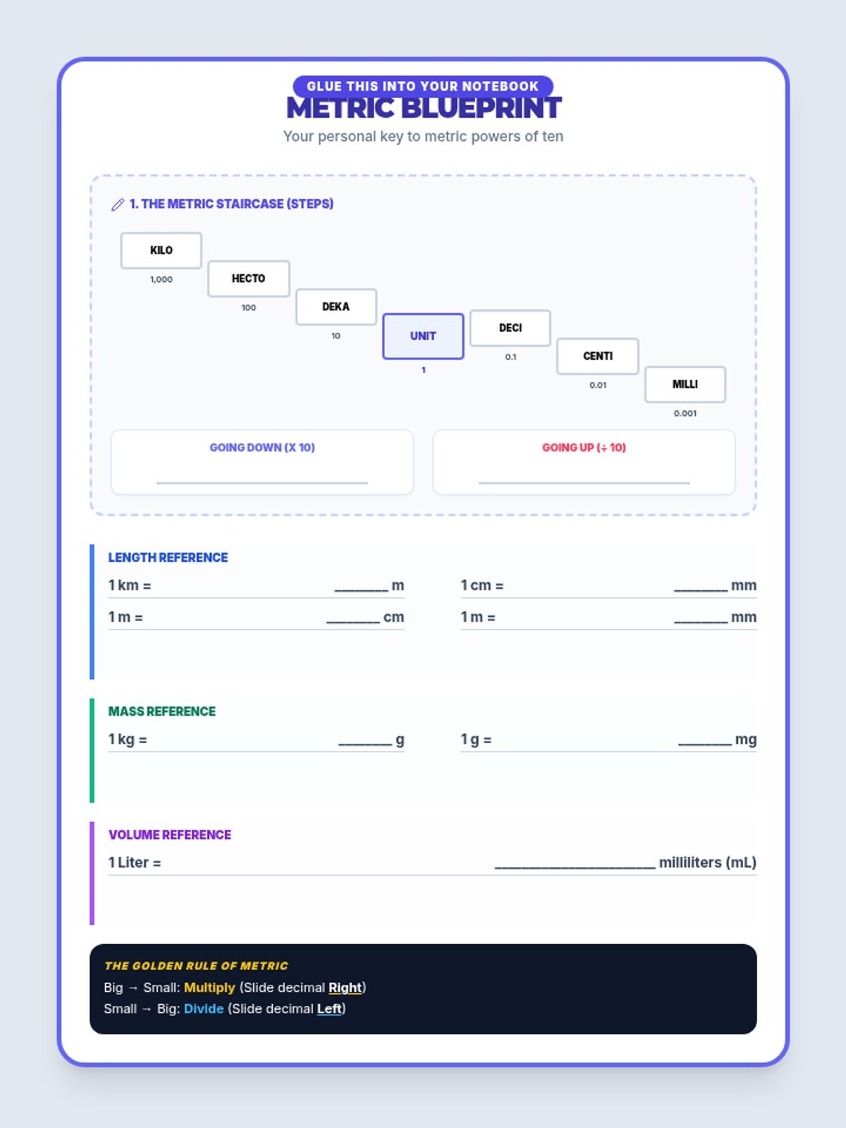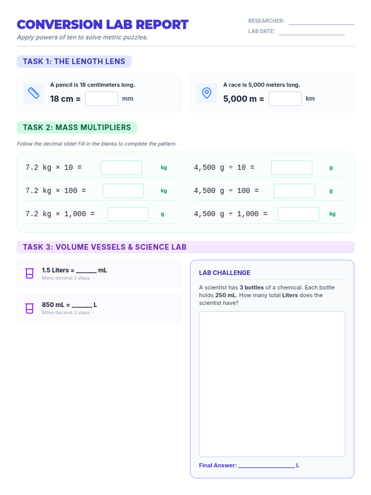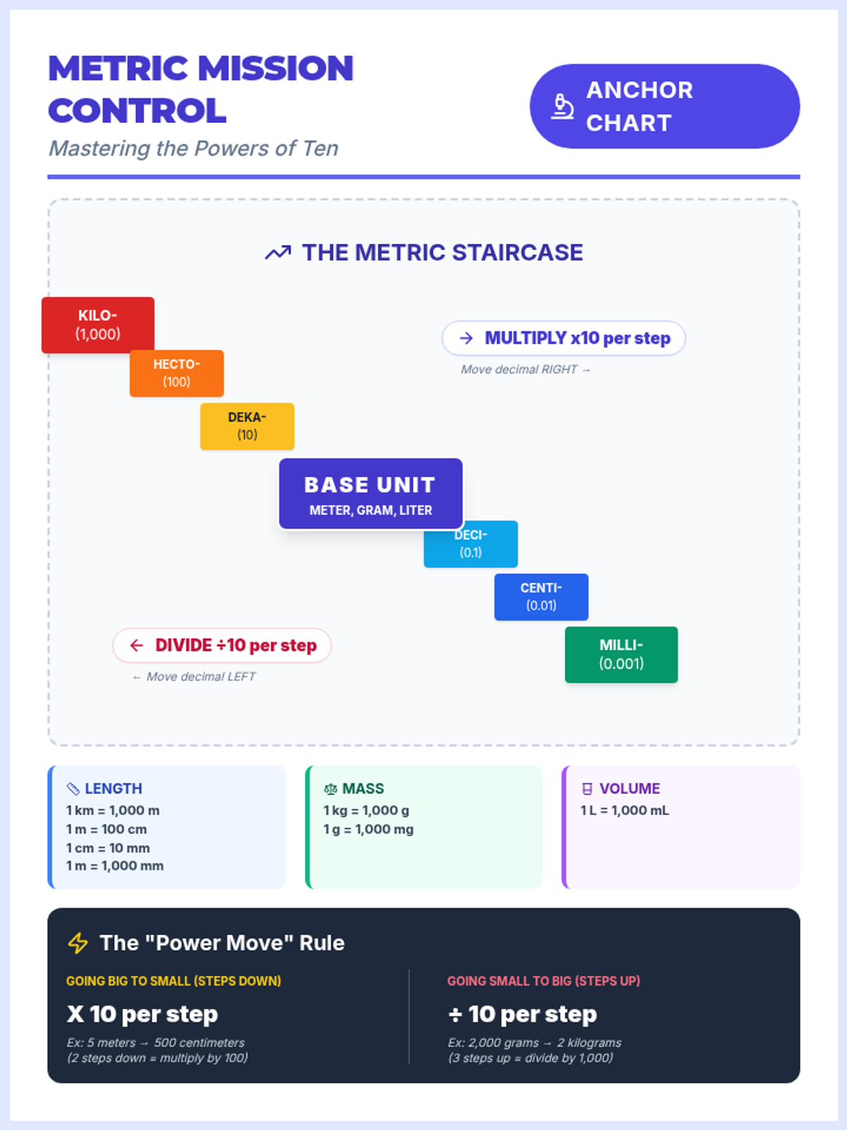 Students explore the relationship between metric units and powers of ten, using visual staircases and laboratory 'blueprints' to master conversions.
