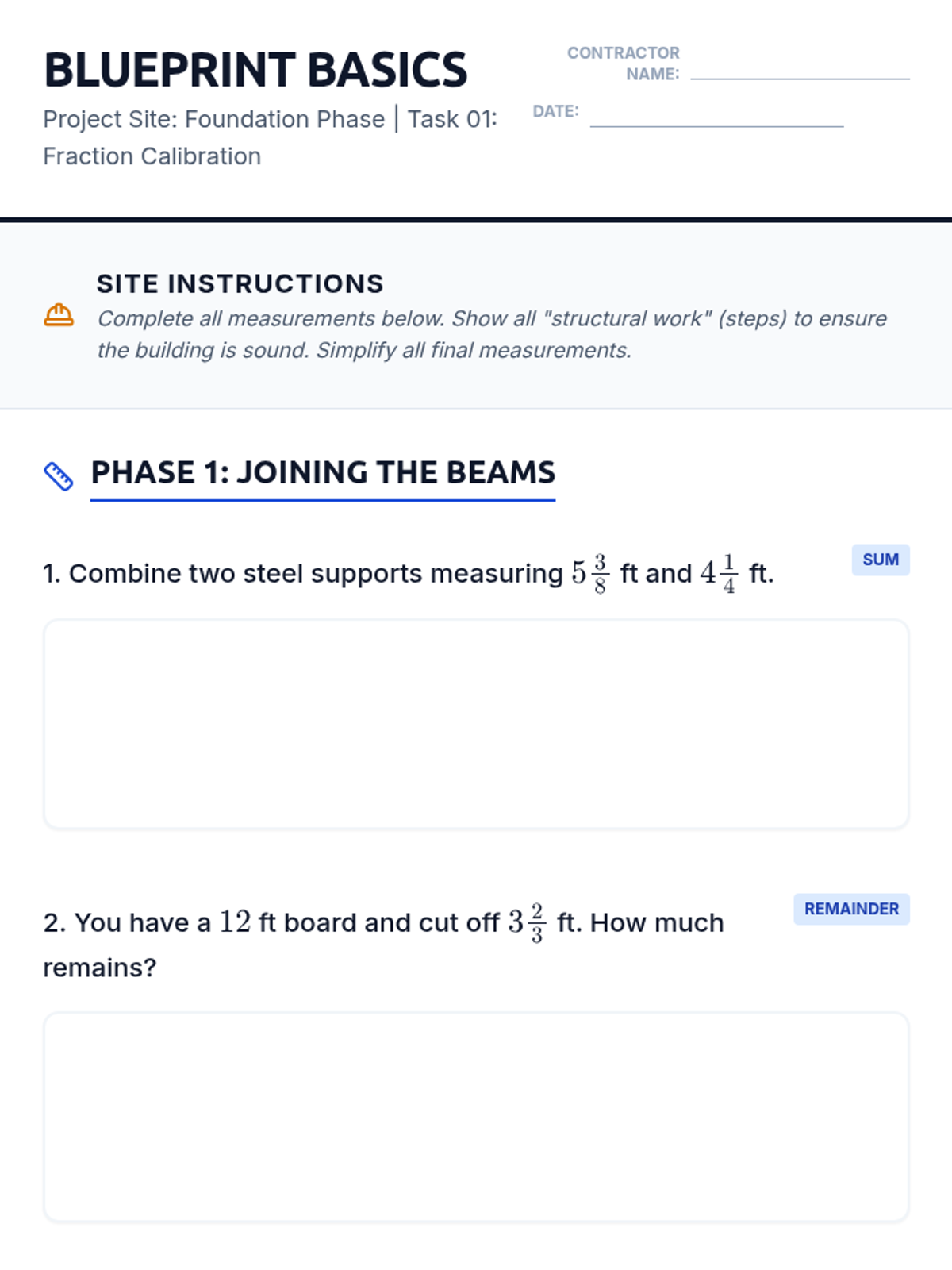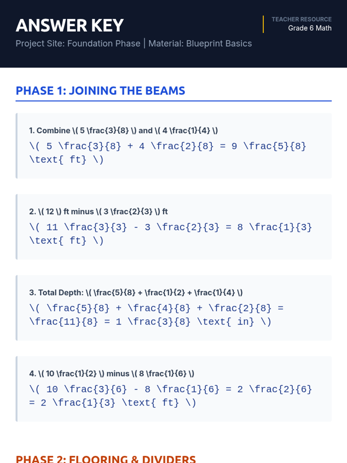 Focuses on 6th-grade fraction operations (addition, subtraction, multiplication, division) through the lens of foundational construction measurements.