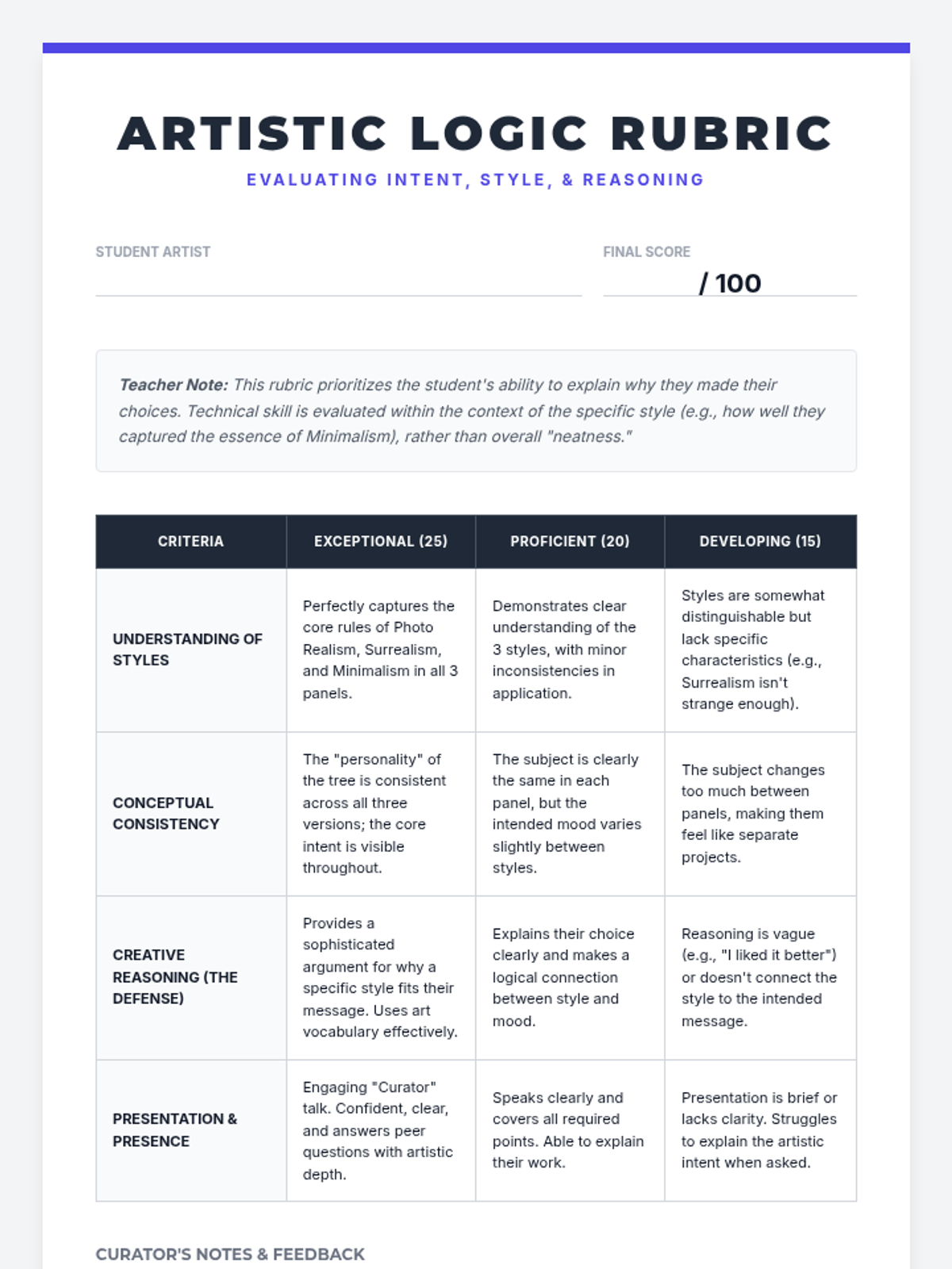 A multi-day art project for middle schoolers focusing on artistic intent over technical realism. Students create a single subject in three distinct styles—Photo Realism, Surrealism, and Minimalism—to discover how style influences message.