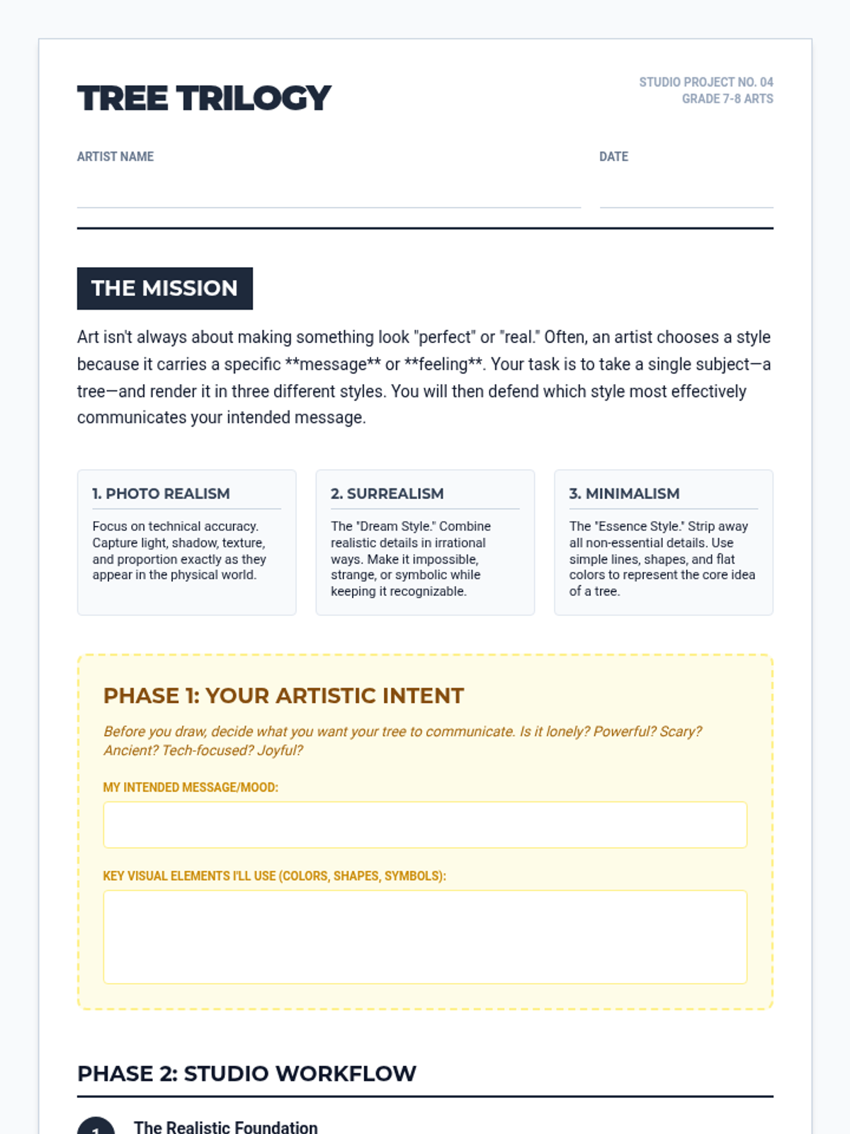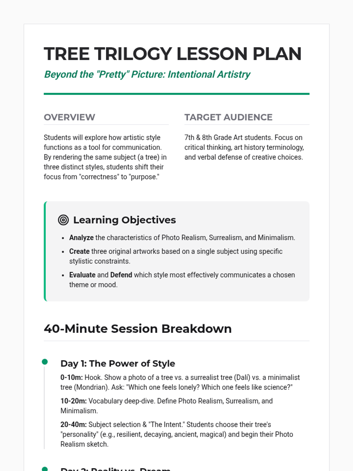 A middle school art lesson where students explore how different artistic styles communicate distinct messages using a single subject. Students create three versions of a tree and defend their stylistic choices based on their intended emotional or conceptual goal.