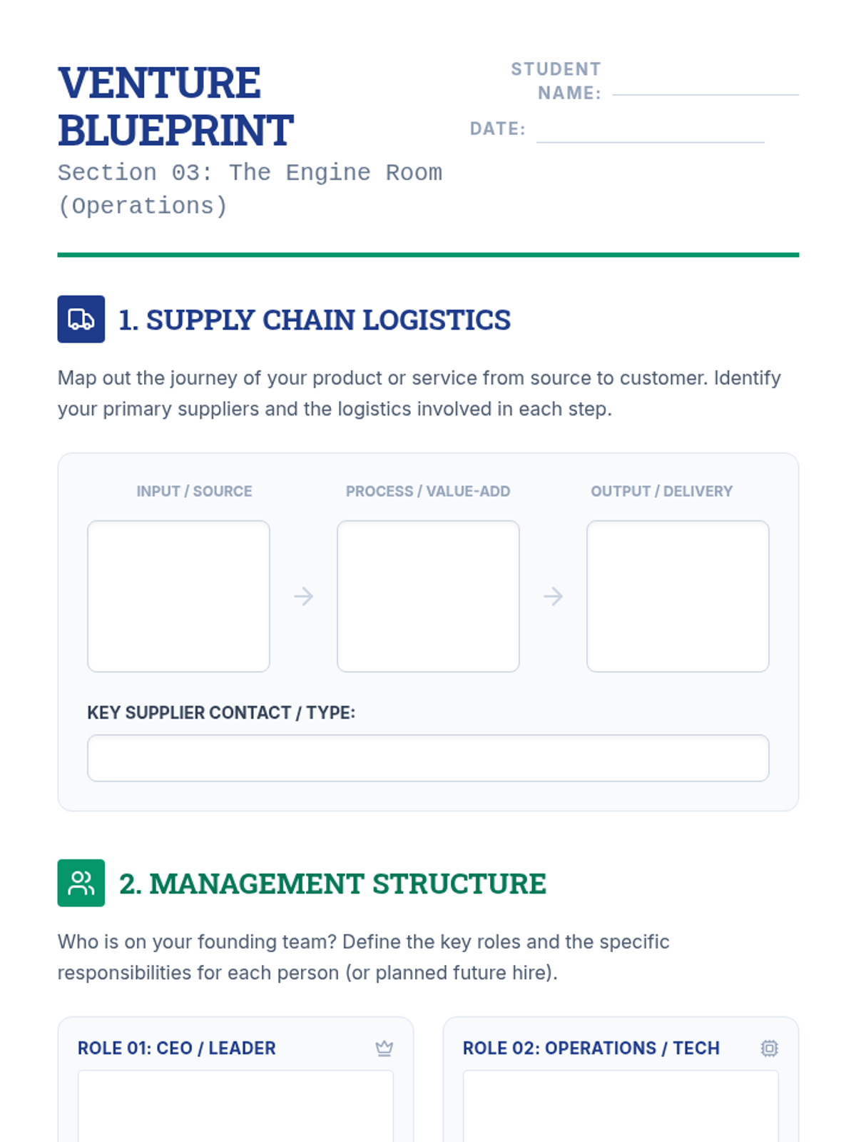 Students map out logistical requirements, including supply chains, organizational structure, and operational workflows, focusing on feasibility and efficiency.