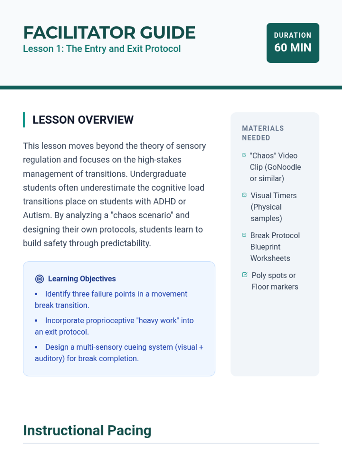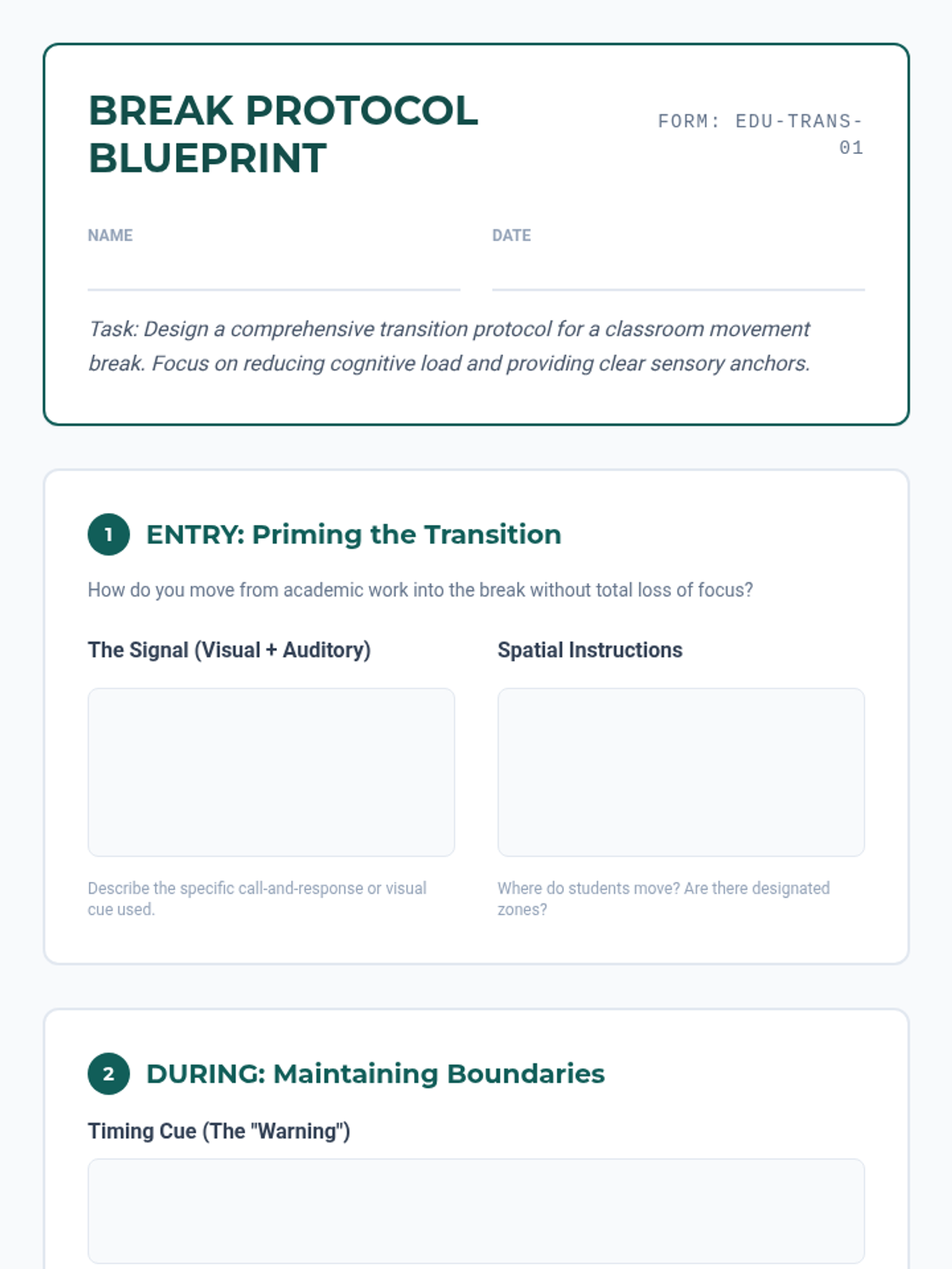 Students design protocols for the beginning and end of movement breaks, focusing on timers and visual cues to prevent chaos.