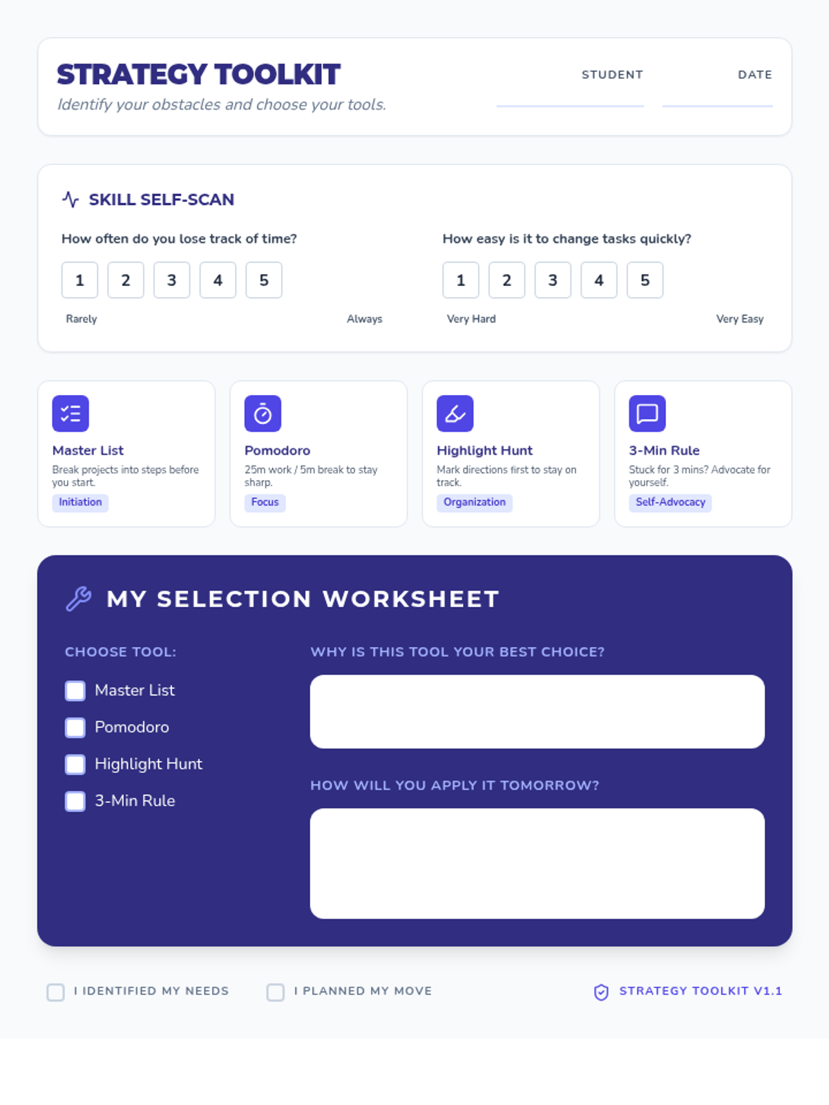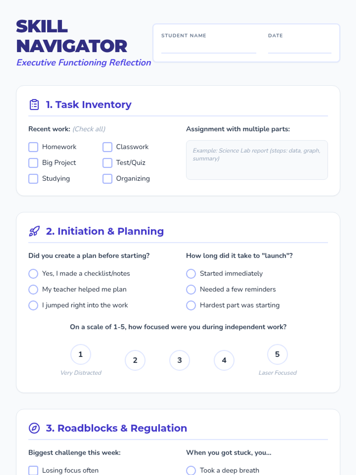 A comprehensive lesson focused on identifying and improving executive functioning skills through self-reflection and strategy building.