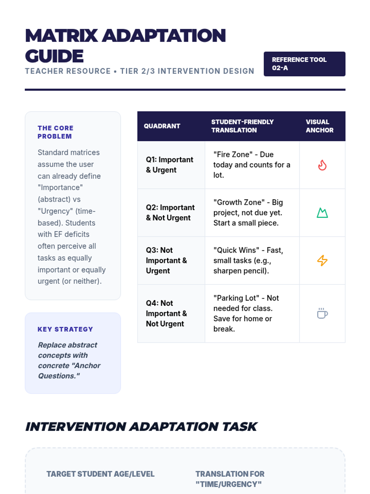 Adapting complex urgency matrices like the Eisenhower Box into student-friendly formats for K-12 special education.
