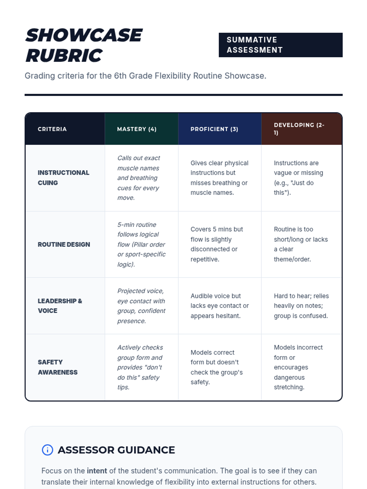Students demonstrate their mastery of flexibility concepts by leading a small group through a custom-designed 5-minute routine. This culminating showcase focuses on instructional clarity, leadership skills, and the practical application of stretching techniques.