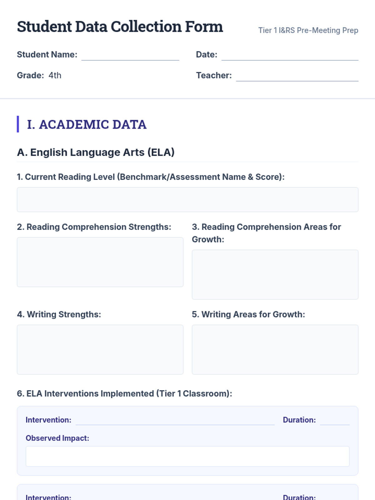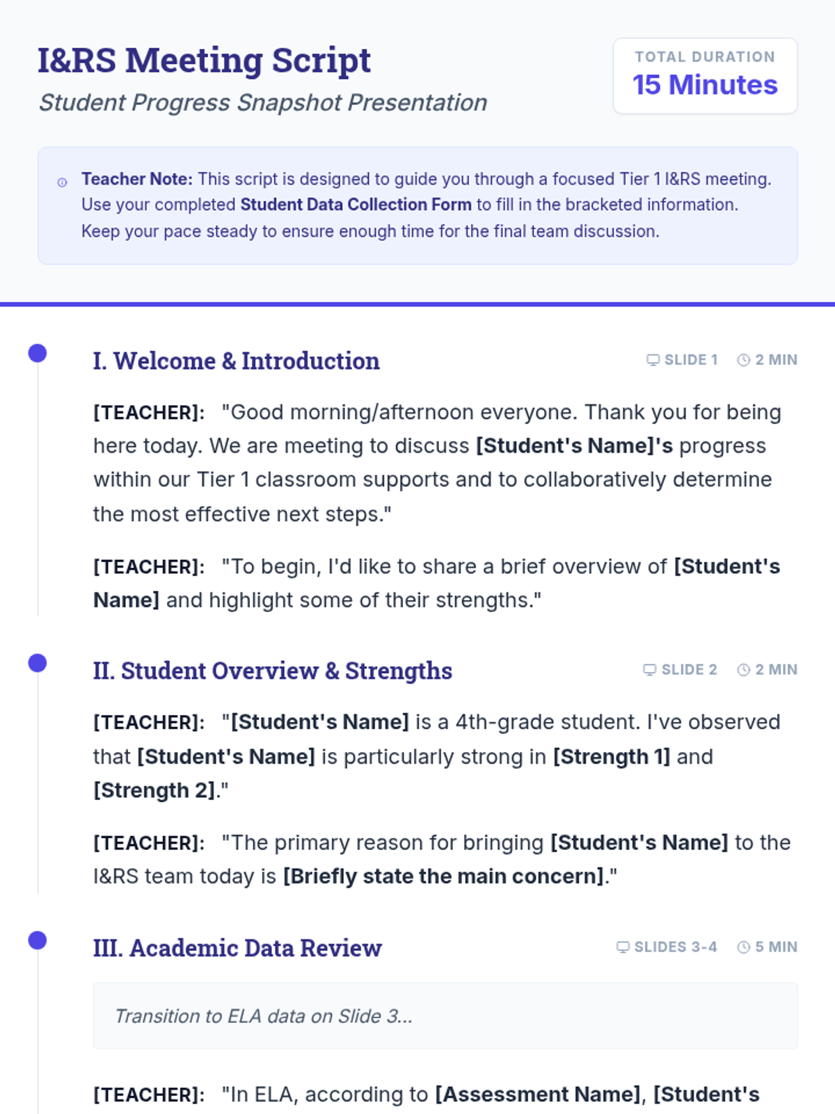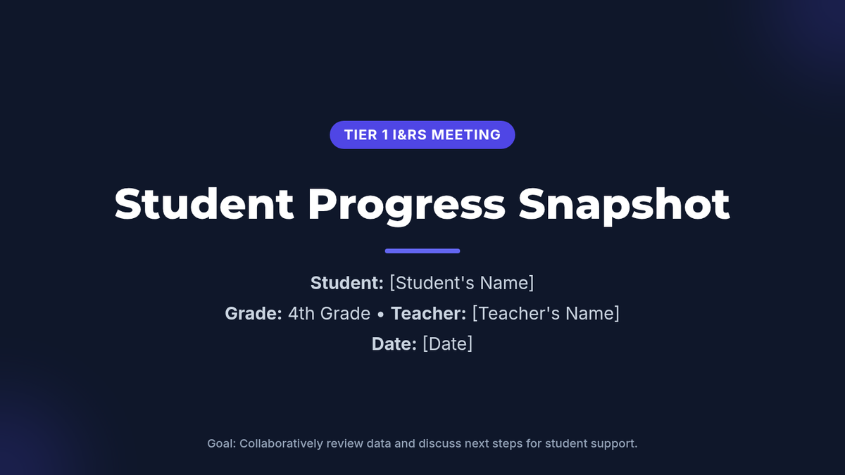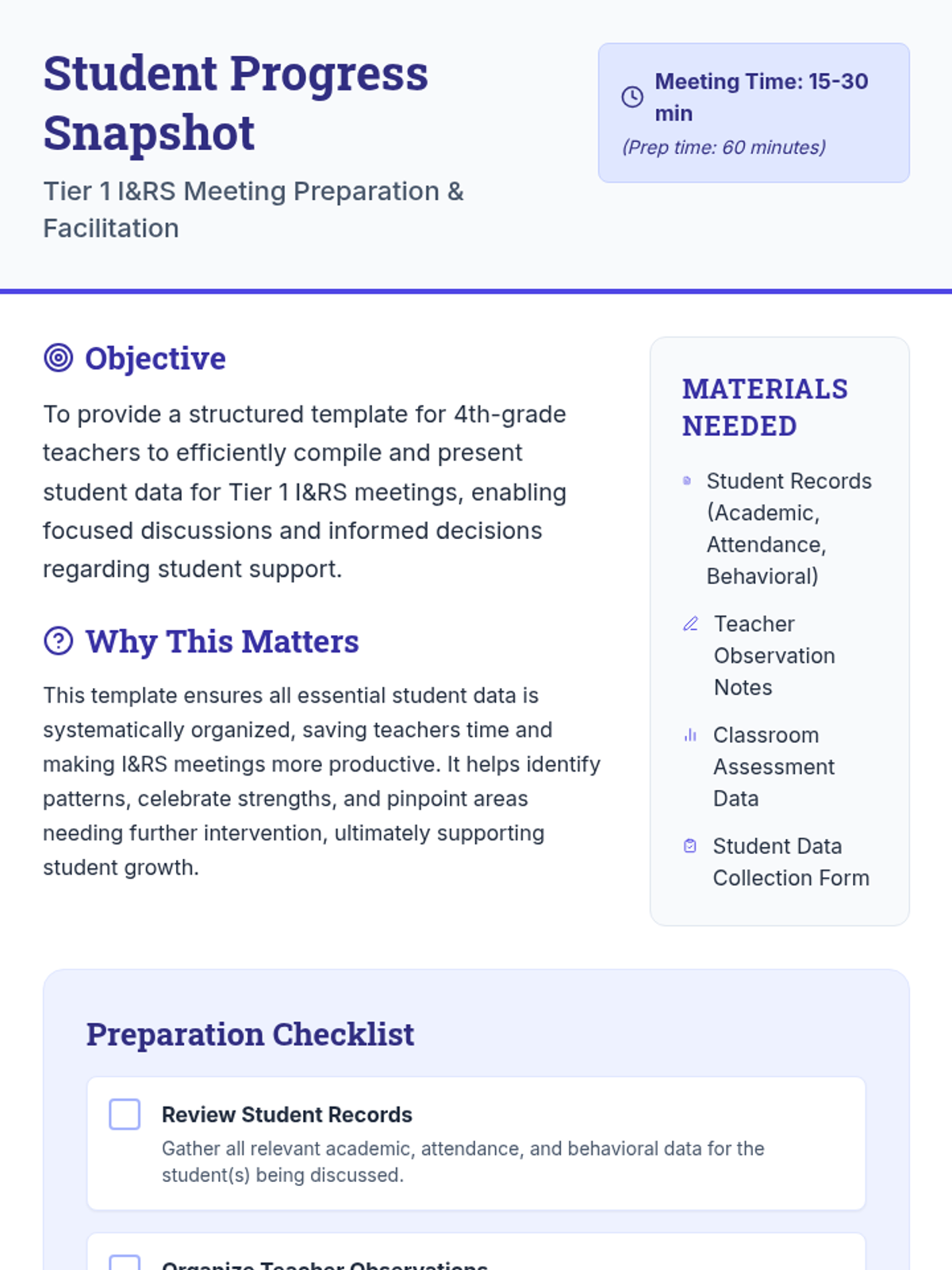 A structured guide and toolkit for 4th-grade teachers to efficiently compile, organize, and present student data during Tier 1 I&RS meetings, ensuring productive 30-minute collaborative discussions.