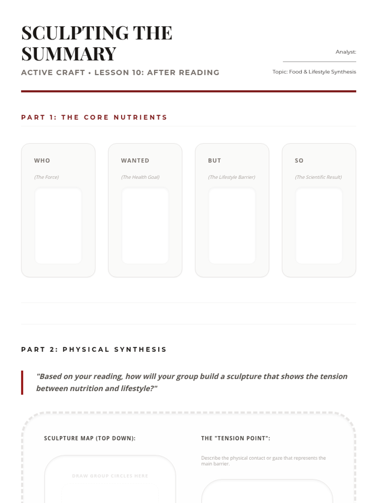 After Reading Strategy: Synthesizing information into 'Summary Sculptures' focused on food items and healthy lifestyles.