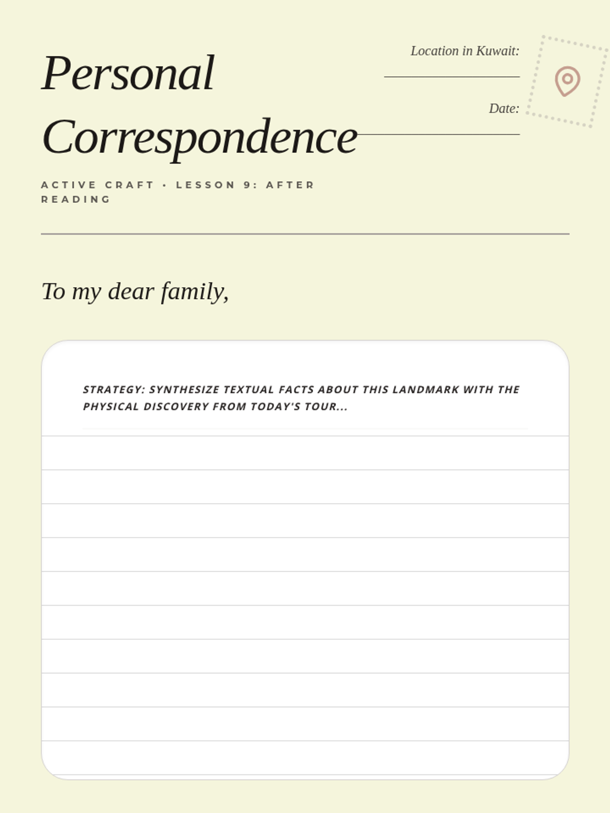 After Reading Strategy: Writing from the perspective of characters visiting cultural and educational places in Kuwait to synthesize meaning.