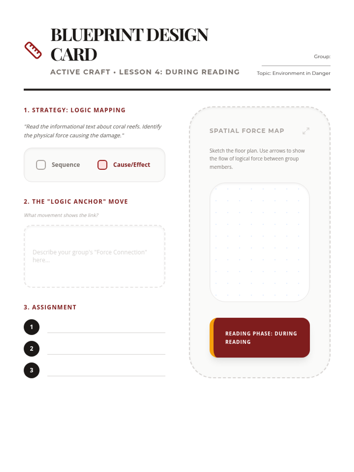 During Reading Strategy: Using physical poses to represent informational text structures like cause/effect focused on environmental danger.