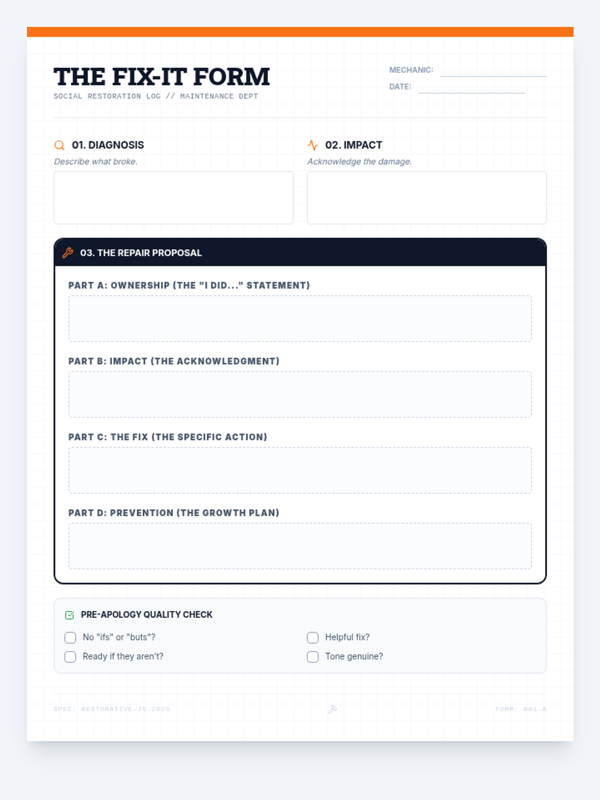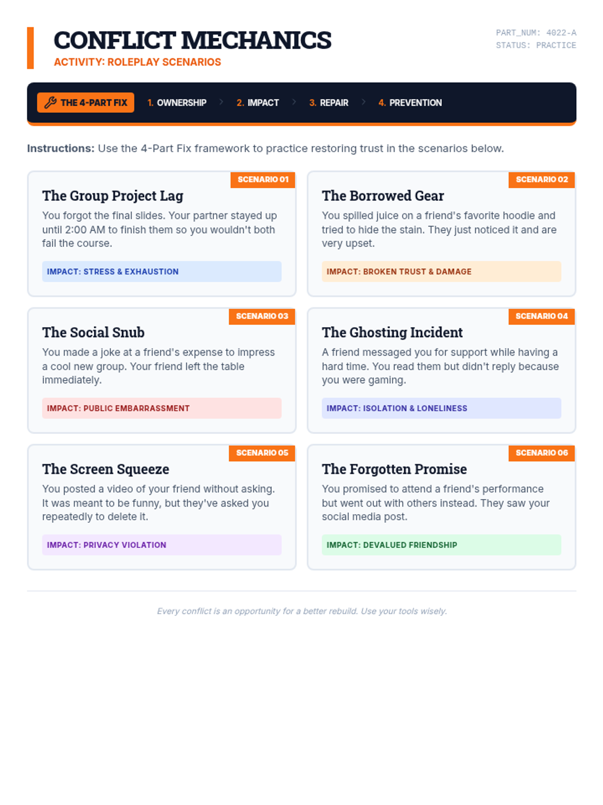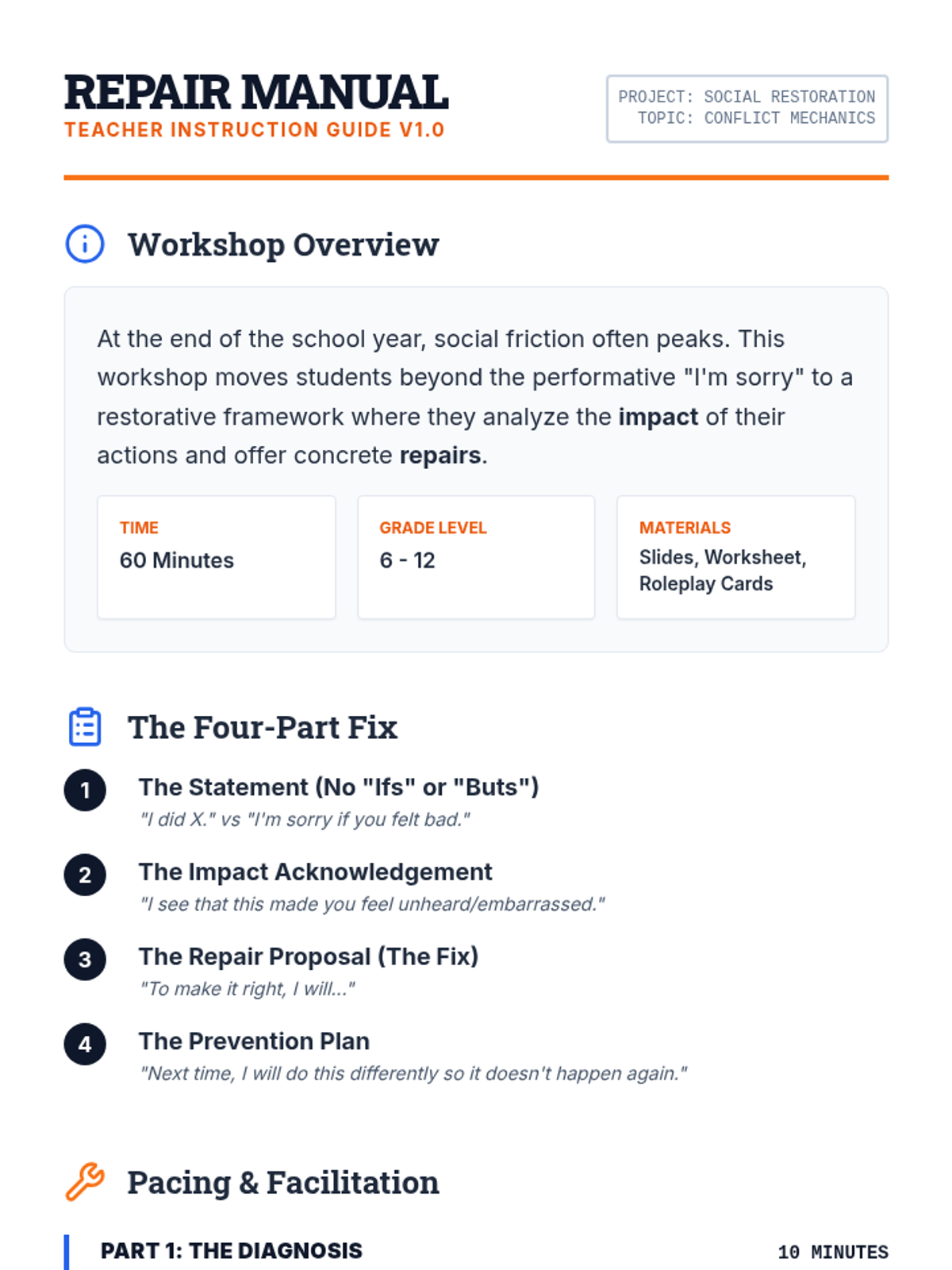 A restorative justice workshop for middle and high schoolers focused on the 'mechanics' of a genuine apology. Students learn to diagnose social friction and use specific tools to repair relationships after end-of-year conflict.