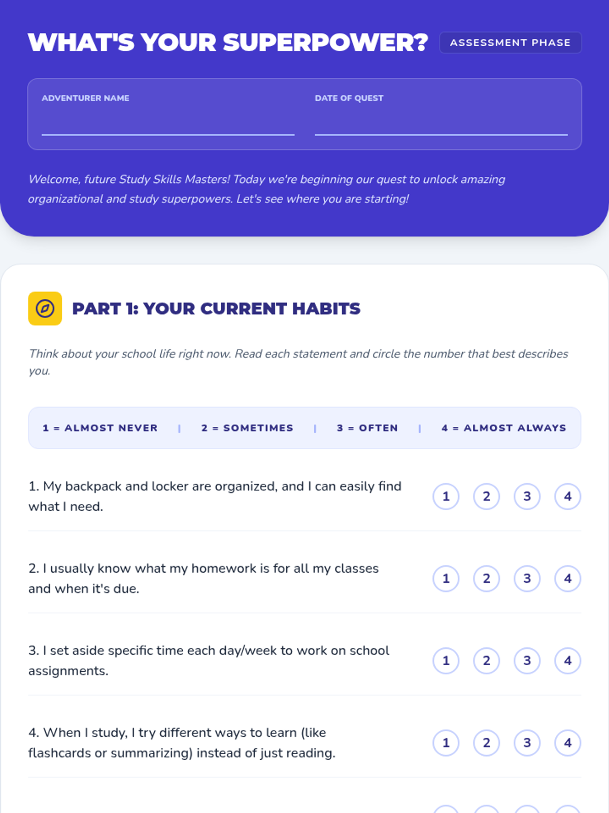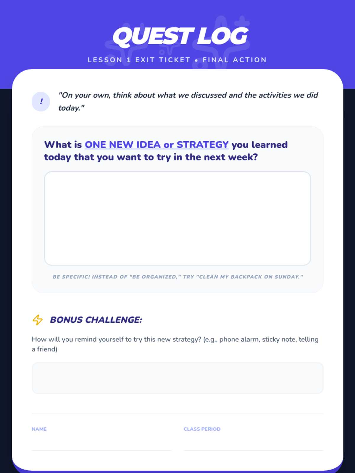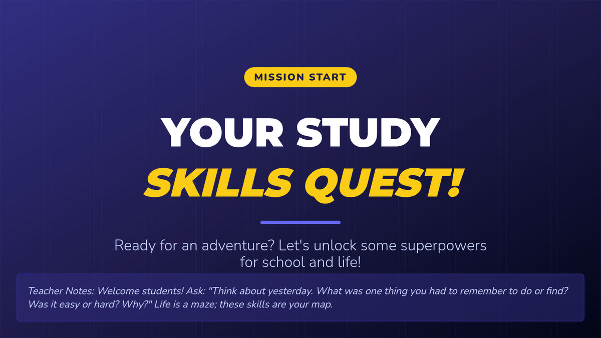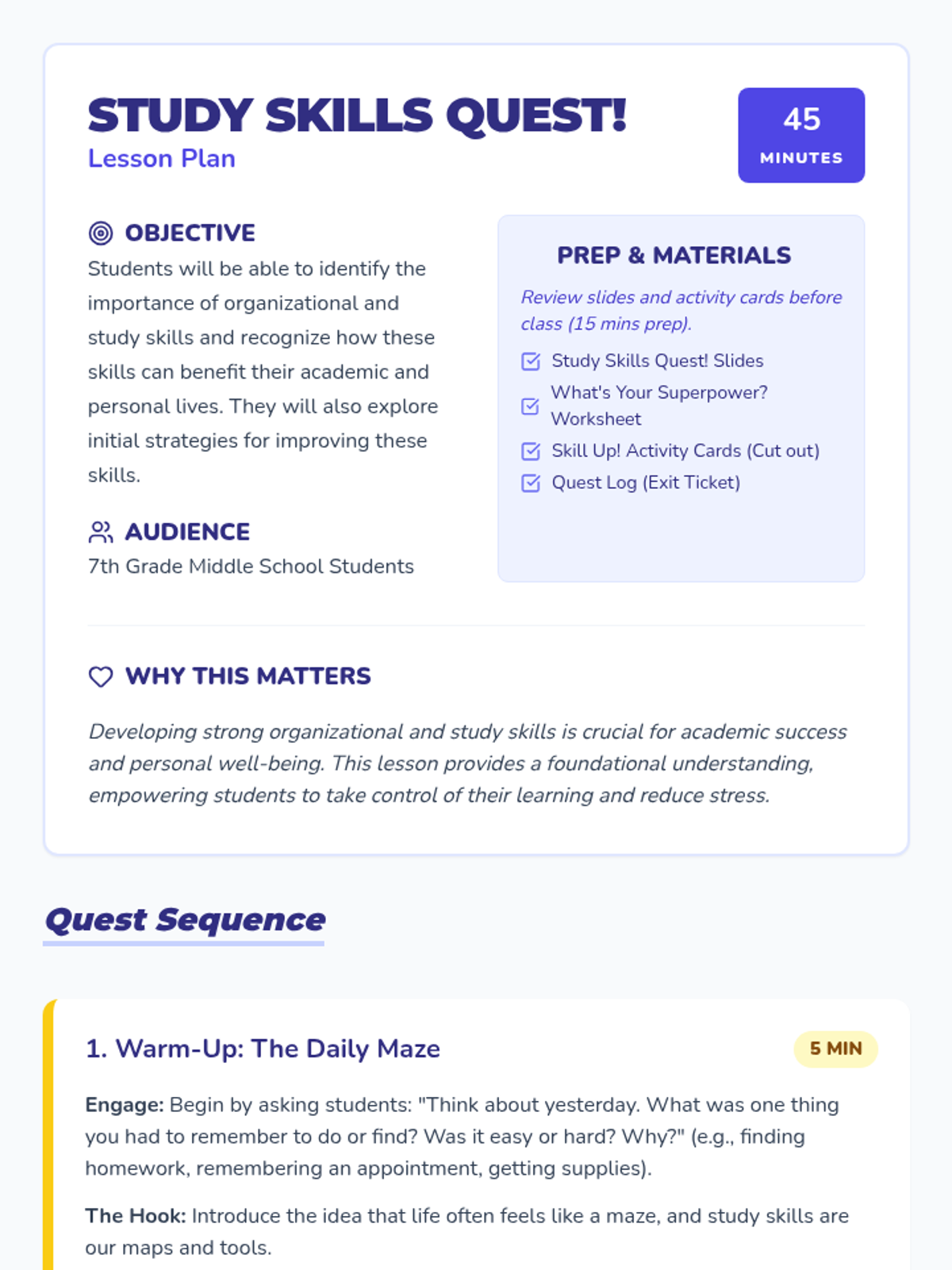 An introductory lesson for 7th graders to kick off their journey into essential organization and study habits using an adventure quest theme.